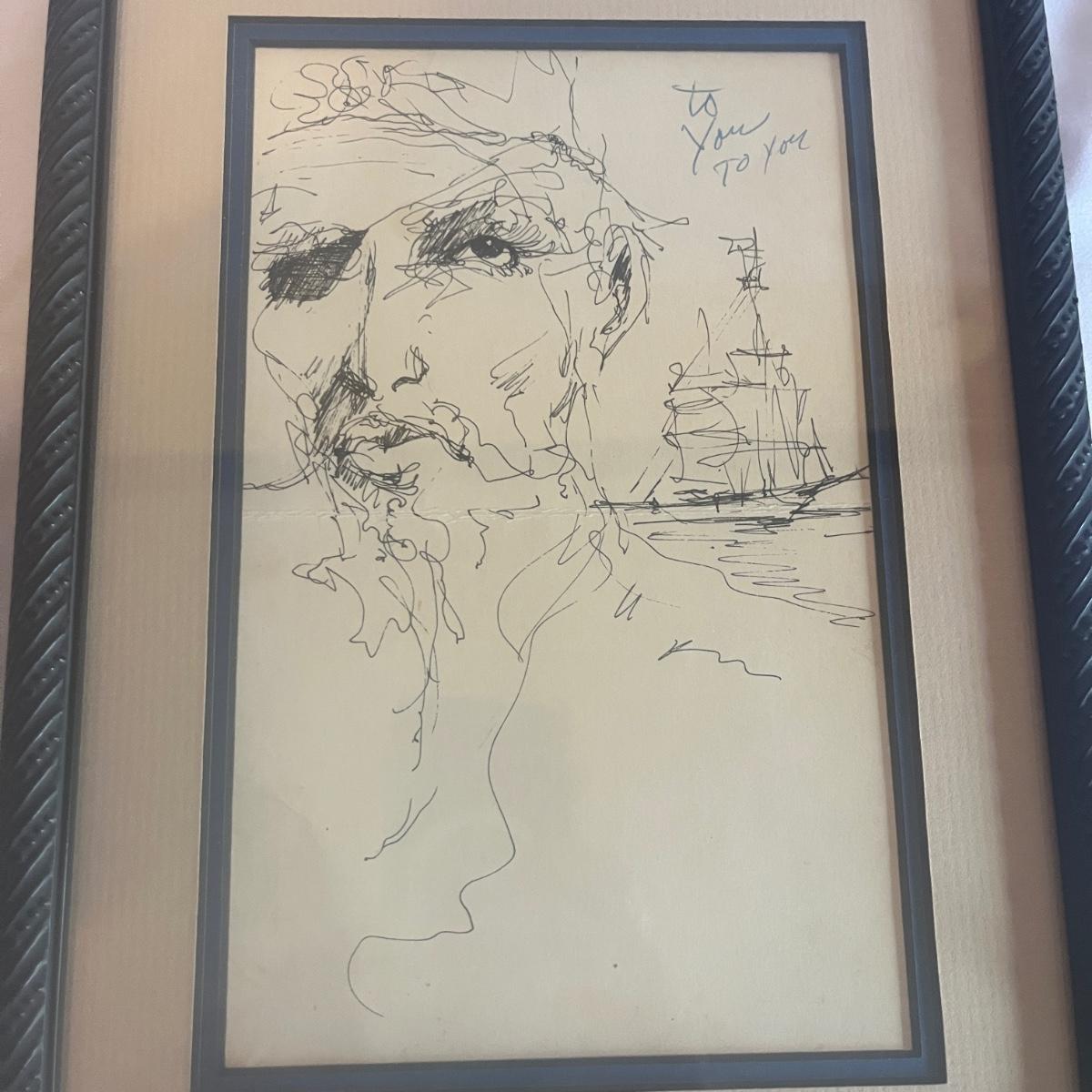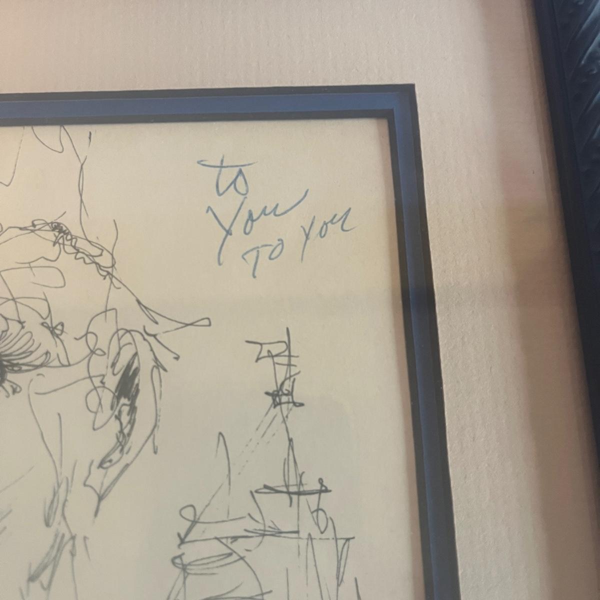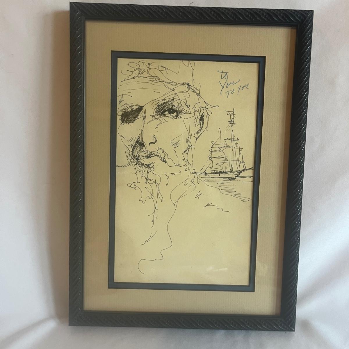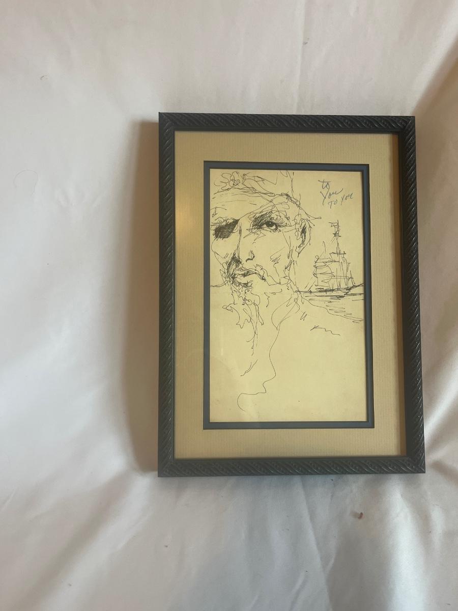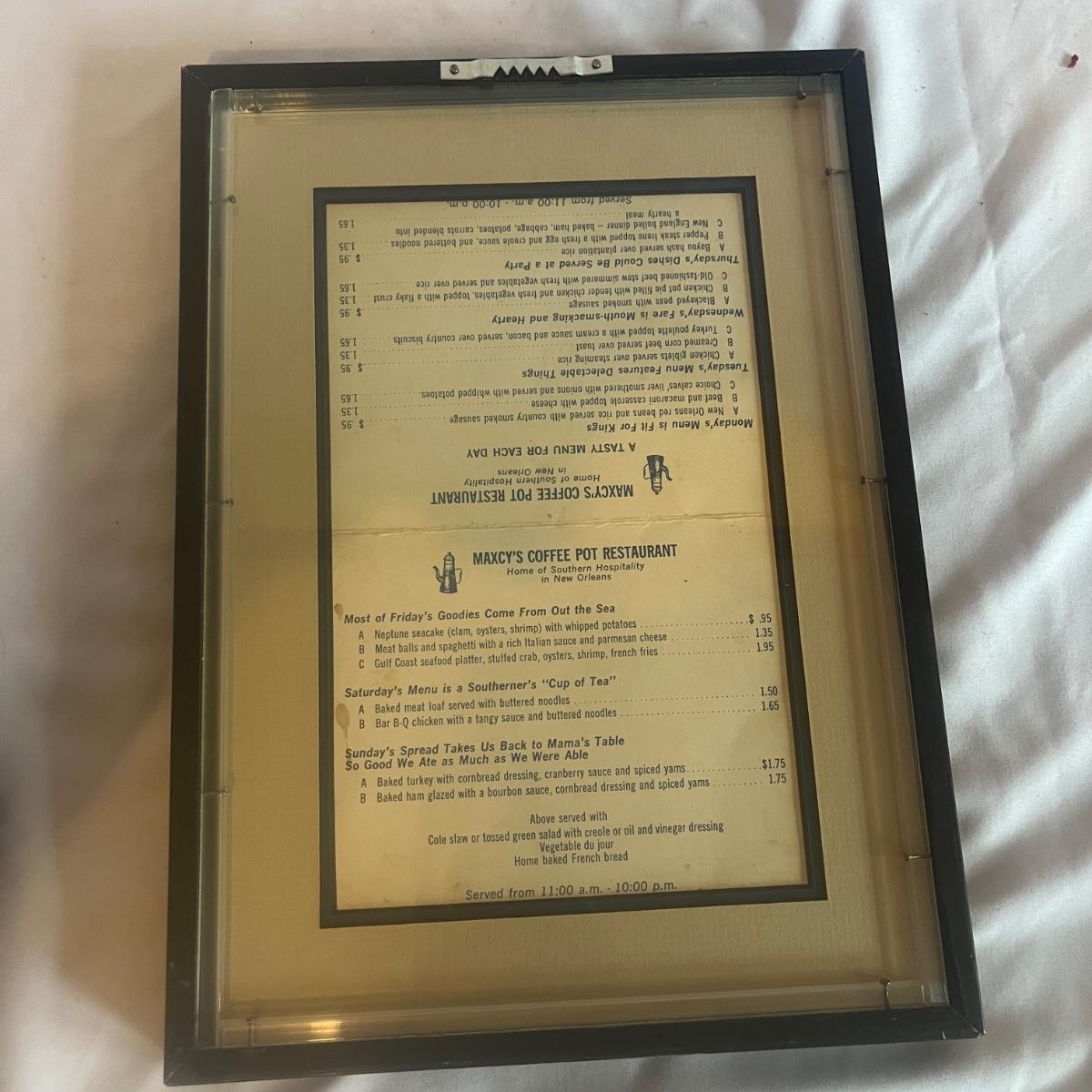 This unique drawing is on the back of the New Orleans Maxcy’s restaurant menu. It in is in a wooden frame and is under glass on both sides. Frame measures 8.5” x 13”H.