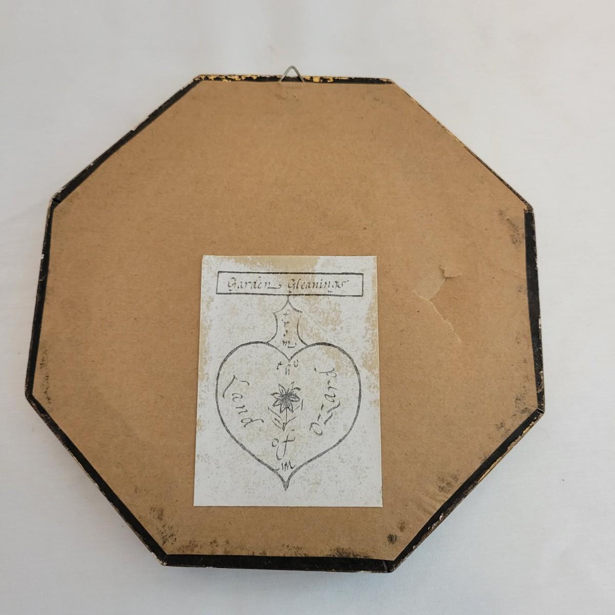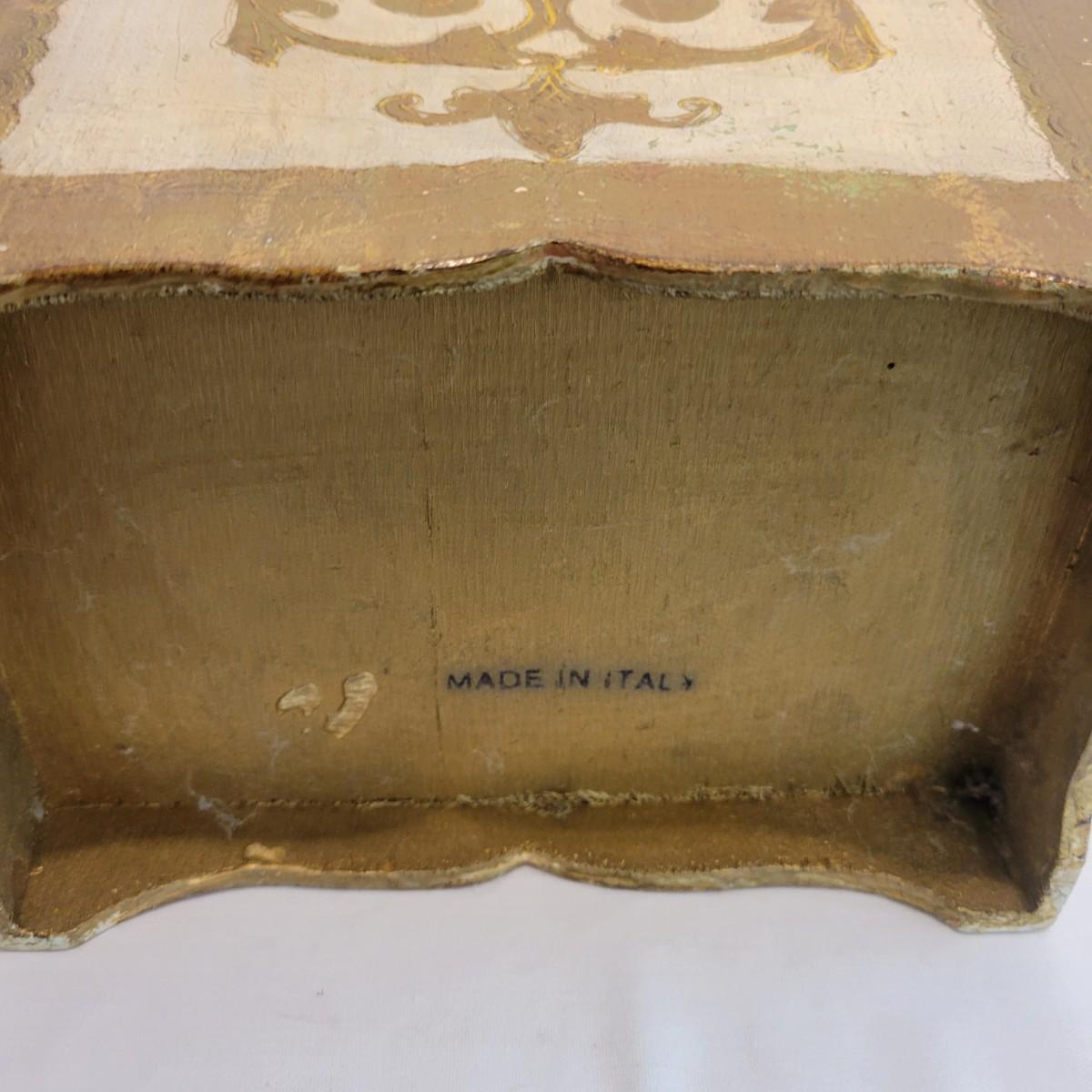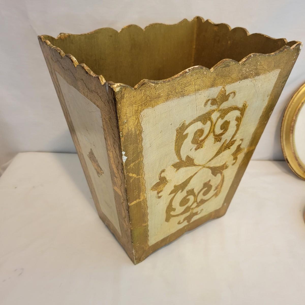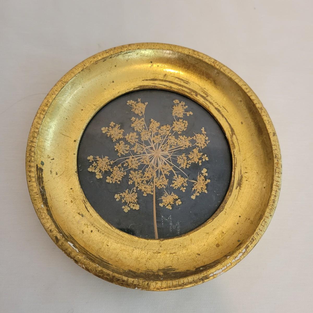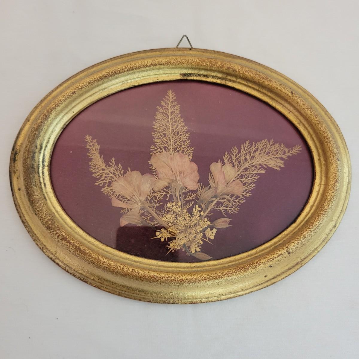 An assortment of four pieces in gold leaf frames. Three pieces are dried flowers and one appears to be an ink drawn violin. Also included is an Italian florentine waste bin with gold leaf stamped made in Italy and measures approximately 10" x 7.5" x 11 5"H. Shipping available