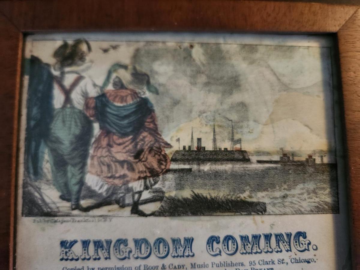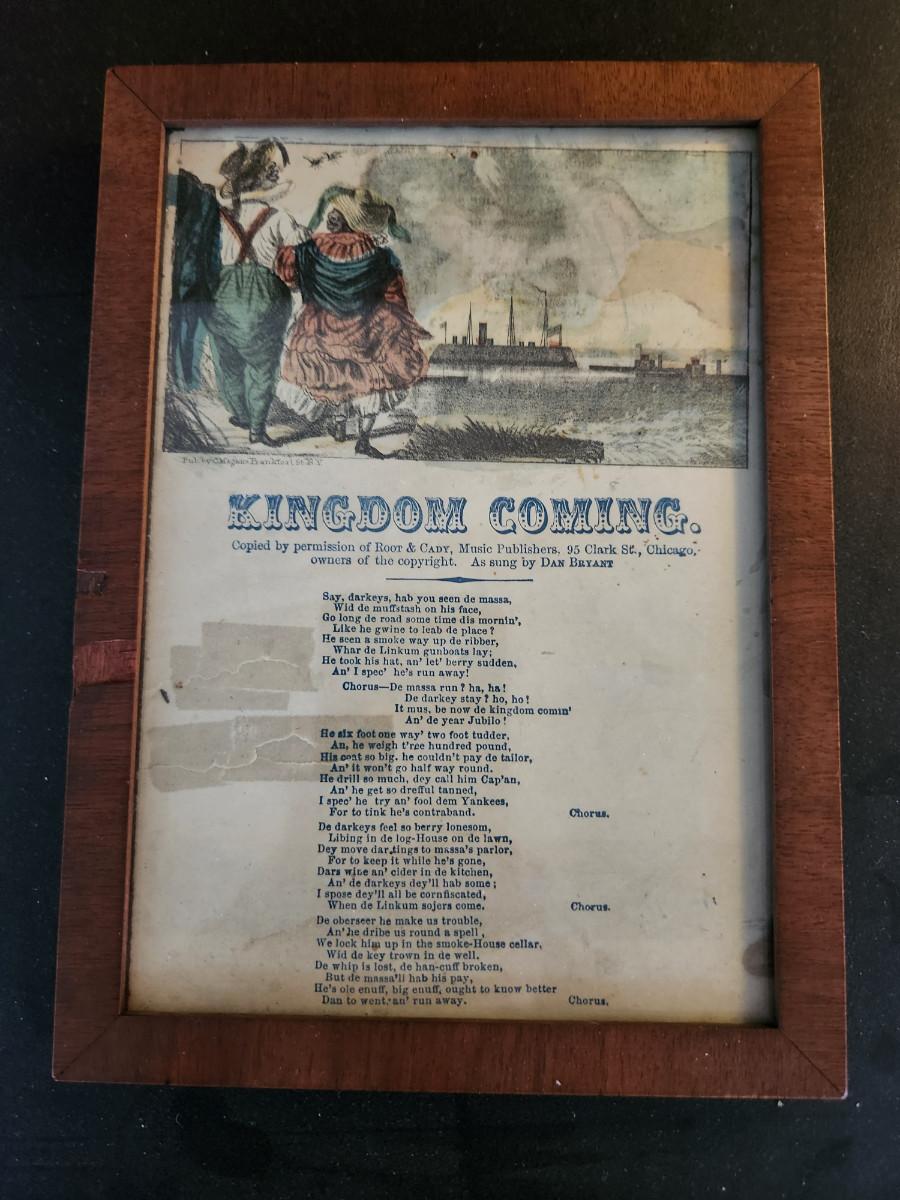 This auction lot is for a Framed Early Chromolithograph by Charles Magnus & Co. of New York circa 1854. of the lyrics of the song "Kingdom Coming". The print shows two folk people, apparently black enslaved or former enslaved persons of the South, standing on the shore looking out toward several Civil War period battleships – one displaying the Stars and Stripes. Condition is rough as someone taped on the verso over several crackings in the paper prior to framing. However, even with that said and noted, it is still an unusual find. Just the upper graphics are worth whatever is paid for this item. Julian Carl (Charles) Magnus (1826-1900) was born in Germany. He emigrated to New York in 1848. He and his publishing firm printed many views and maps, especially of American locations. He also produced letter sheets and song sheets. Magnus items usually sell at major auction houses for between $200 - $400, depending on subject matter and condition. You might get a good bargain here. Bid High.
