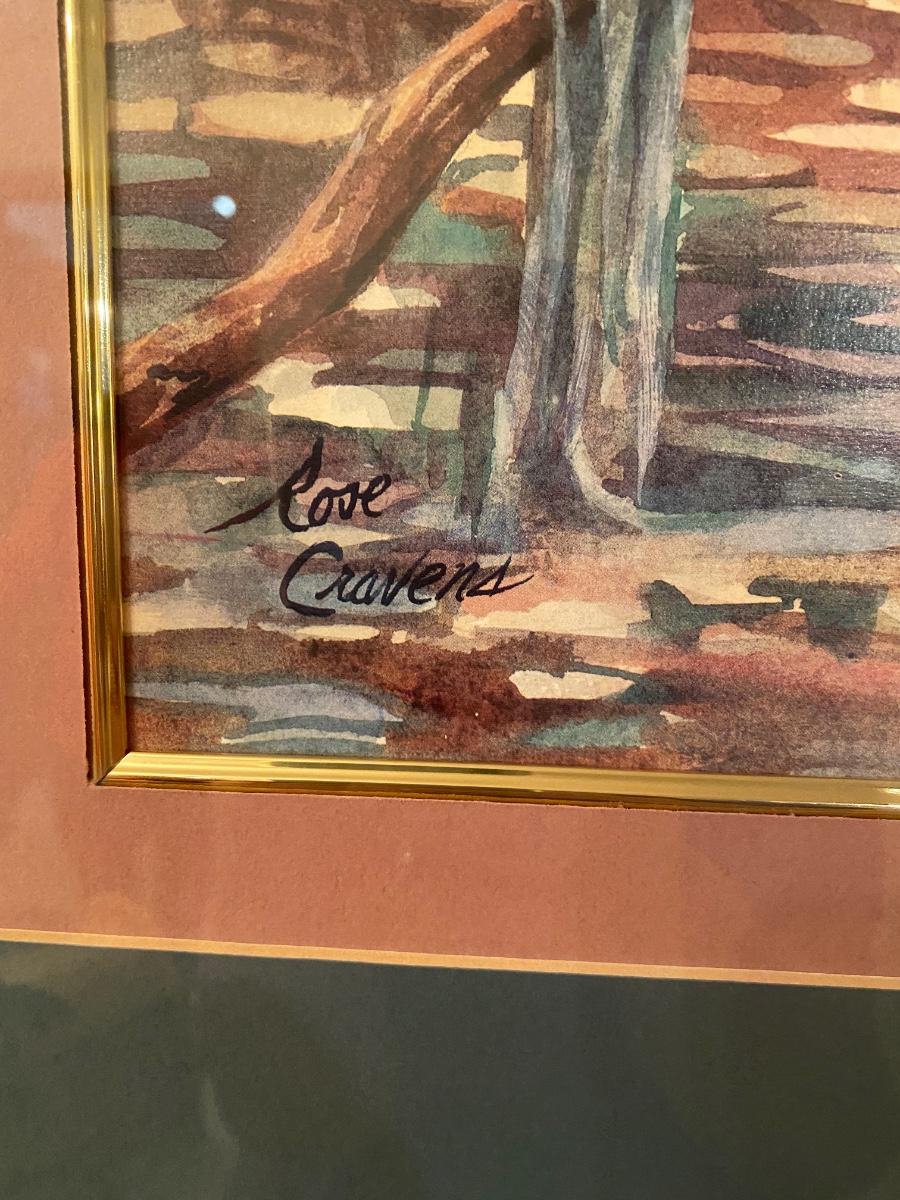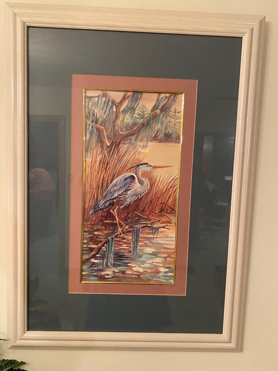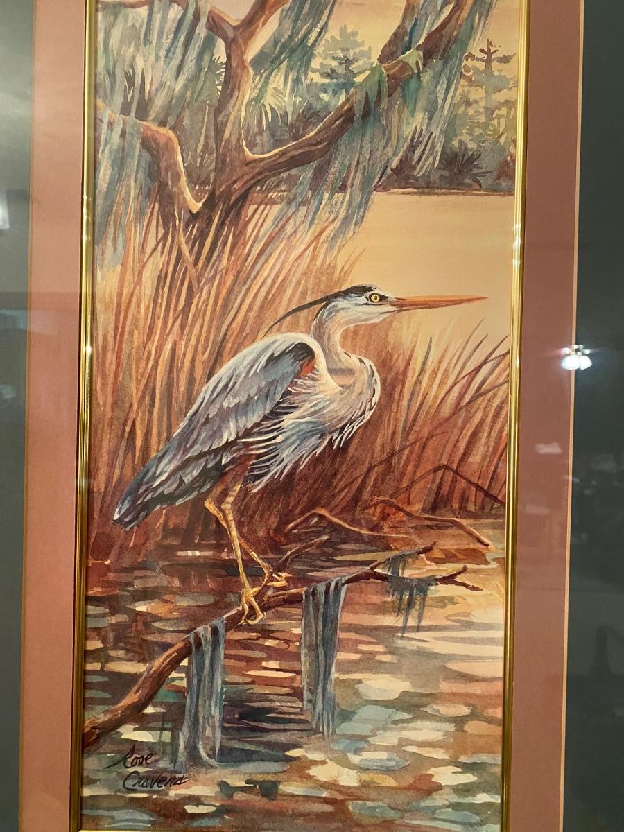 Framed egret print by Rose Cravens. Approx 23”w x 32”h. Very good condition