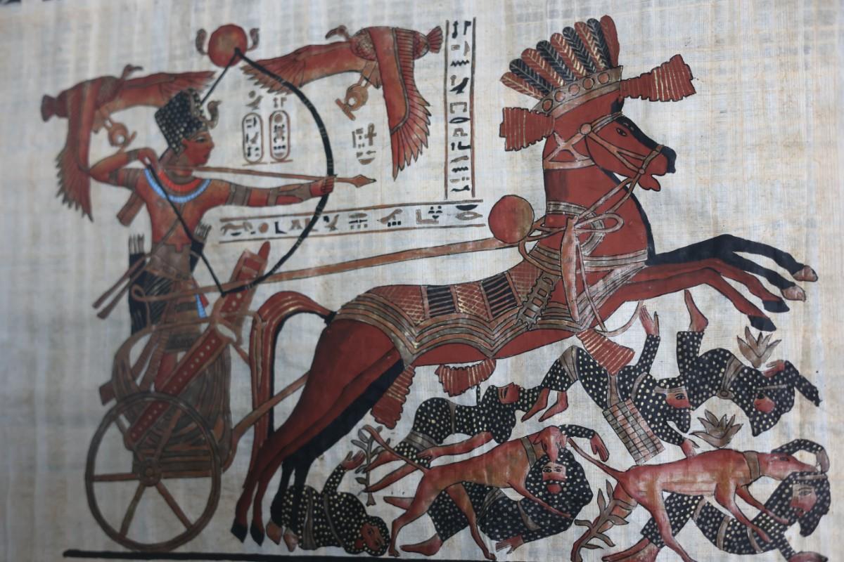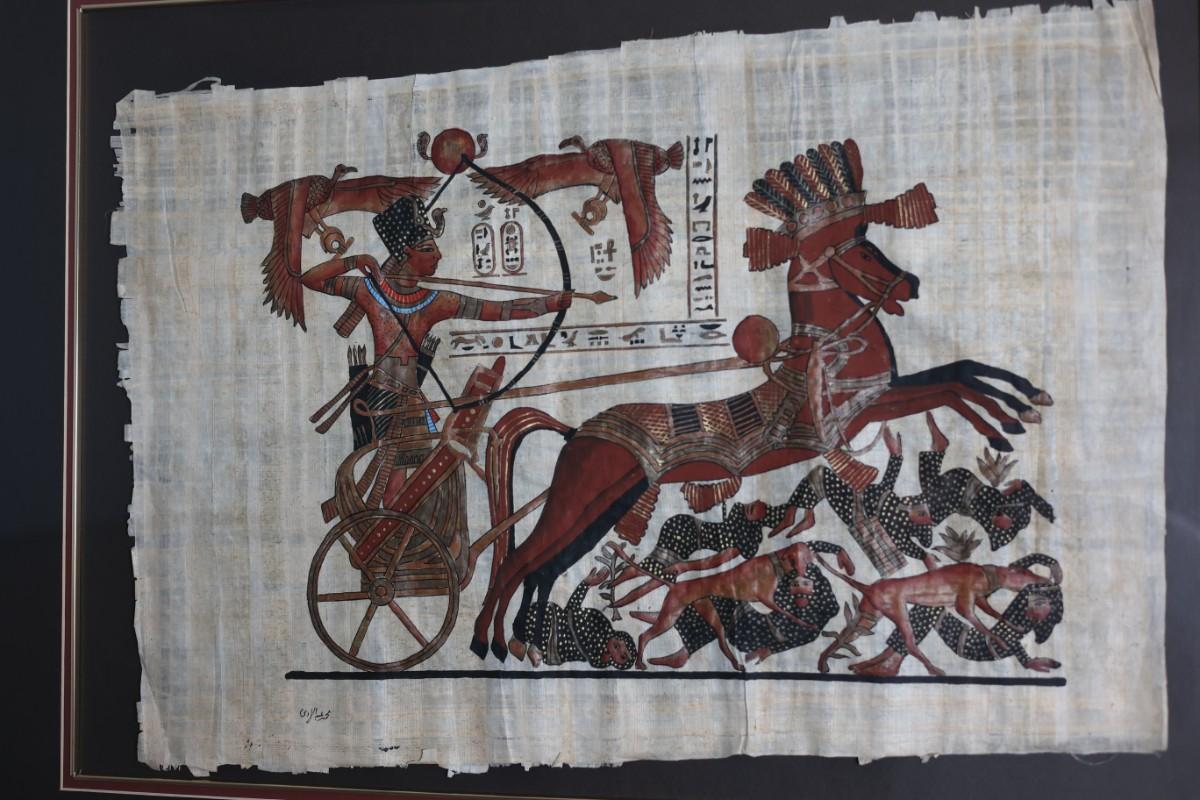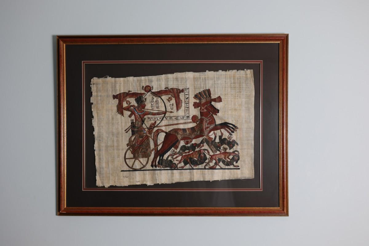 Framed papyrus artwork depicting an Egyptian-style chariot scene with figures and hieroglyphic motifs. Decorative piece presented in a wood frame with matting. See photos for details and condition.