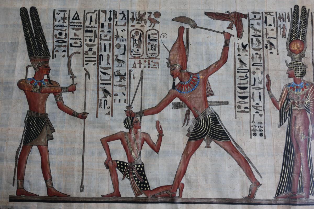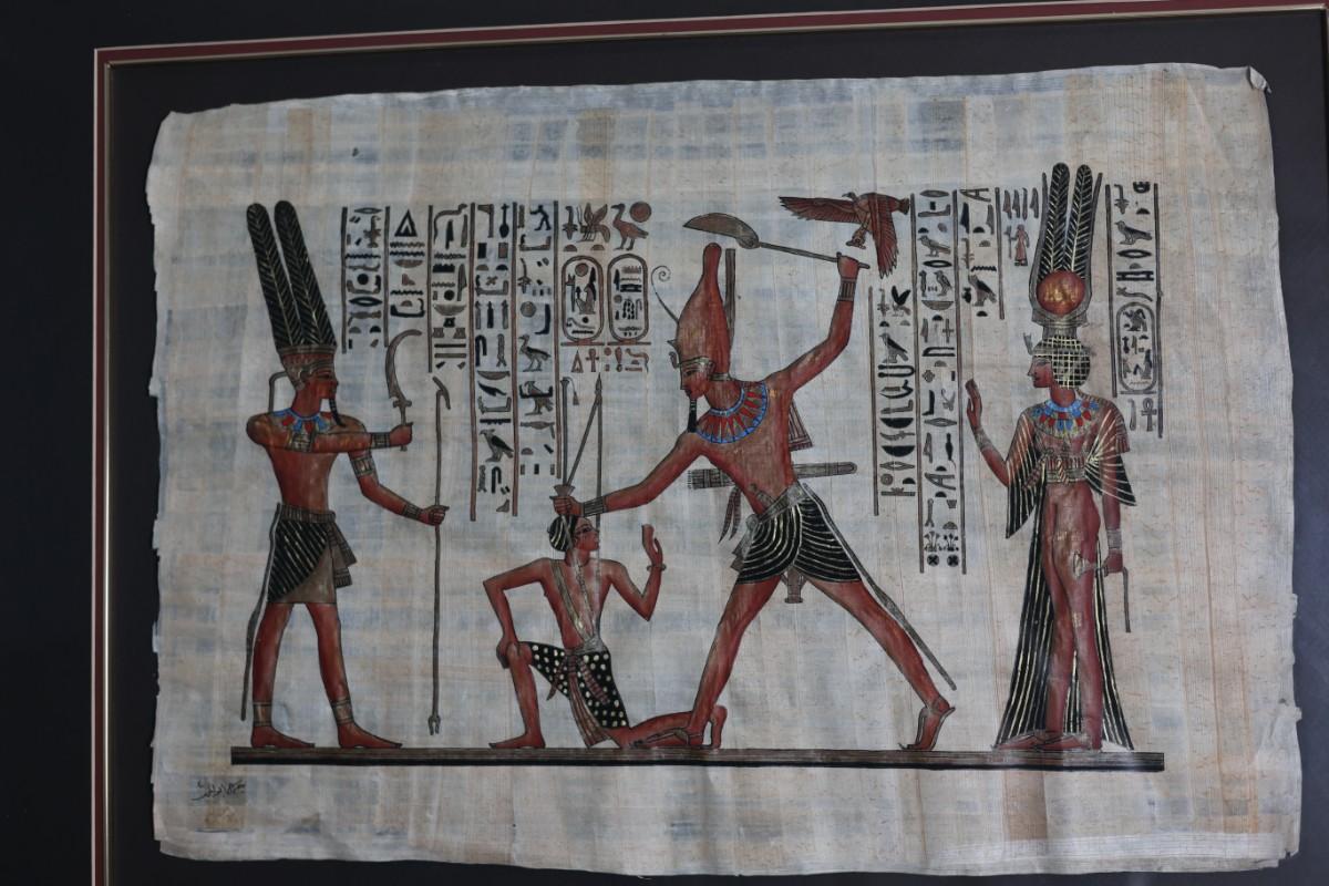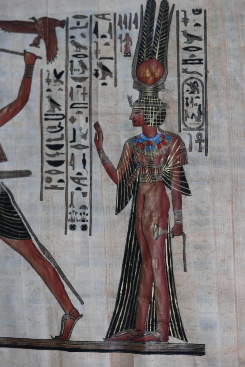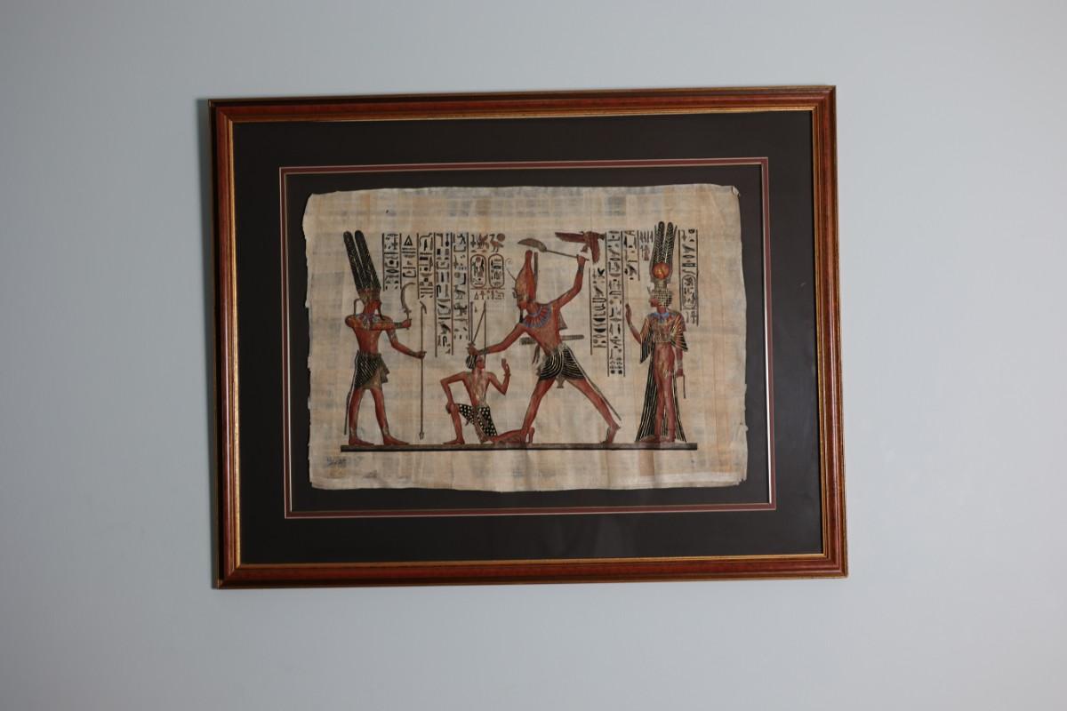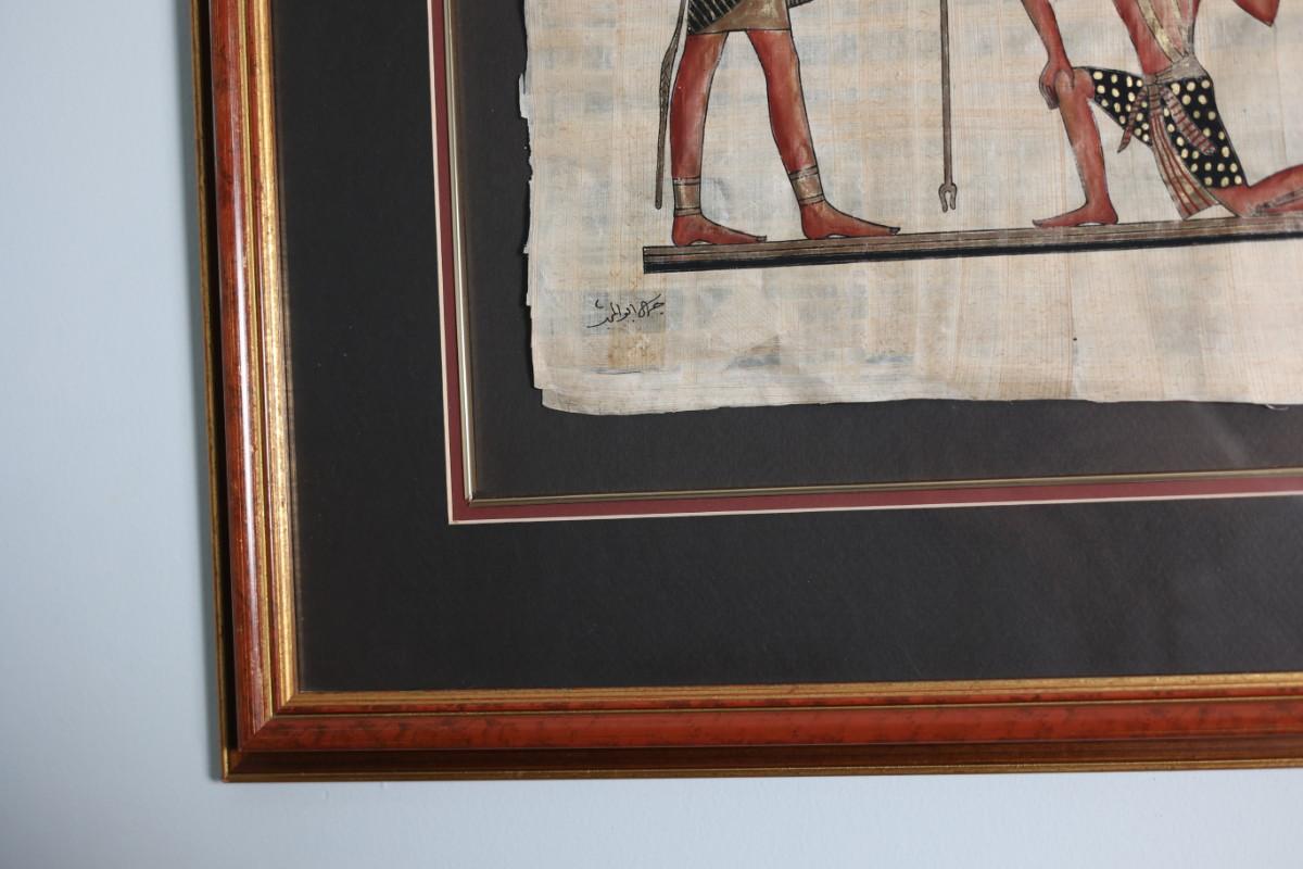 Framed papyrus artwork depicting an Egyptian-style scene with figures and hieroglyphic motifs. Signed in the lower corner (signature not identified). Decorative piece presented with mat and wood frame.