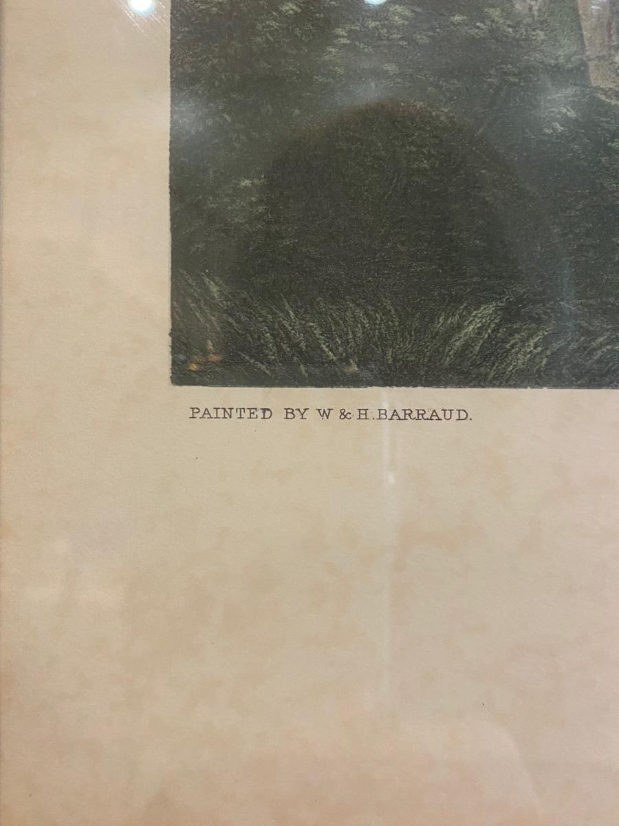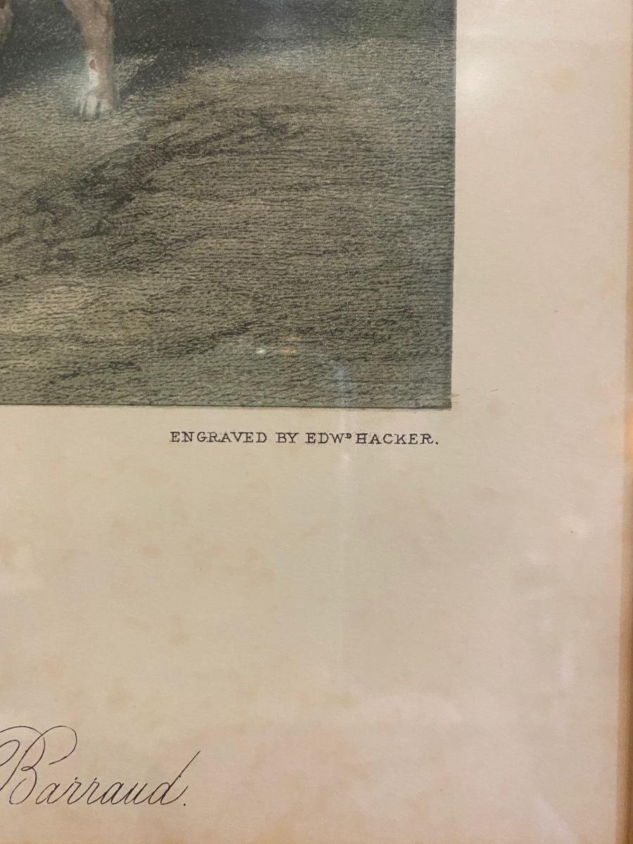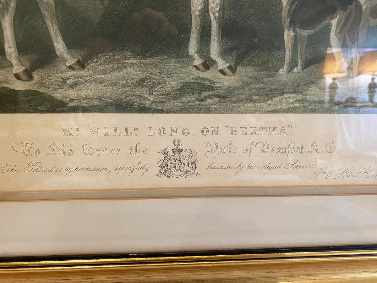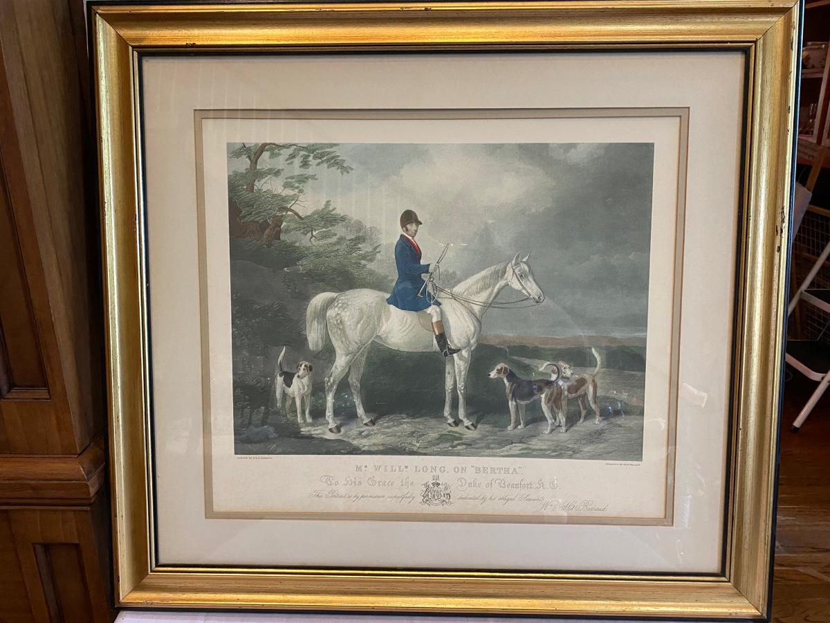 Hand colored engraved equestrian framed print “Mr. Will Long on Bertha”. Painted by W & H Barraud, engraved by Edw. Hacker. Original price was $150. 31h x 28-1/2”w. Some scuffs on frame
