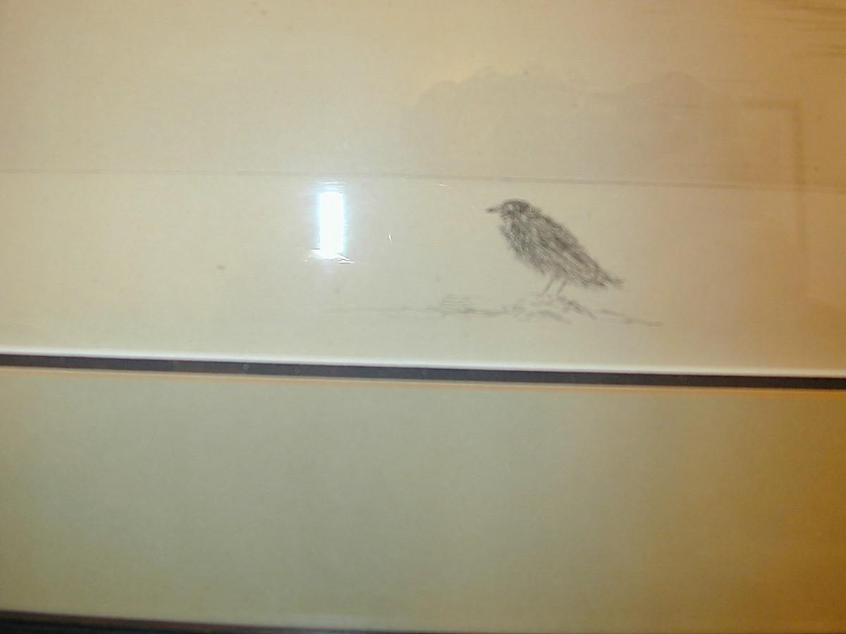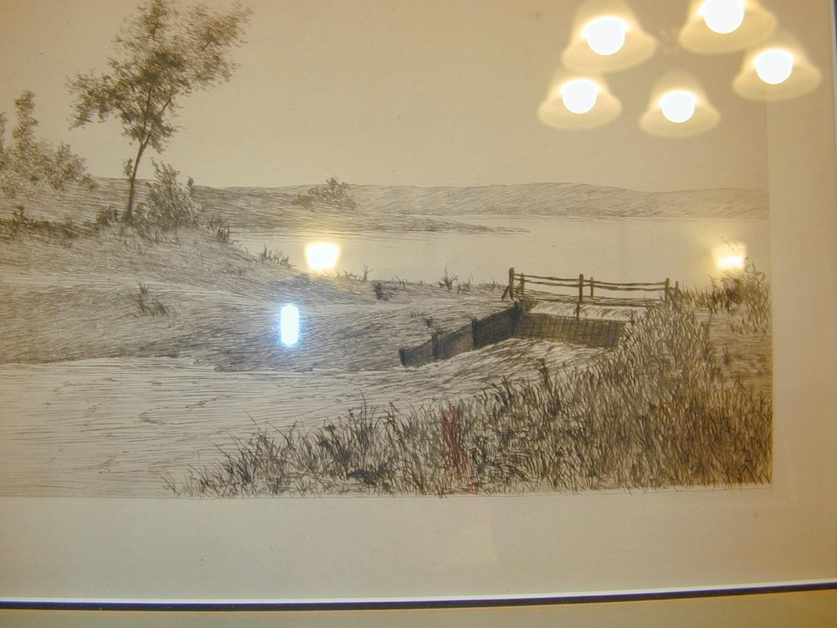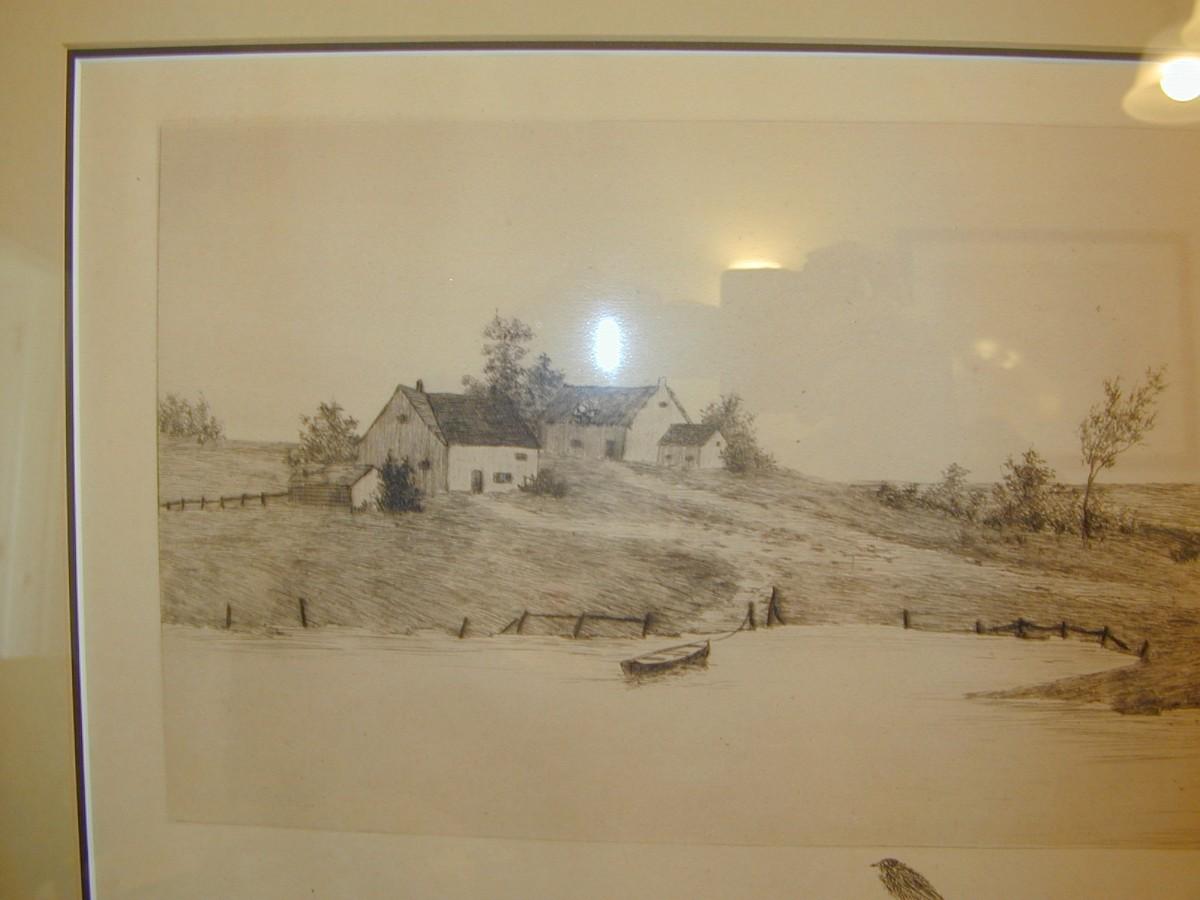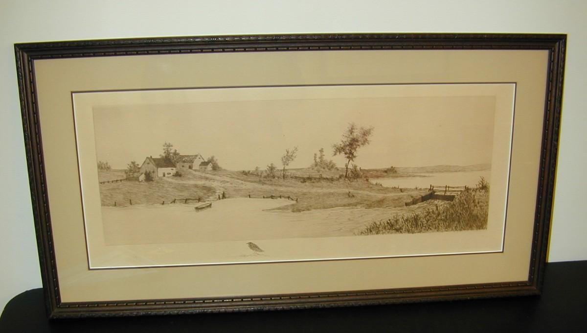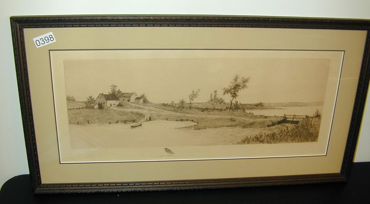Framed Etching Country Scene Side Boat Barns With Bird Remarque Lot 398