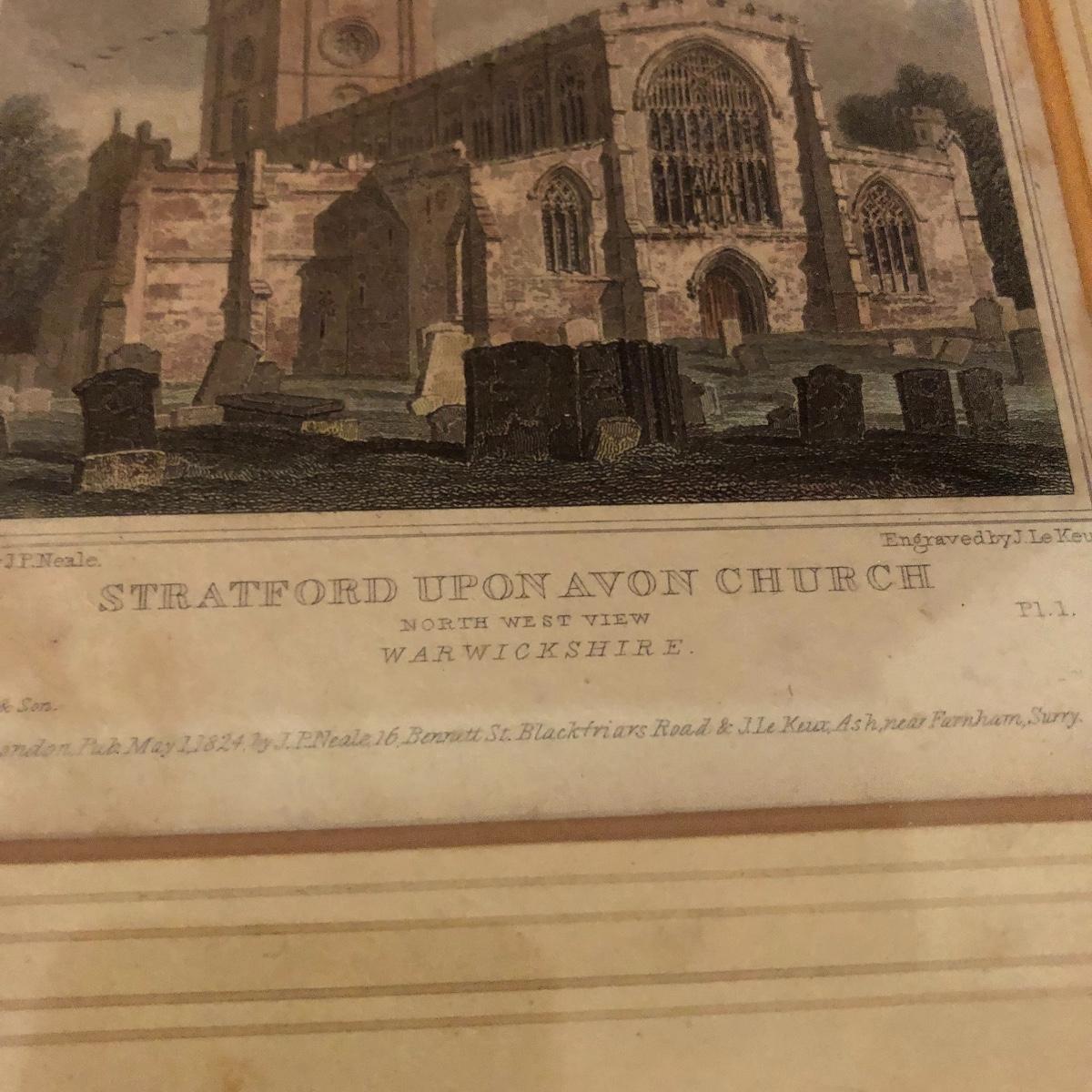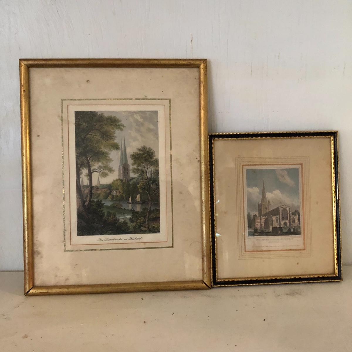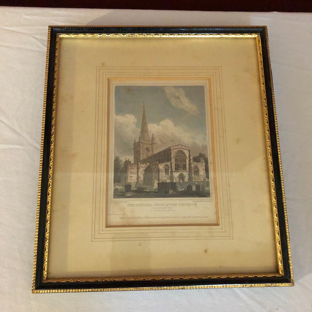 Lot includes one framed and matted print of Stratford upon Avon Church and one framed and matted print of the Cathedral in Lübeck. Largest frame measures 12” x 15”. Smaller piece has some stains on matting and lower section of print, see pictures.