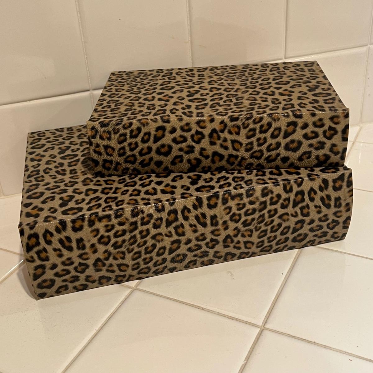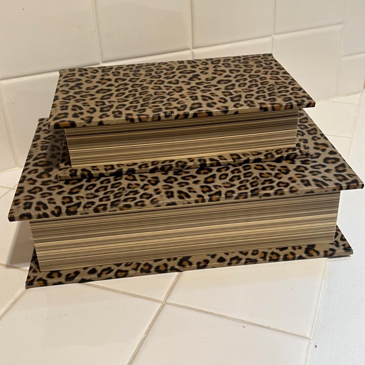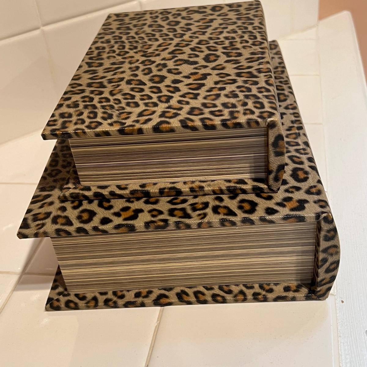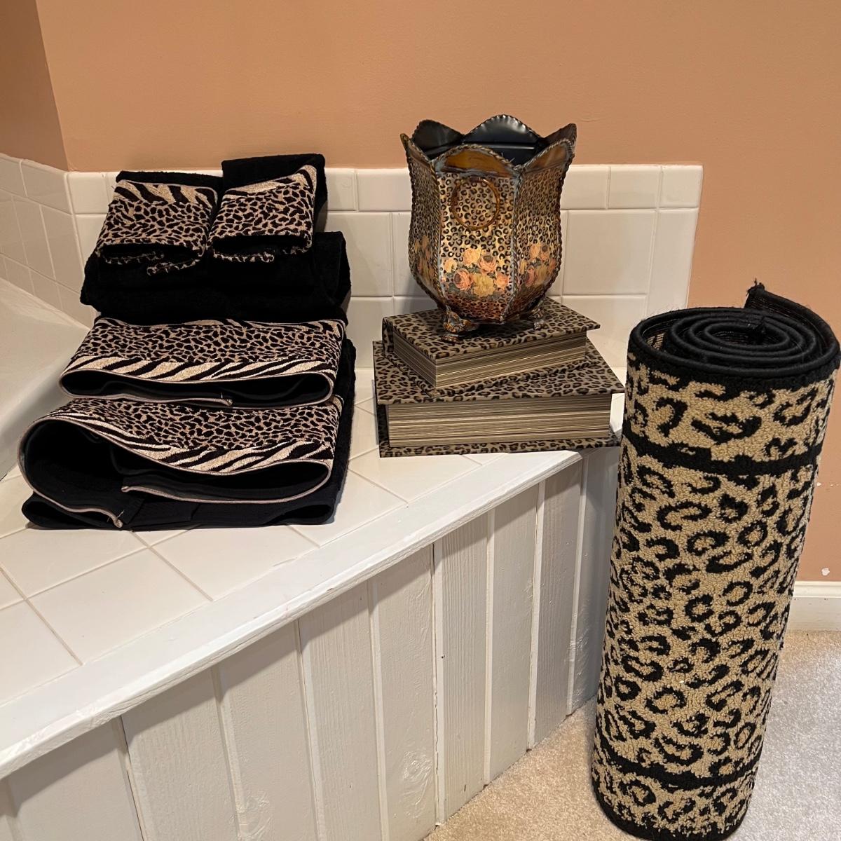 Bathroom leopard decor includes two large bath towels and two hand towels as well as a 59” x 23.5” leopard print carpet. The collection also has two storage boxes (designed to look like books) the largest is 10” x 7” x 3”H. The small metal decorative trash can is 7”D x 8”.