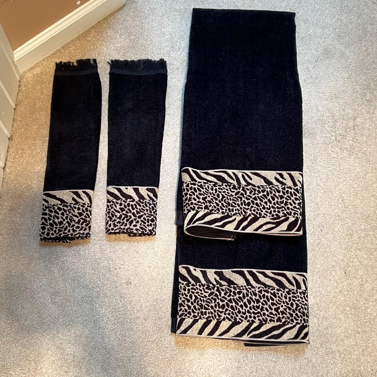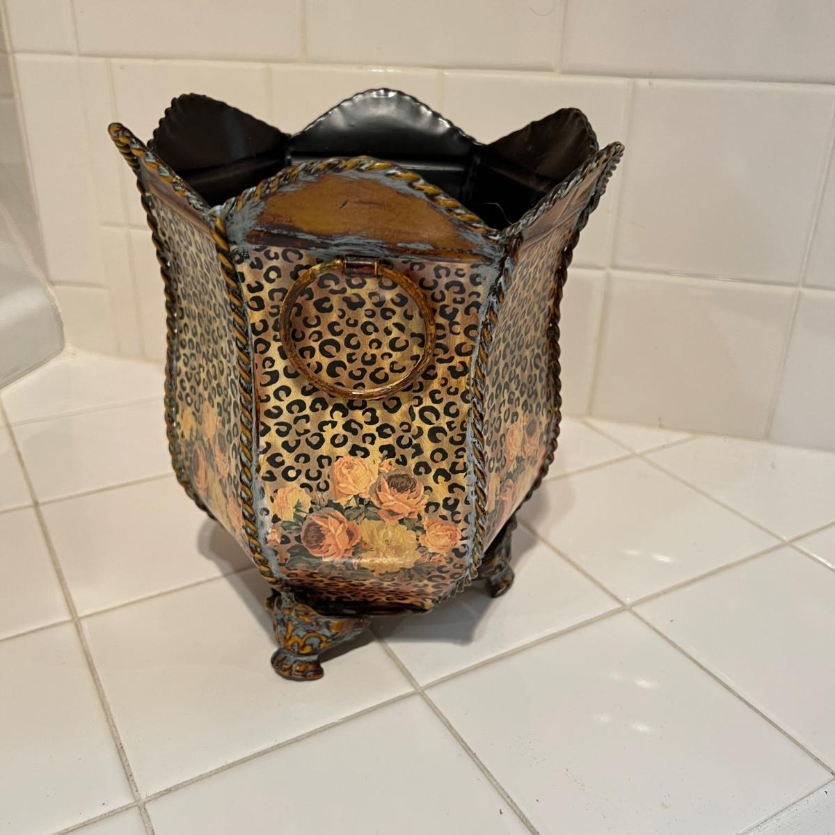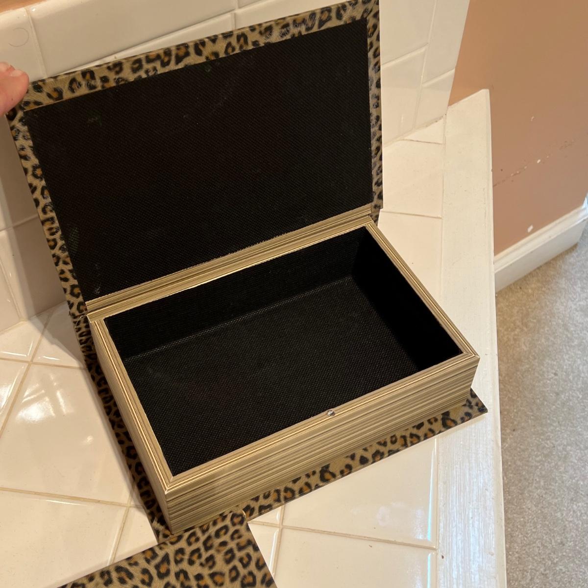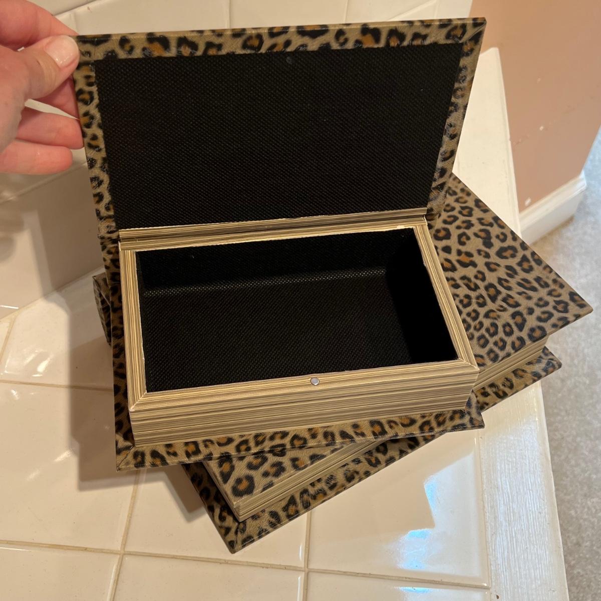 Bathroom leopard decor includes two large bath towels and two hand towels as well as a 59” x 23.5” leopard print carpet. The collection also has two storage boxes (designed to look like books) the largest is 10” x 7” x 3”H. The small metal decorative trash can is 7”D x 8”.