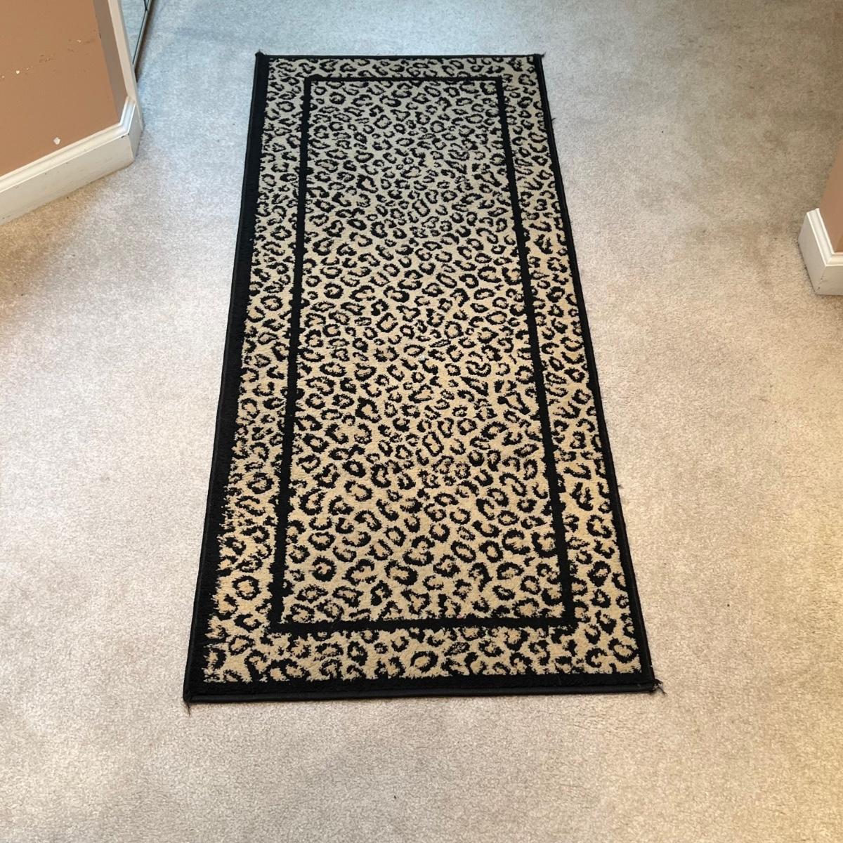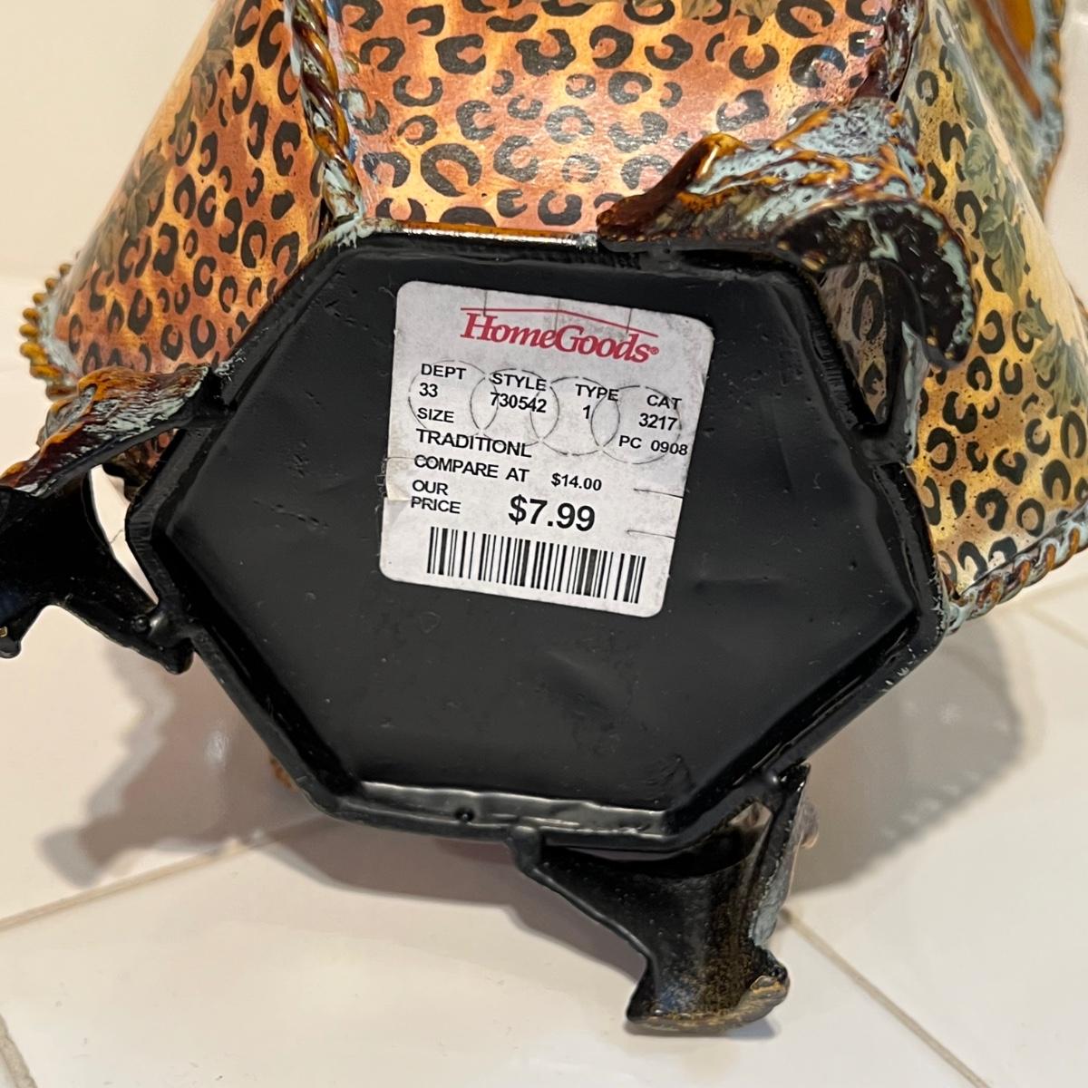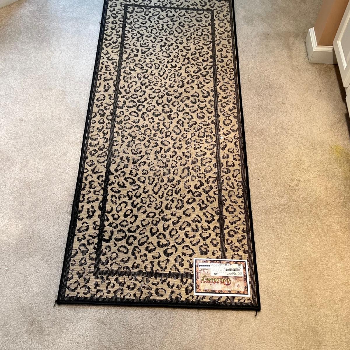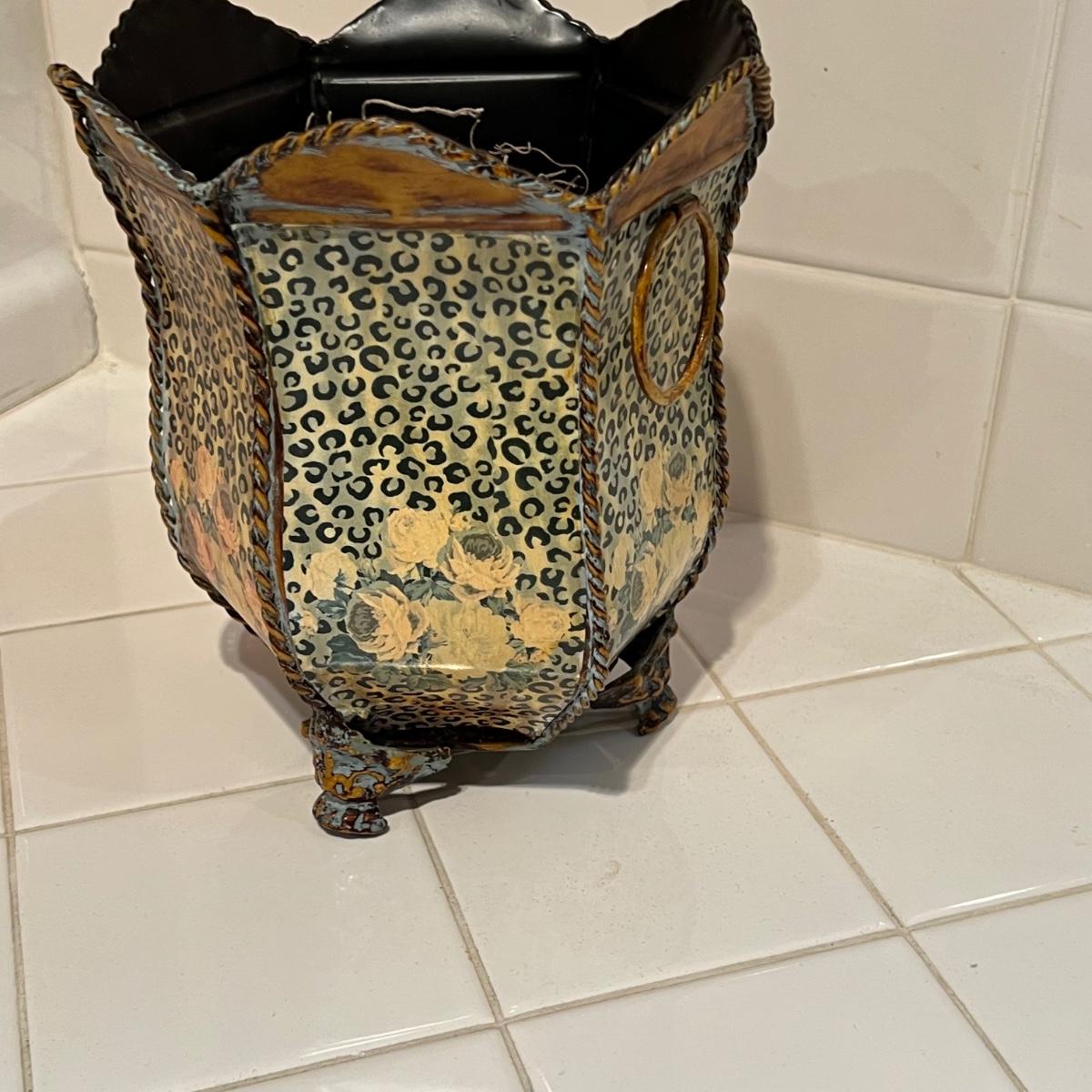 Bathroom leopard decor includes two large bath towels and two hand towels as well as a 59” x 23.5” leopard print carpet. The collection also has two storage boxes (designed to look like books) the largest is 10” x 7” x 3”H. The small metal decorative trash can is 7”D x 8”.