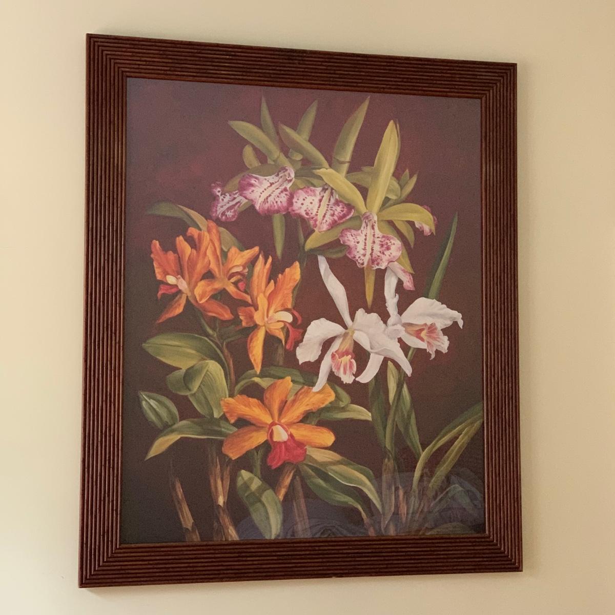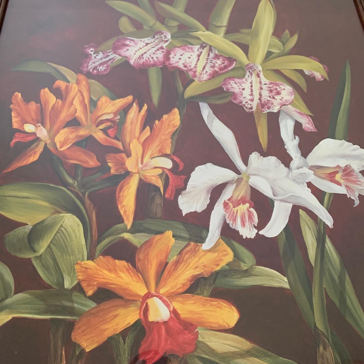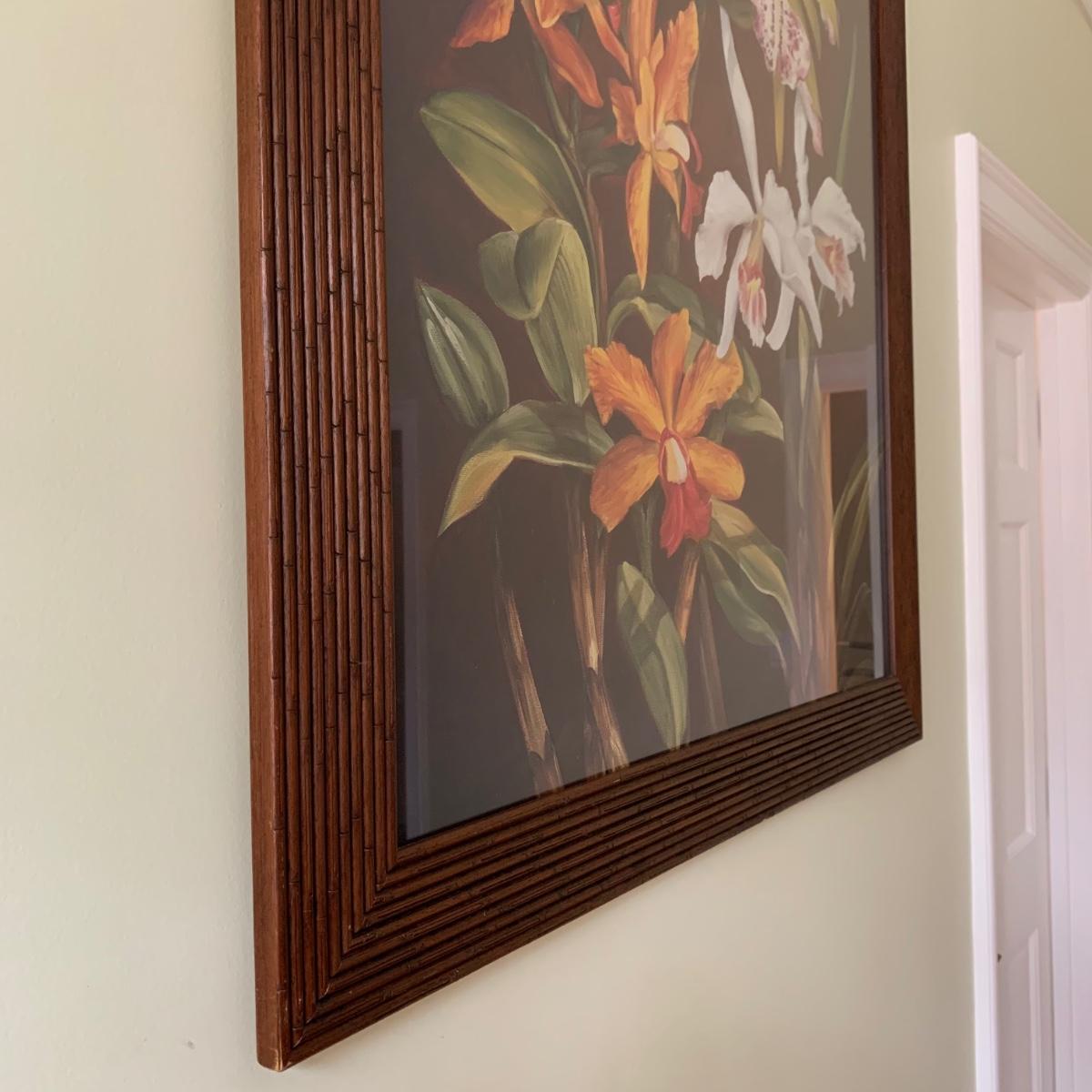 Large framed vibrant fine art print titled Orchid Trio II. An internet search indicates that the artist of the original artwork is possibly Rodolfo Jimenez. Print is numbered 308z Frame is wood carved to look like bamboo. Frame measures 38.25” x 45.25”. The print is behind glass.
