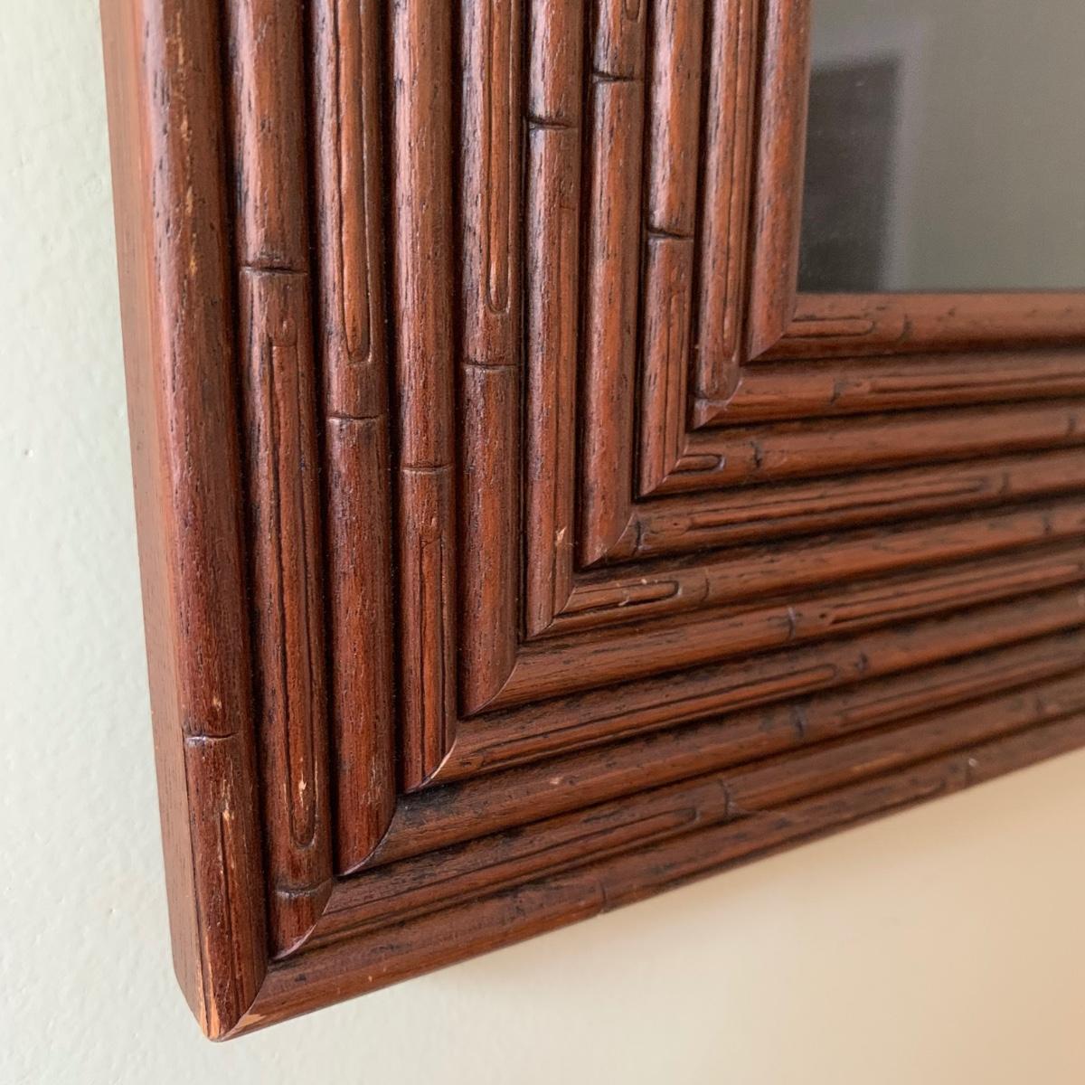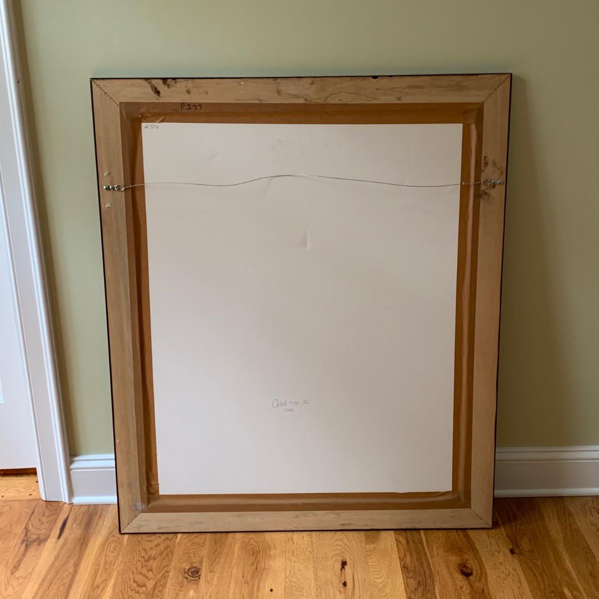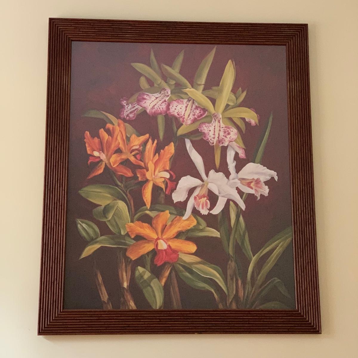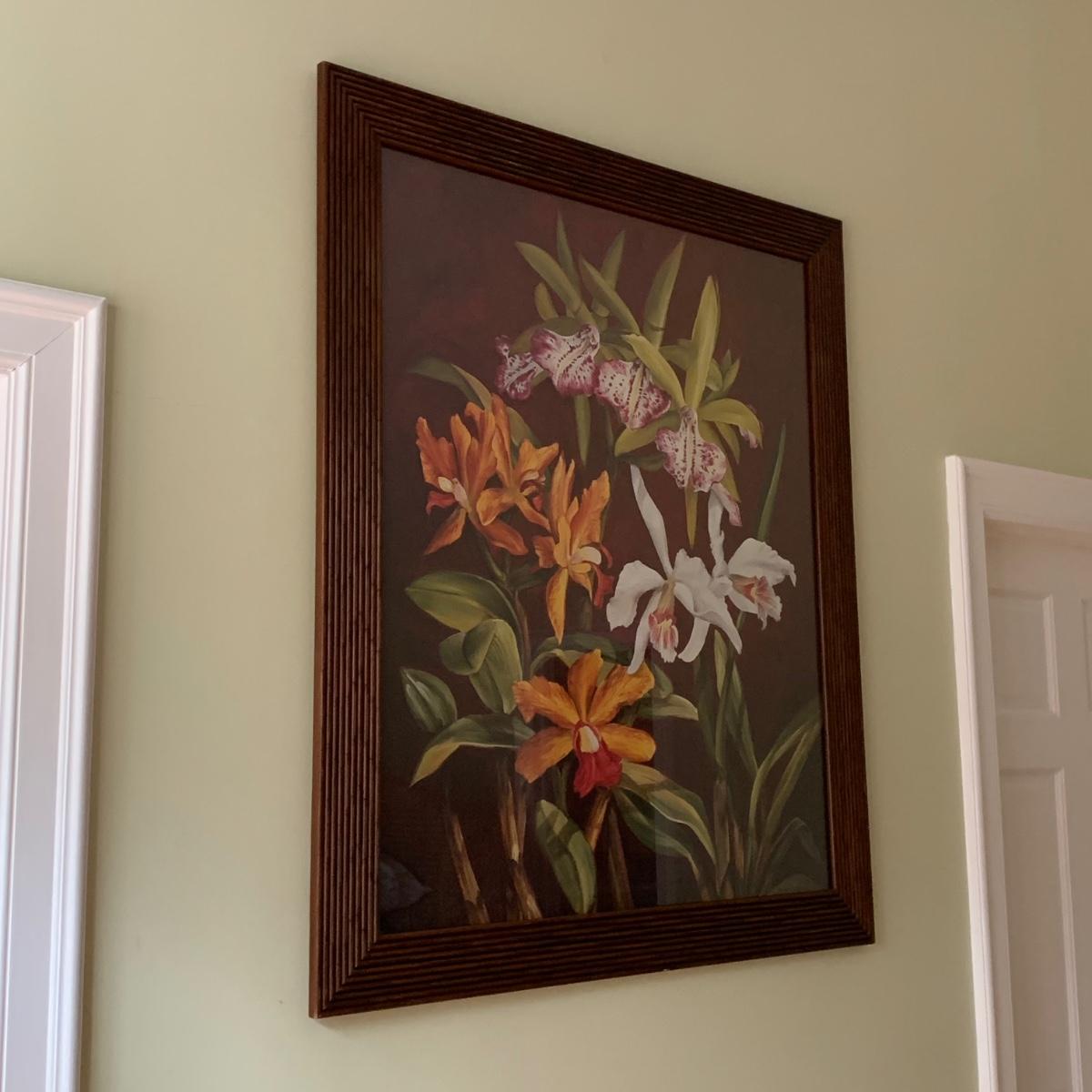 Large framed vibrant fine art print titled Orchid Trio II. An internet search indicates that the artist of the original artwork is possibly Rodolfo Jimenez. Print is numbered 308z Frame is wood carved to look like bamboo. Frame measures 38.25” x 45.25”. The print is behind glass.