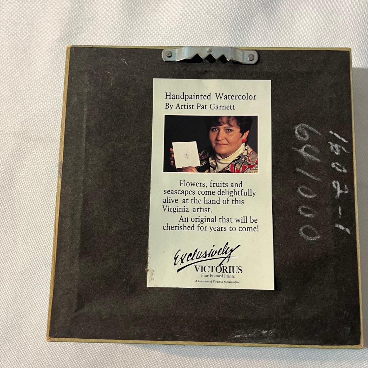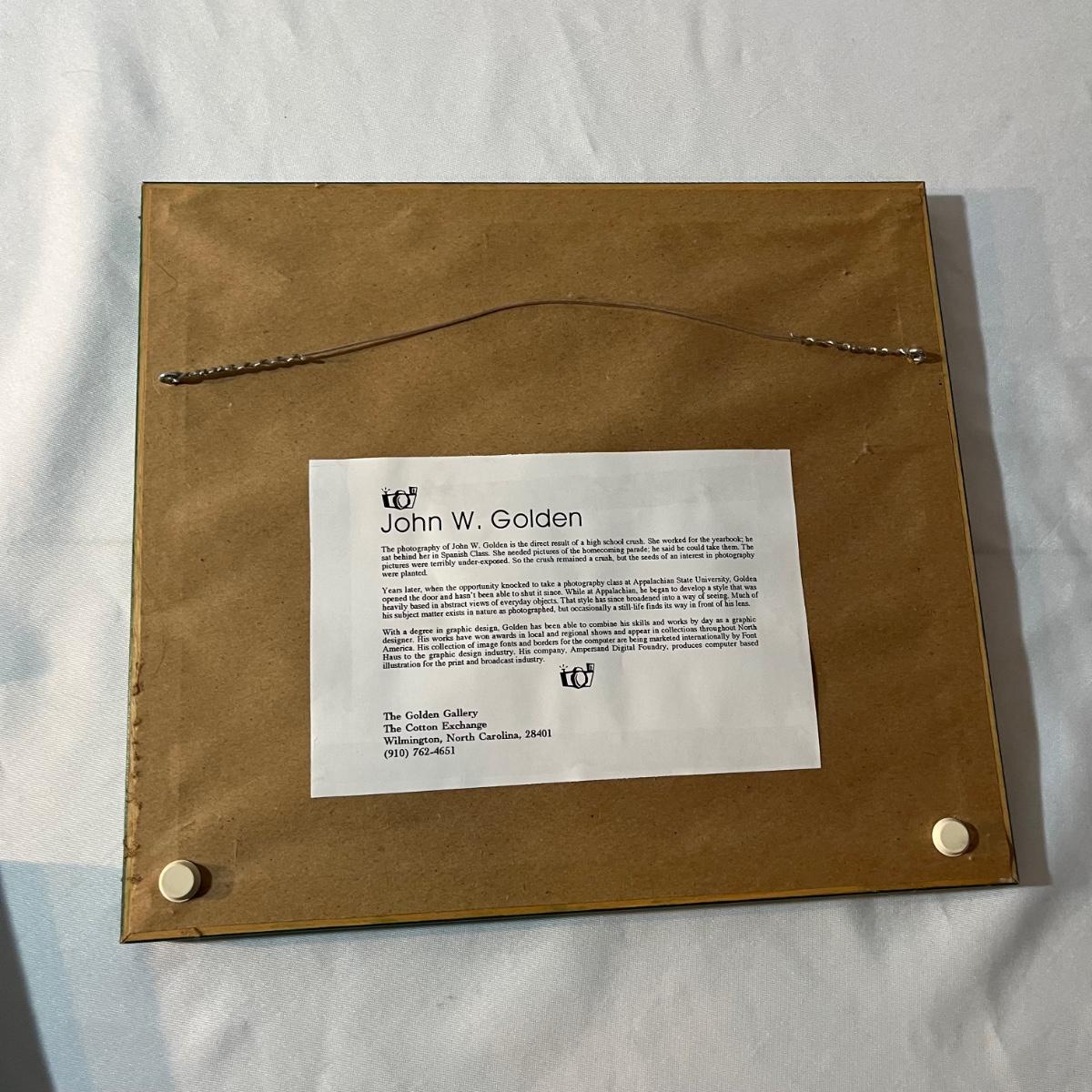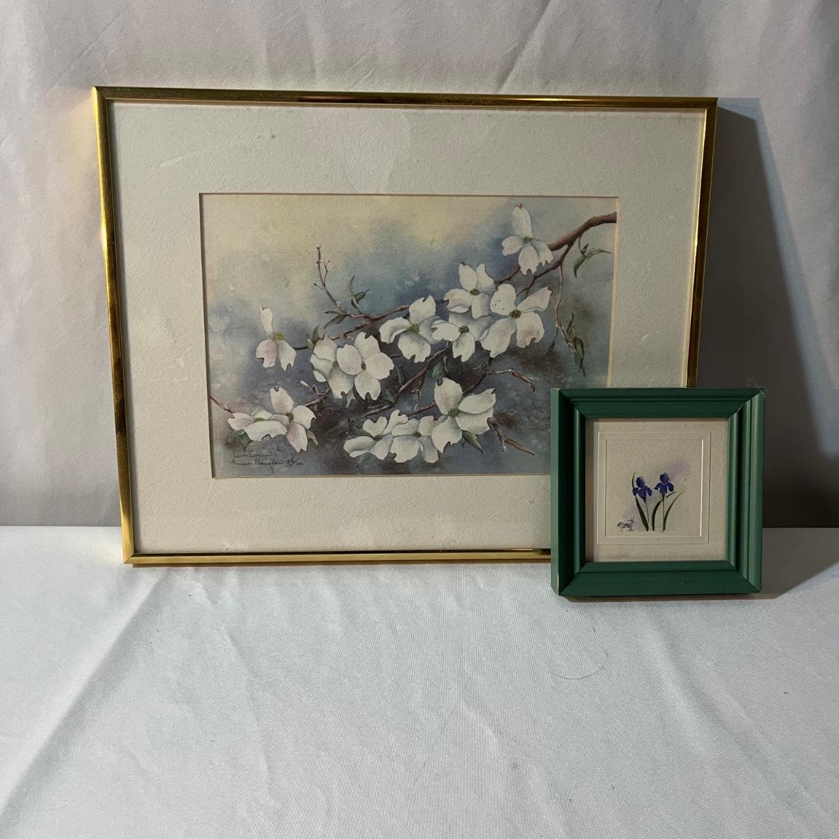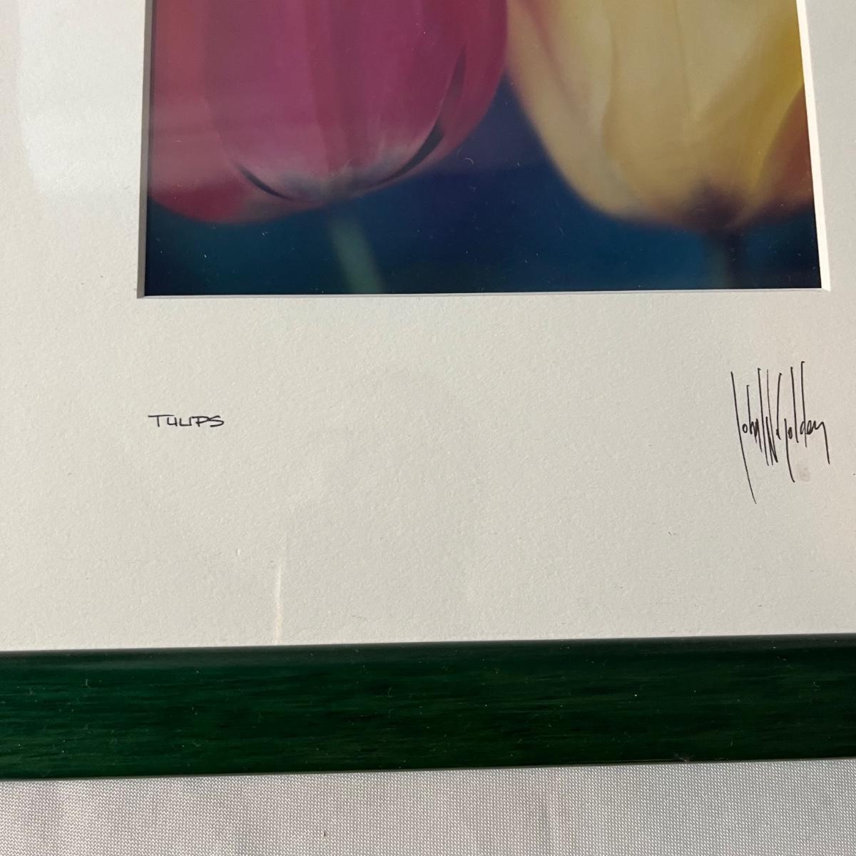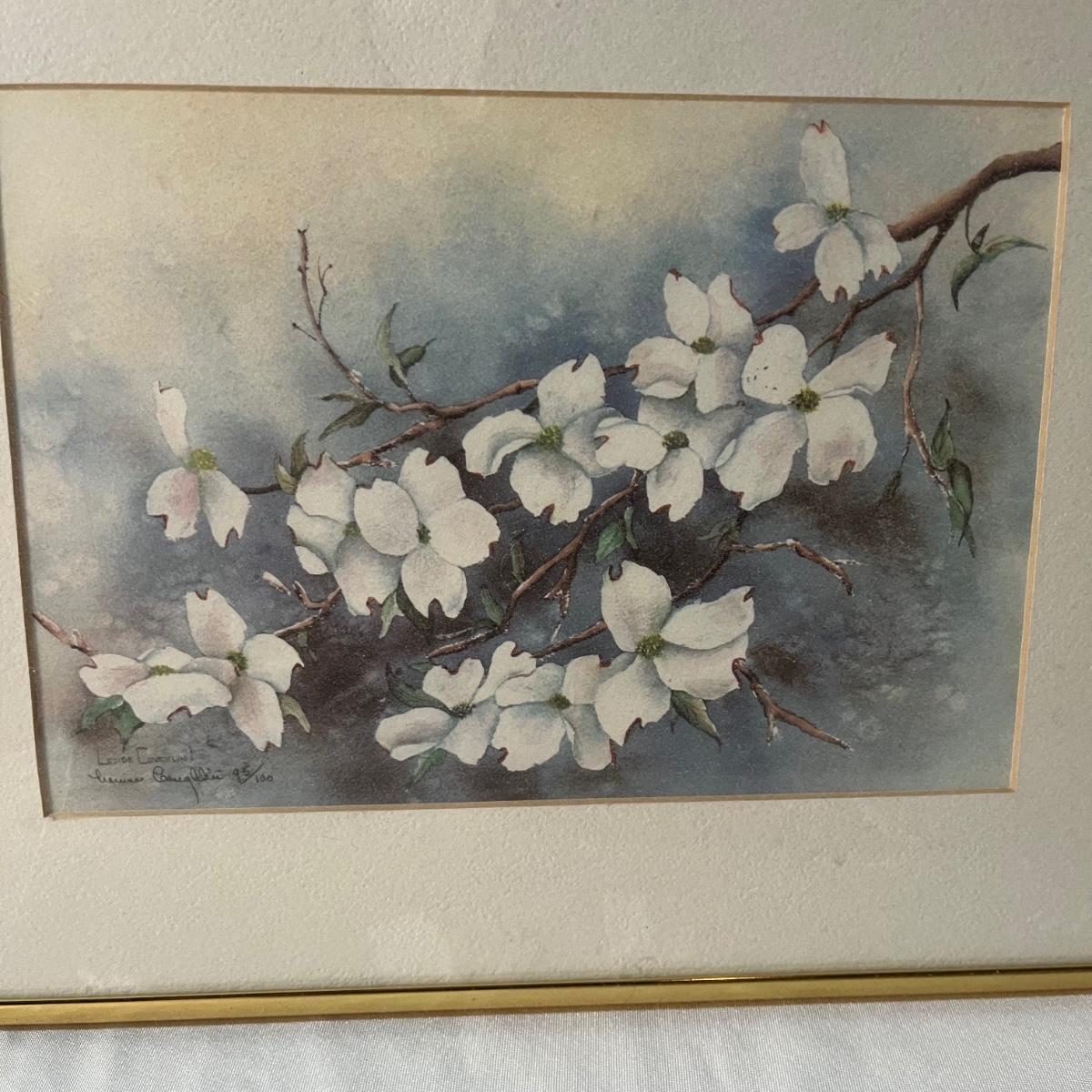 Lot includes an original wooden framed and signed watercolor of irises by Pat Garnett, a signed and wooden framed photo of tulips by John W. Golden and a signed and numbered print of dogwoods by Louis Coughlin in a metal frame. Also includes what appears to be a signed watercolor of potted flowers by Stuart Burroughs in a wooden frame. Largest frame measures 11” x 14”.