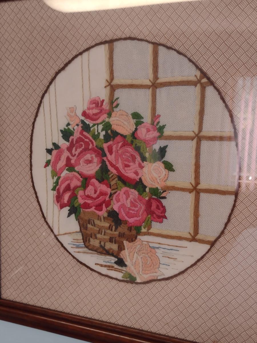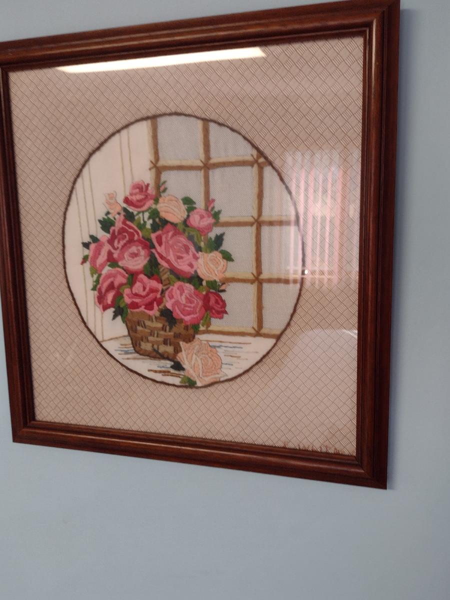 Framed Floral Basket Design Needlework Wall Art- Approx 19" Square