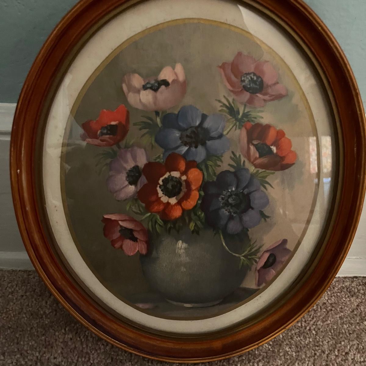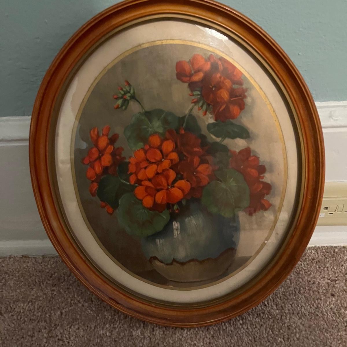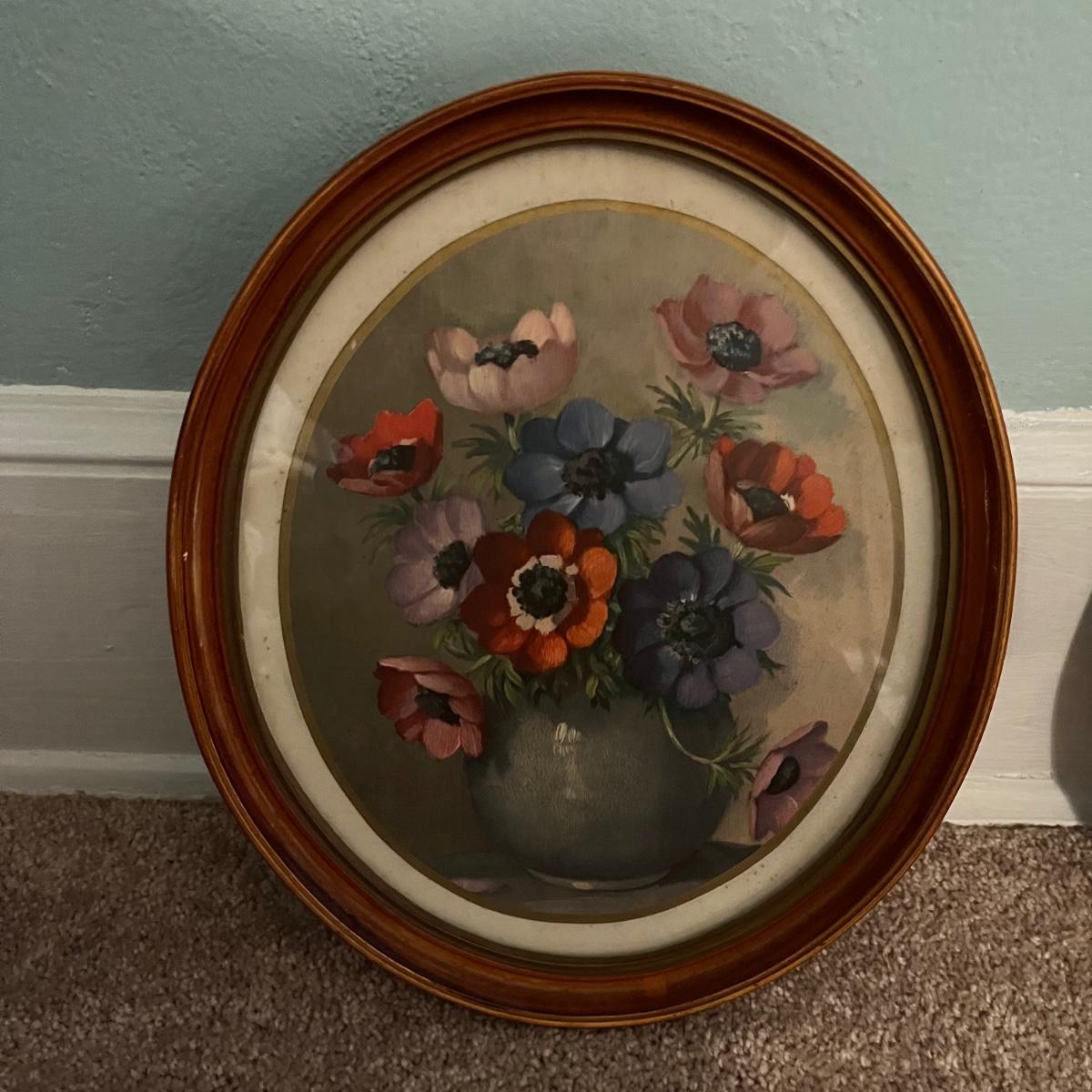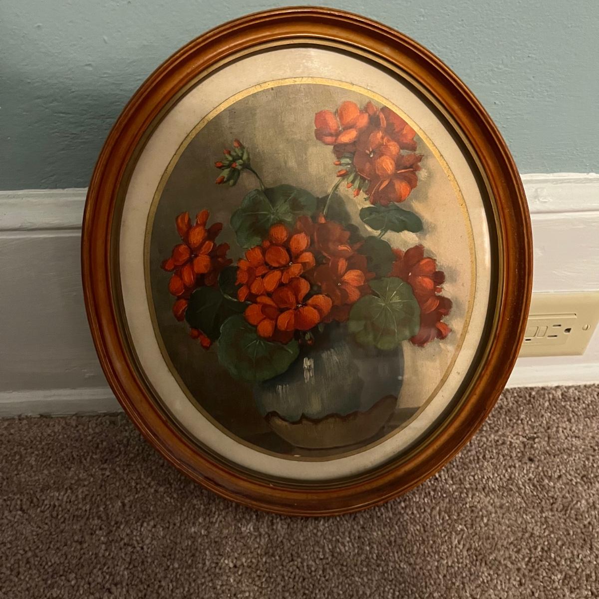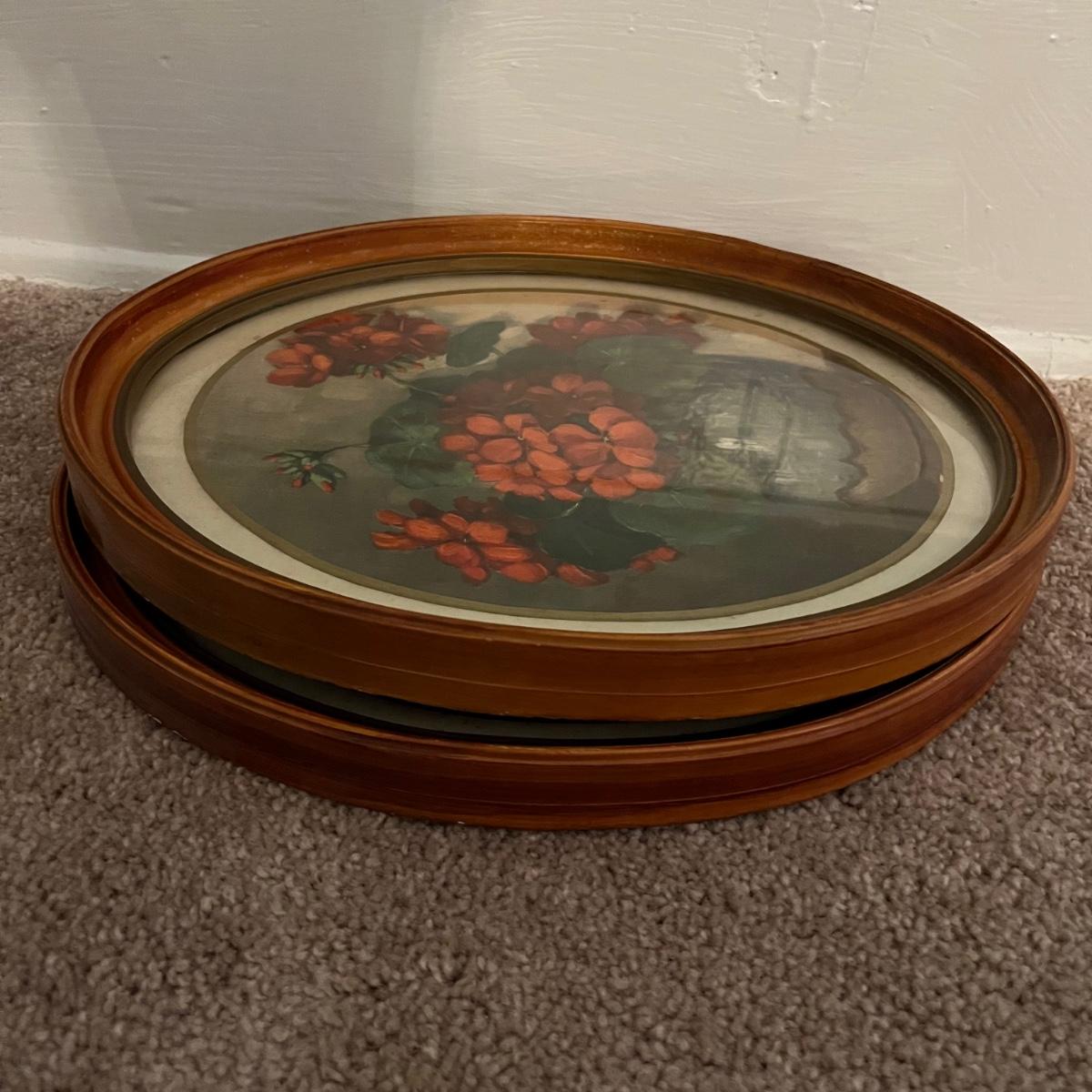 Lot includes two floral prints in matching wooden frames. Frames measure 11.5” x 13.5”.