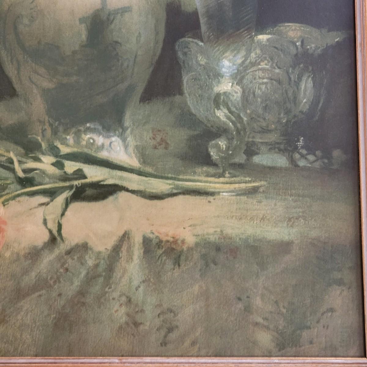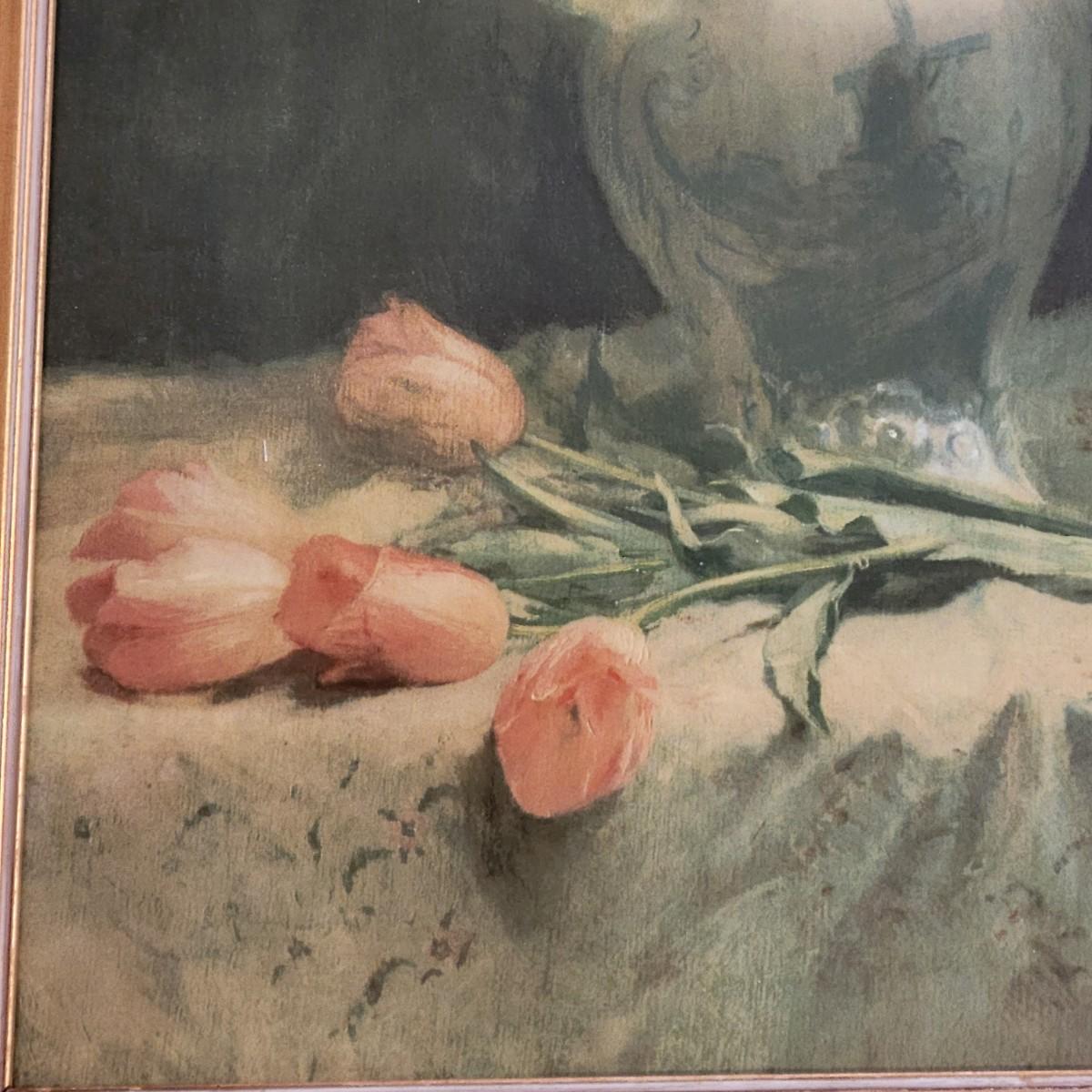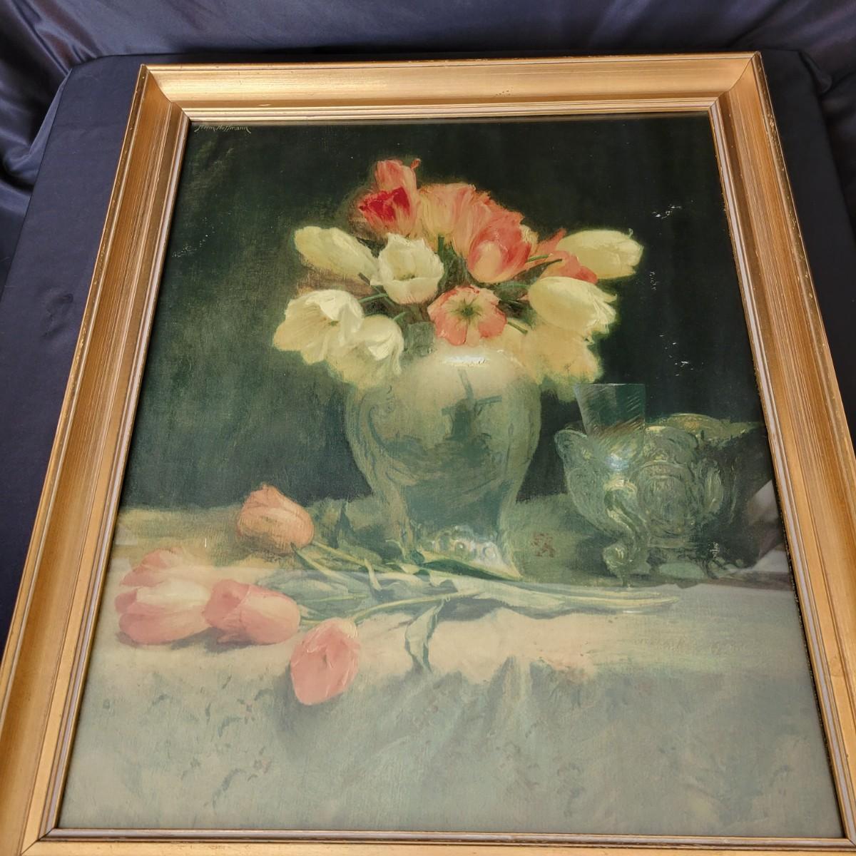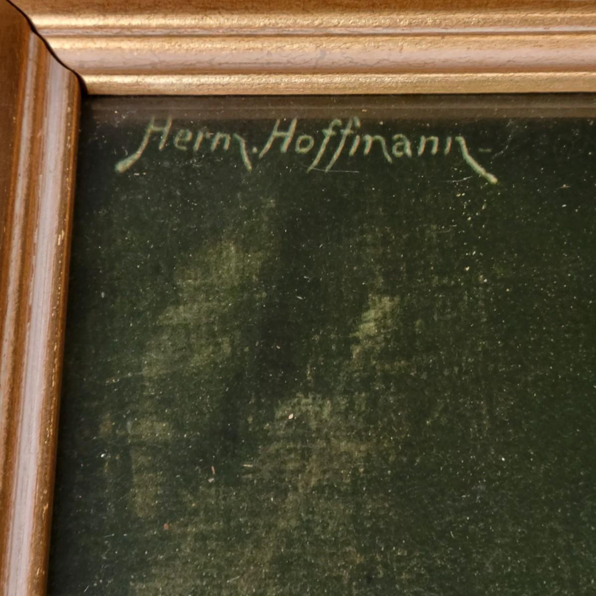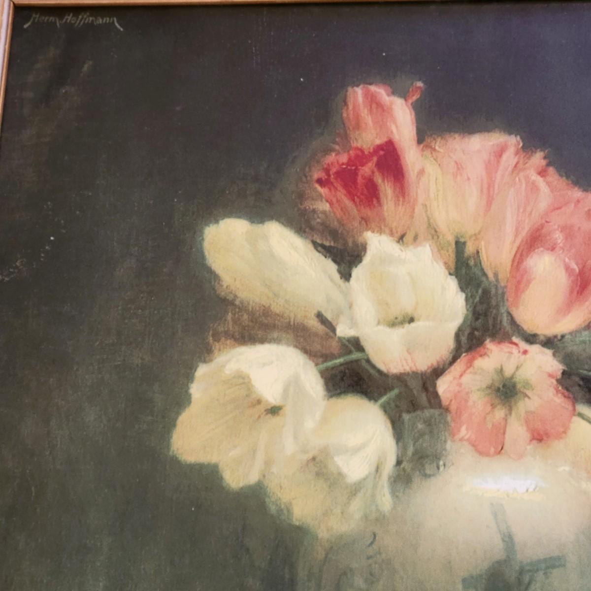 A framed floral print in good condition but the frame does have some minor scratches and blemishes. This a print which appears to be signed by "Herm. Hoffman" is in wooden gold finished frame with glass. Backing paper has been removed. Measures approximately 27" x 32" x 2". Shipping available. Shipping art can be costly. We suggest calling our local UPS with dimensions and getting an estimate before bidding: (828) 252-6930.