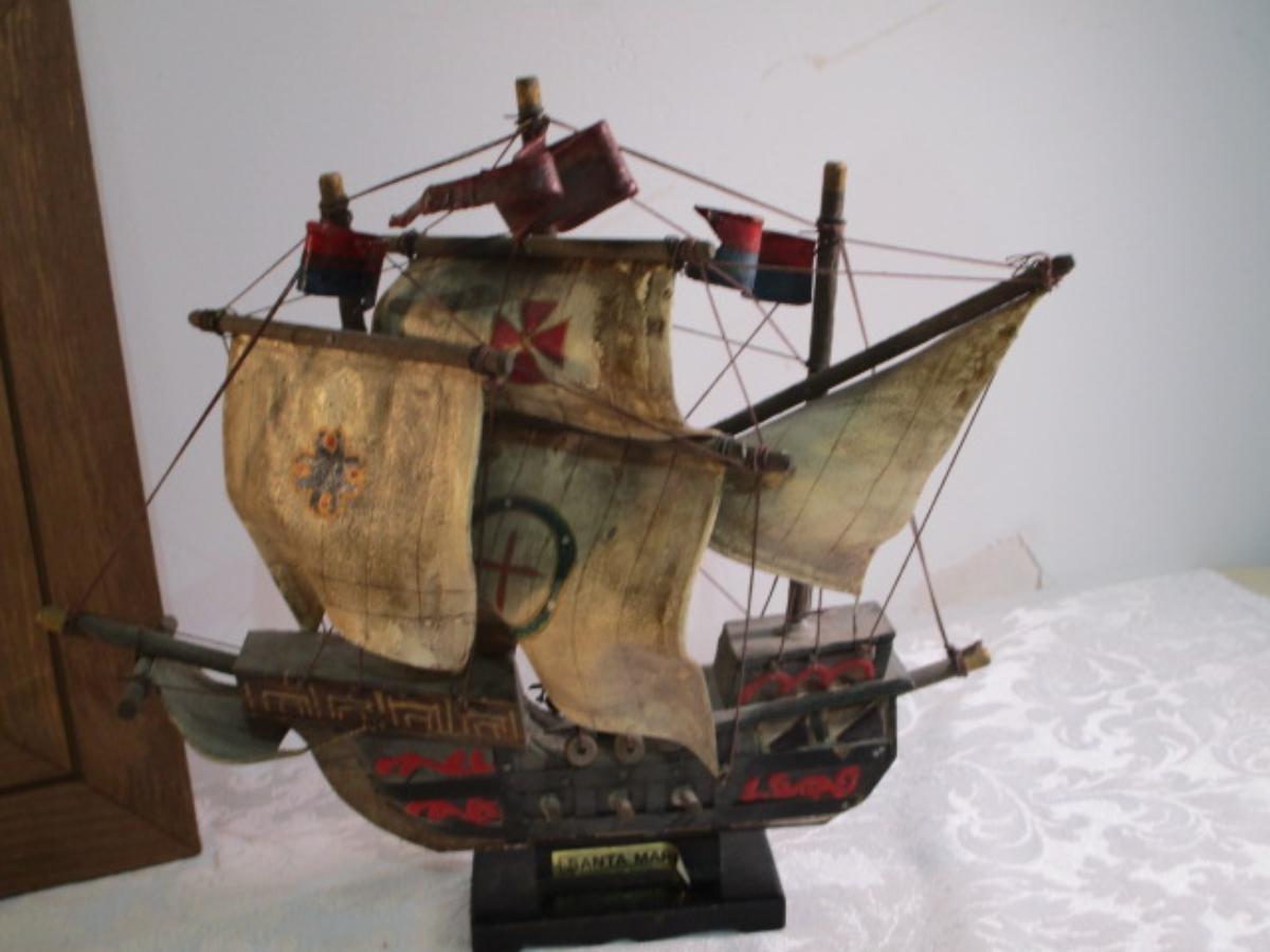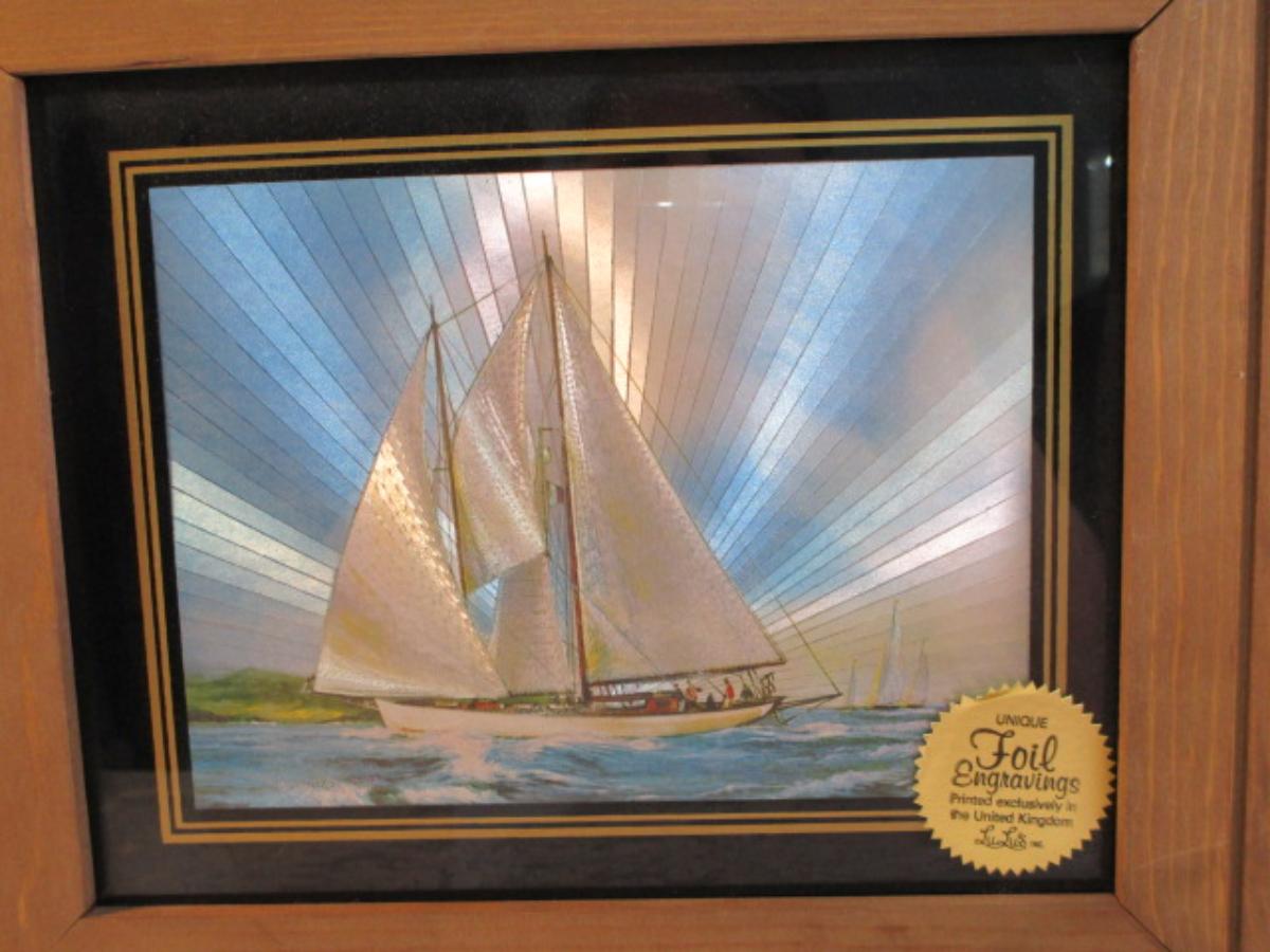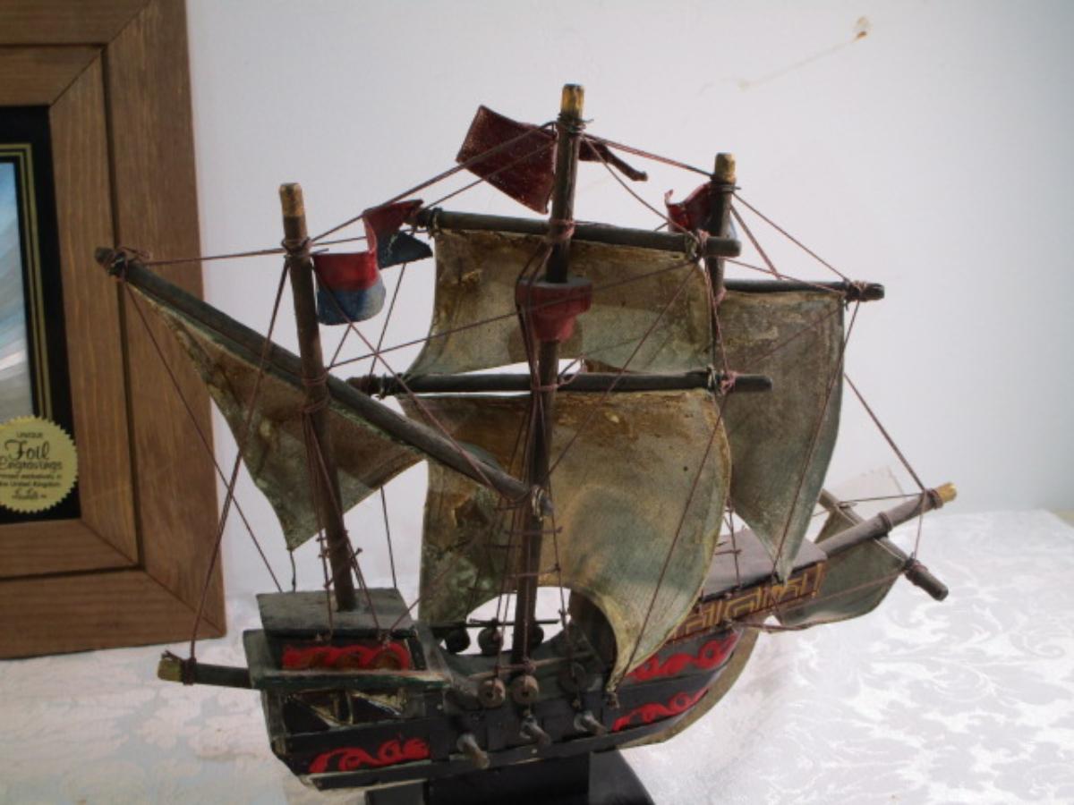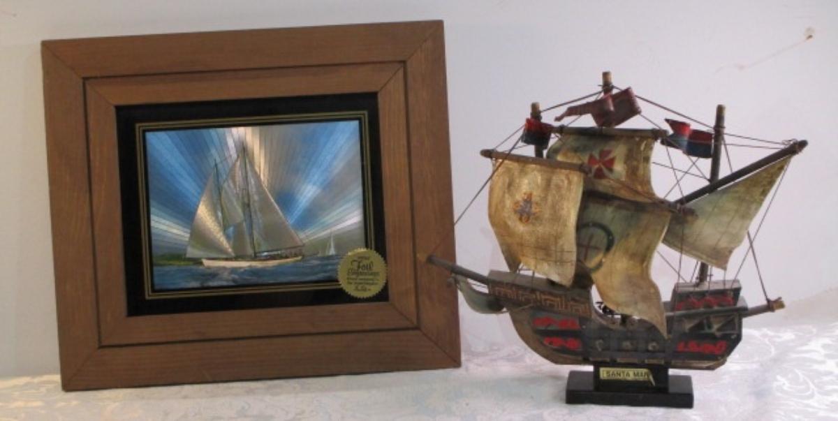 Framed Foil Engraving of a sailboat by Lulu's, Inc., Santa Maria Ship figurine