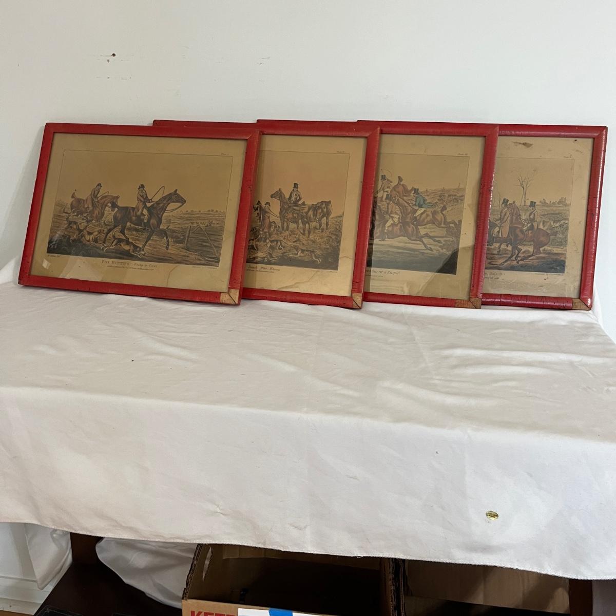 Lot includes four wooden framed Fox Hunting engravings by T. Sutherland. Each frame measures 16” x 12”H. Frames have veneer peeling and one engraving has a water stain, see pictures.