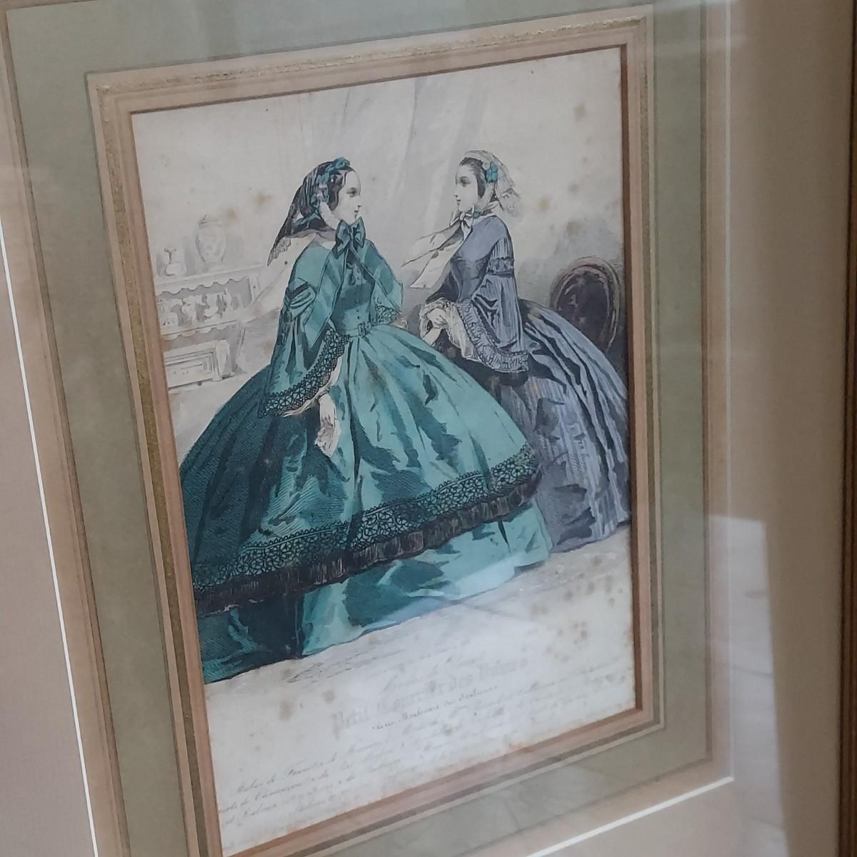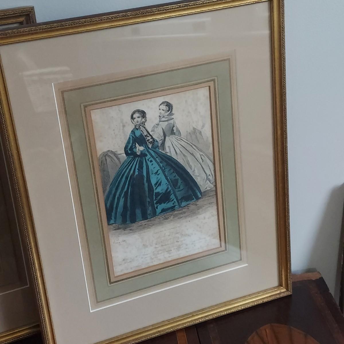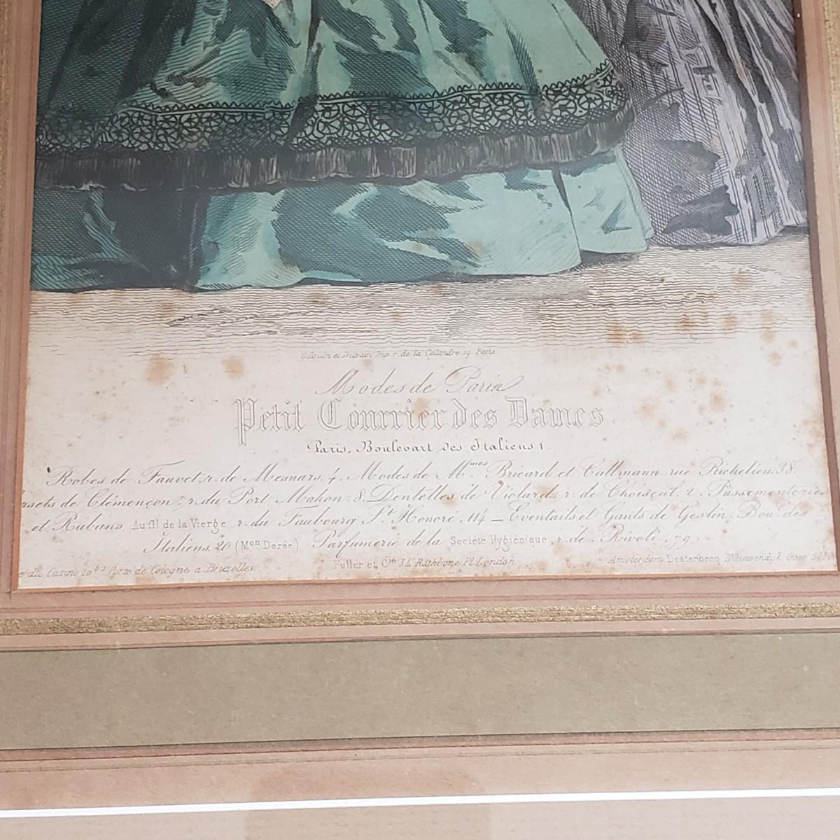 Two prints that appear to be French Victorian. They are matted under glass in matching gold wood frames that measure 14” x 17"H. There are some age spots on the prints. Please see photos for details. Shipping available