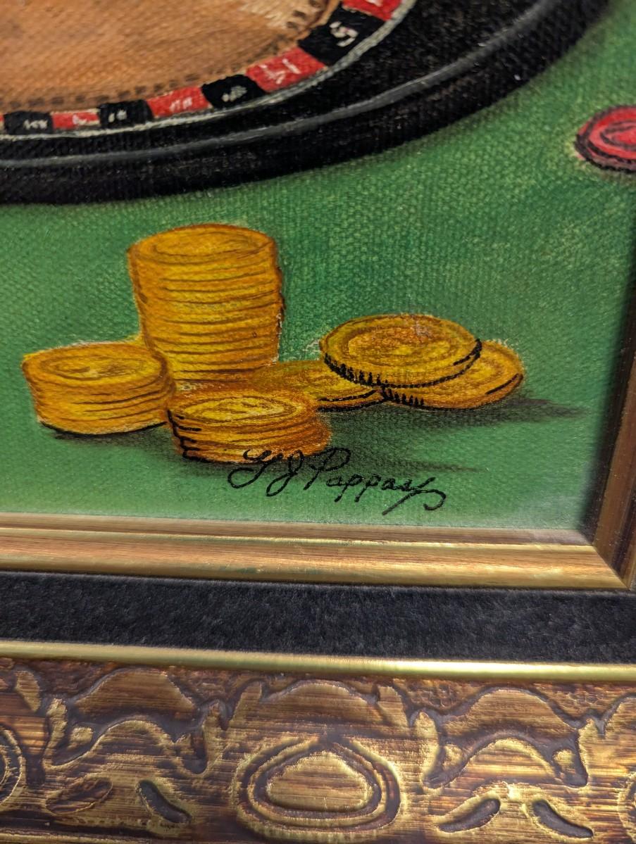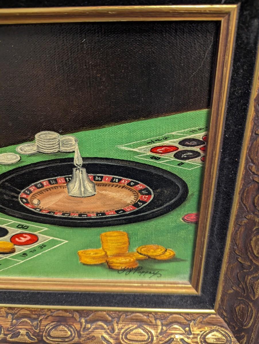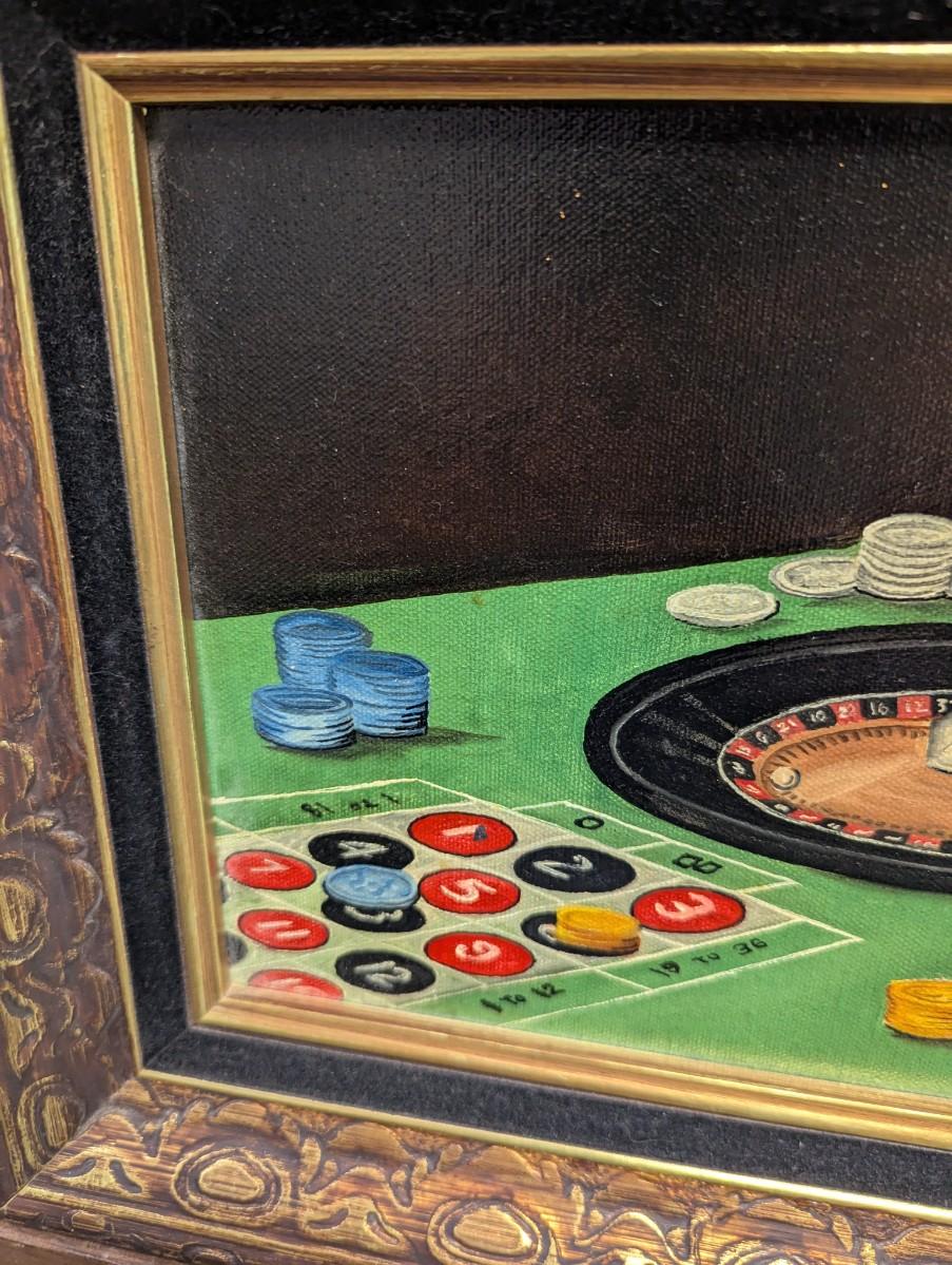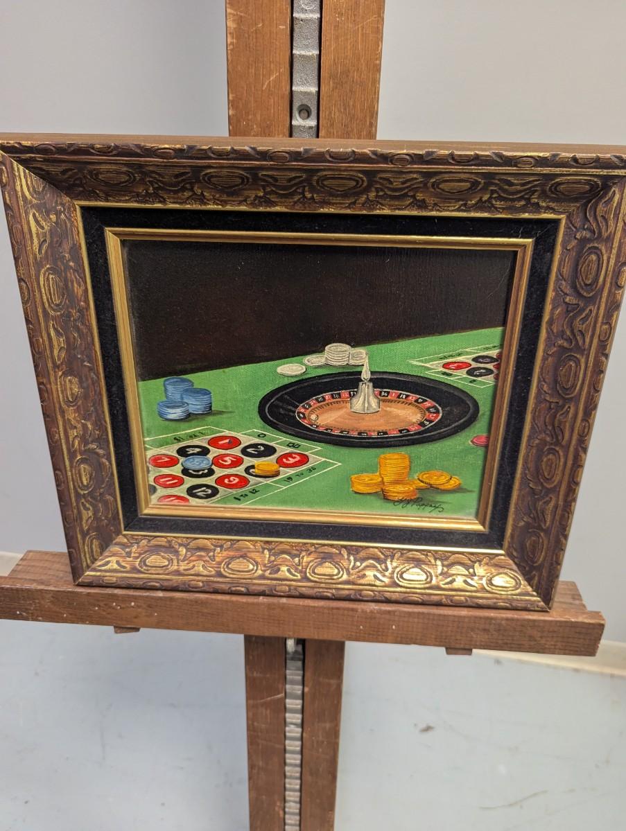 Framed Original Art on Canvas Roulette Gambling Table Signed by Artist