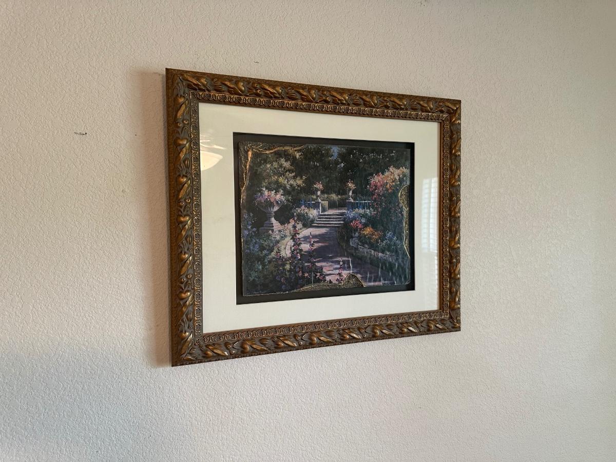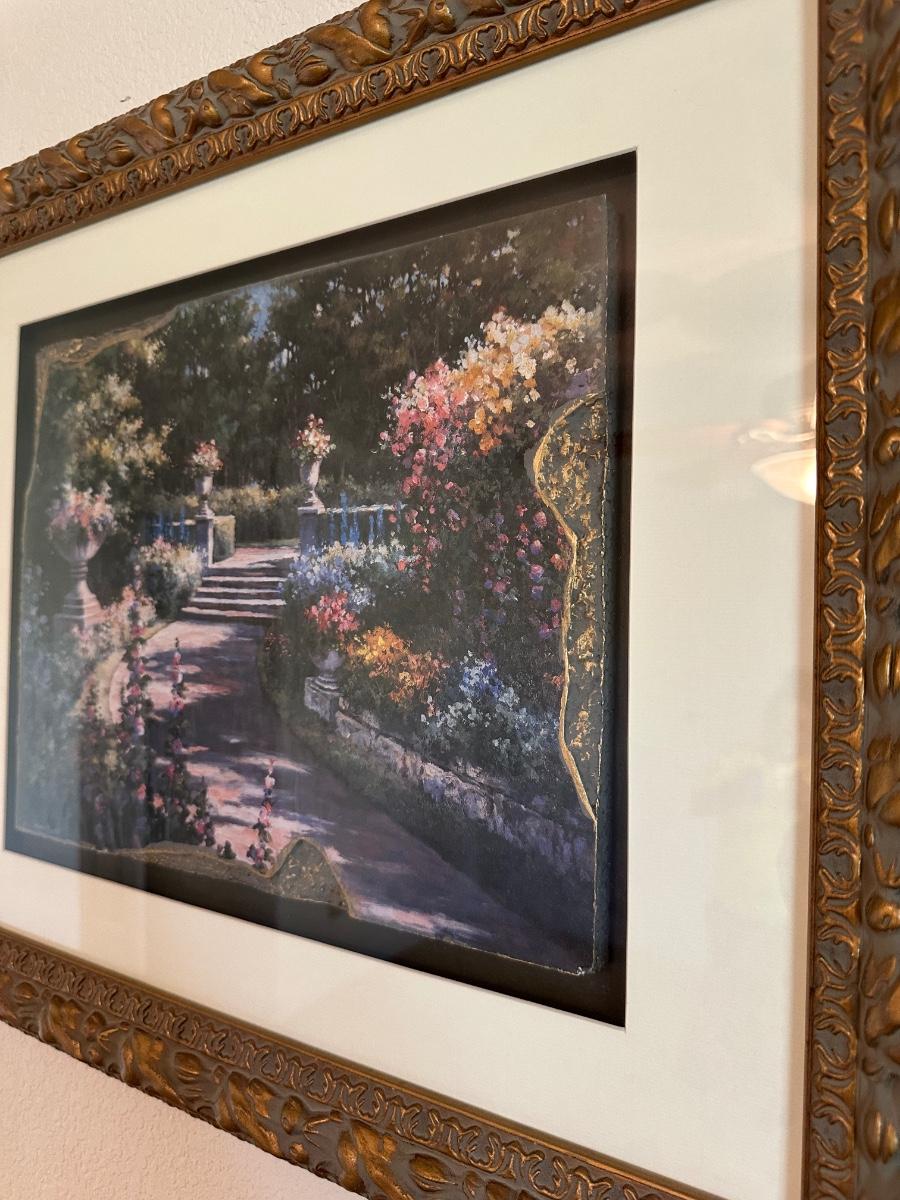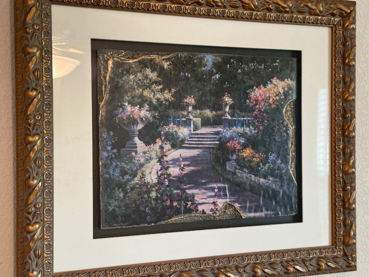 FRAMED GARDEN SCENE PICTURE AND 2 FRAMED FLORAL PICTURES