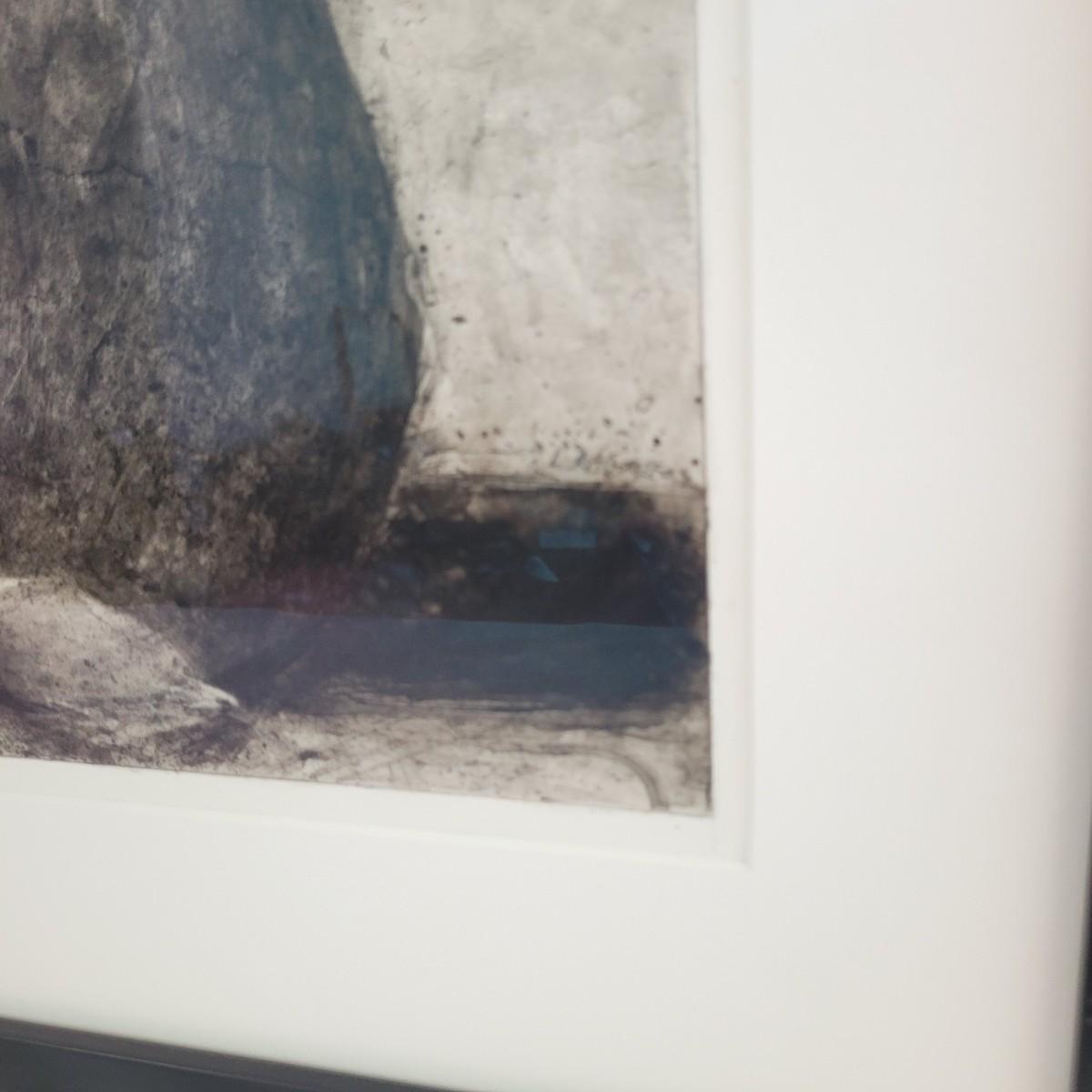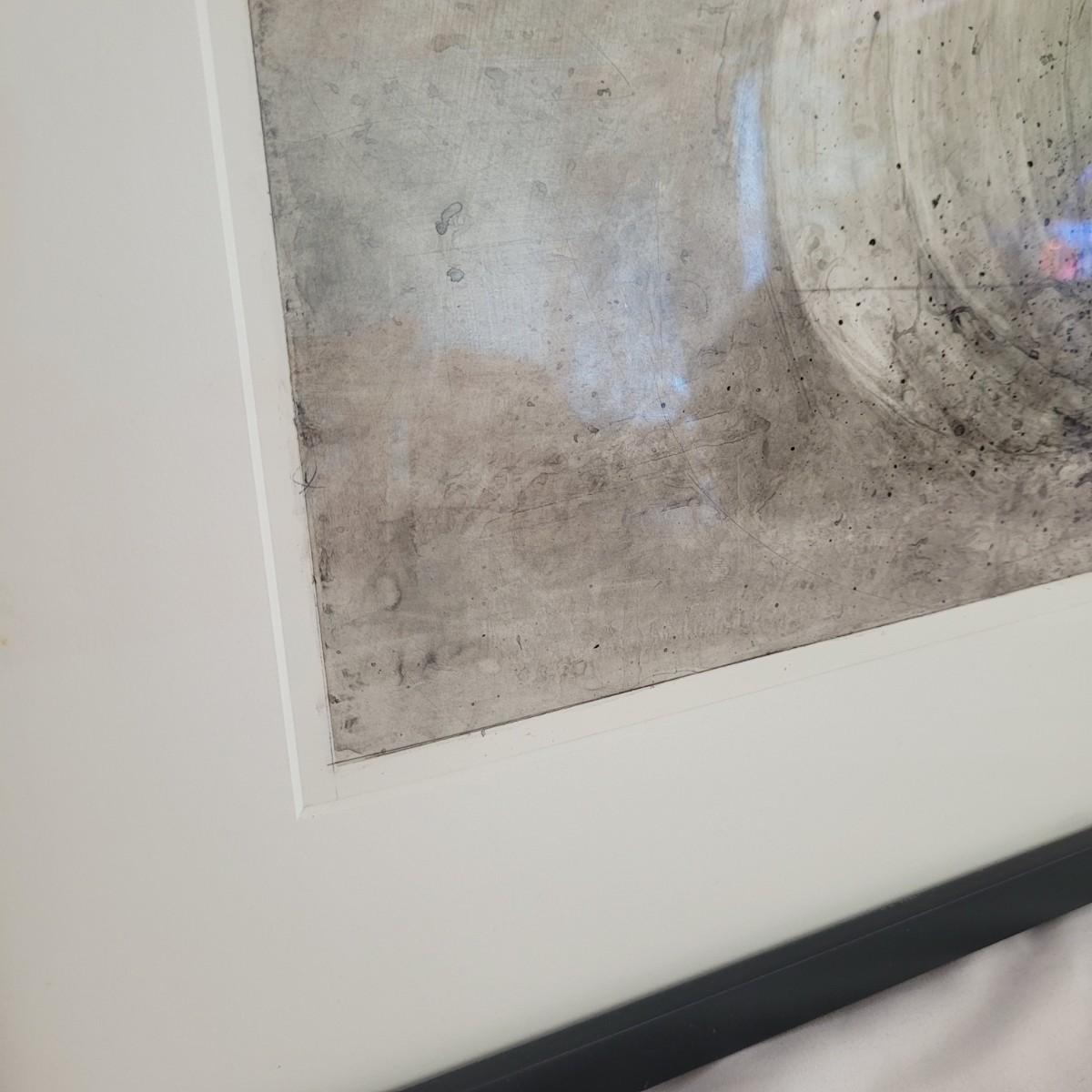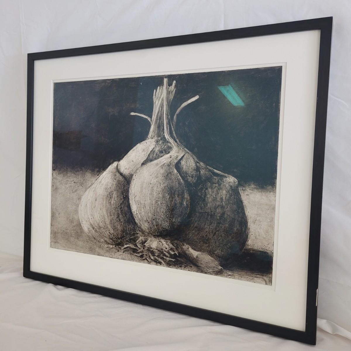 This abstract print by Leonard Ragouzeos centers a large garlic bulb with varying shades of deep blacks and greys. Matted and framed in a black plastic coated frame. Some chipping and scratches on frame (see photos). Frame measures approximately 31” x 25.” Shipping available. Shipping art can be costly. We suggest contacting our preferred local shipping provider, Postage Express, with dimensions and getting an estimate before bidding: (828) 255-9250 or shipping@postageexpressnc.com.