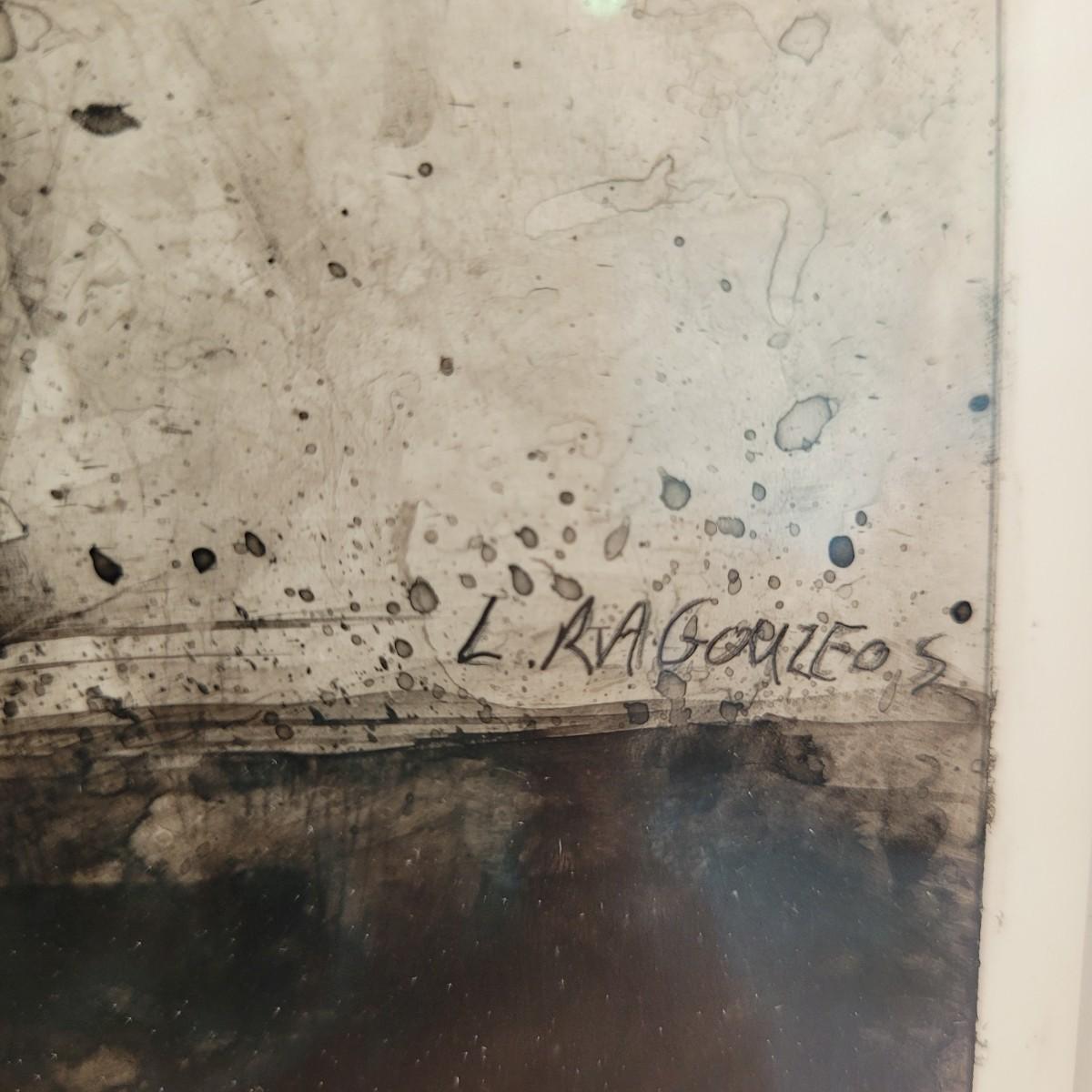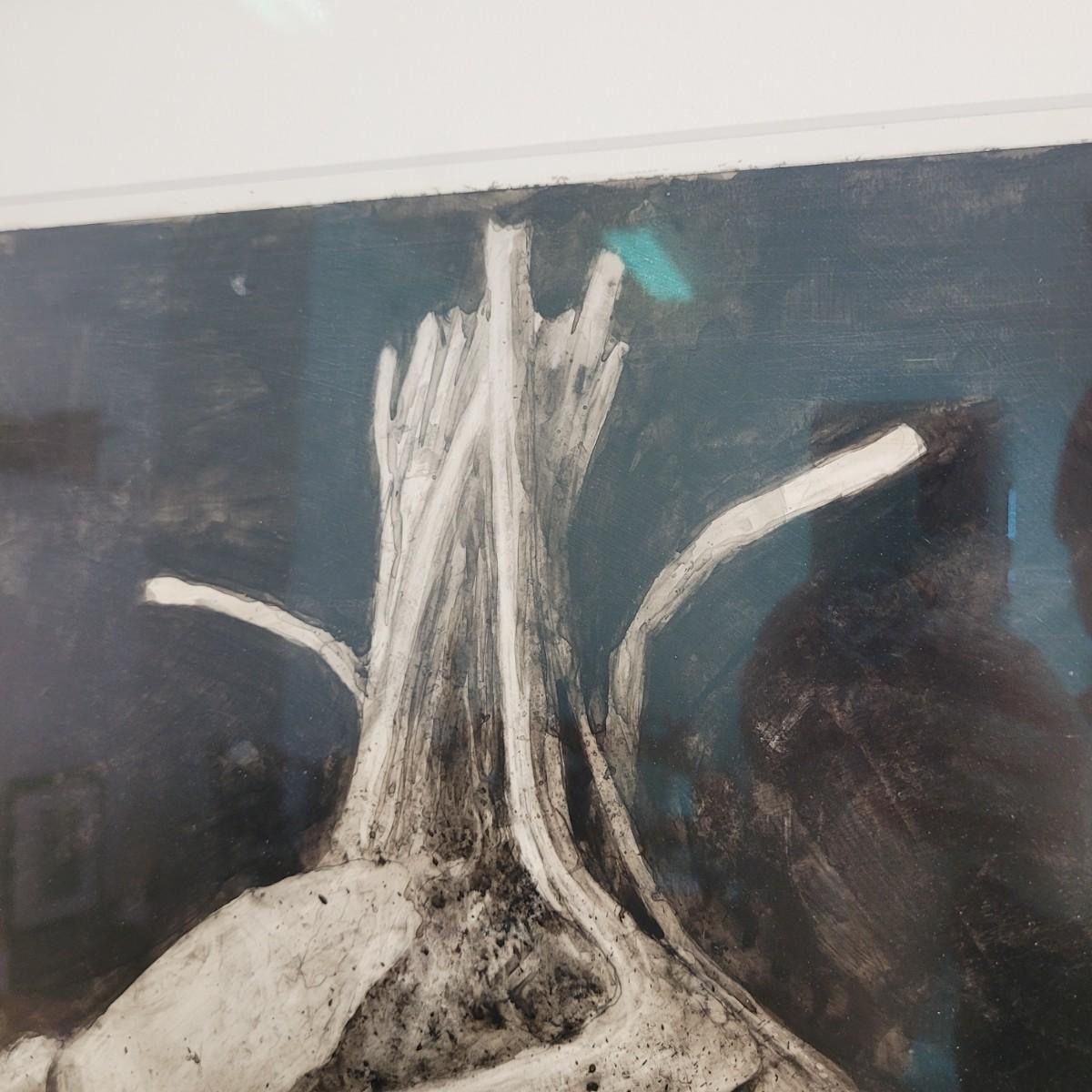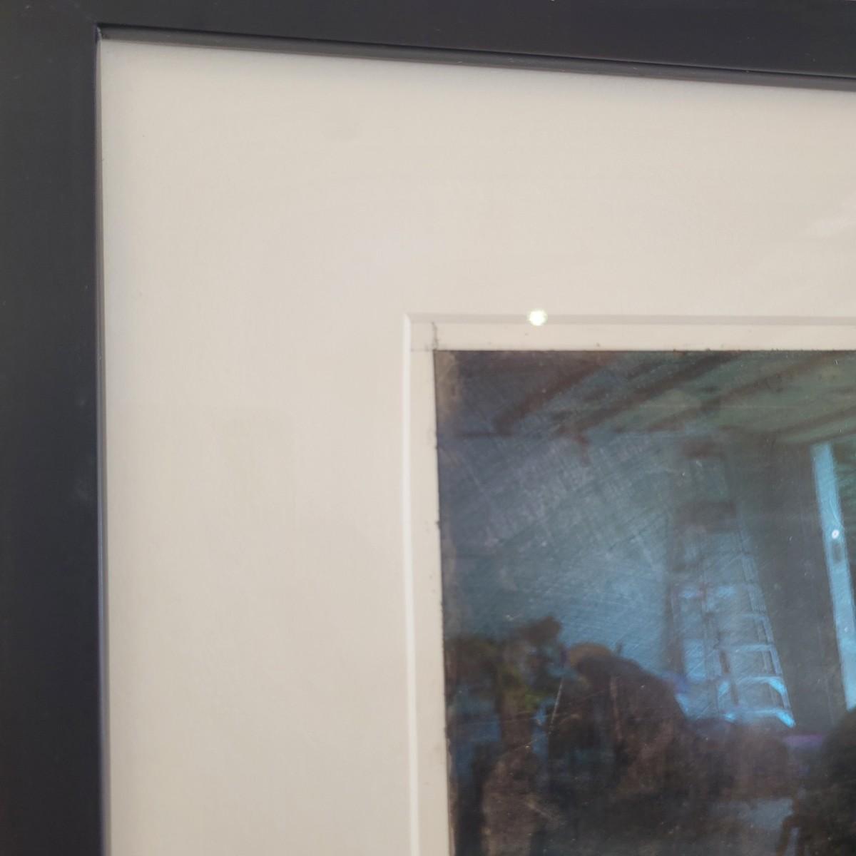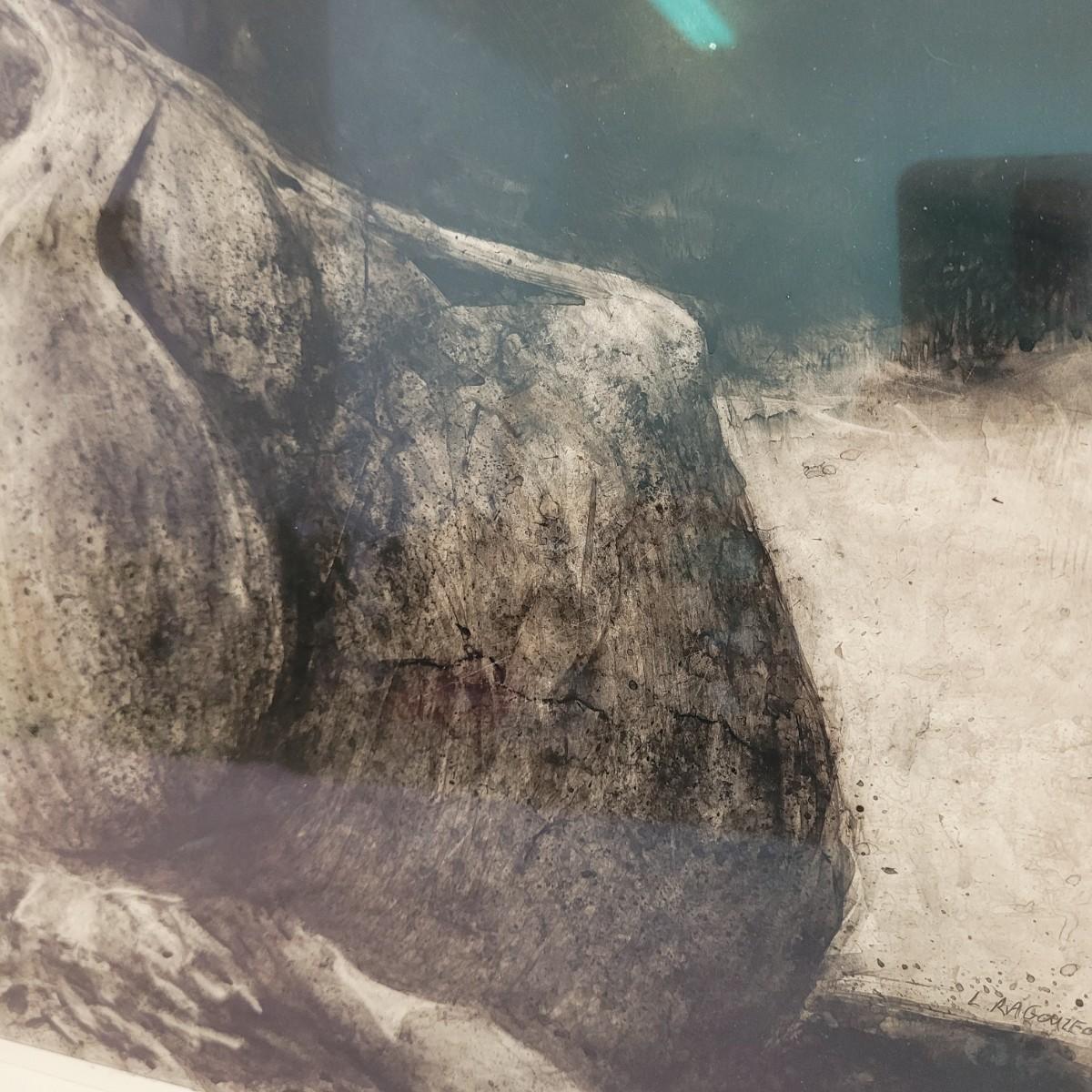 This abstract print by Leonard Ragouzeos centers a large garlic bulb with varying shades of deep blacks and greys. Matted and framed in a black plastic coated frame. Some chipping and scratches on frame (see photos). Frame measures approximately 31” x 25.” Shipping available. Shipping art can be costly. We suggest contacting our preferred local shipping provider, Postage Express, with dimensions and getting an estimate before bidding: (828) 255-9250 or shipping@postageexpressnc.com.