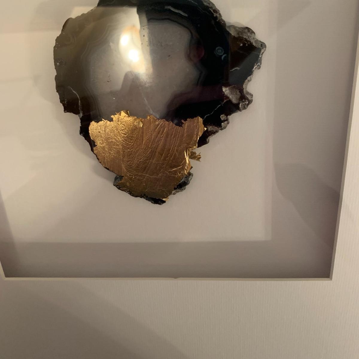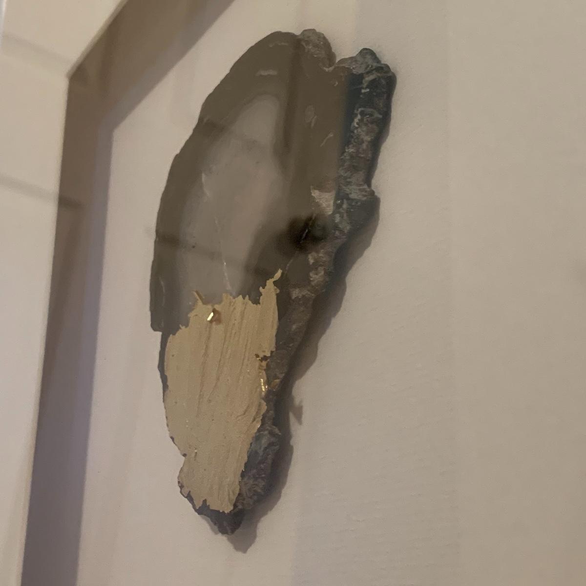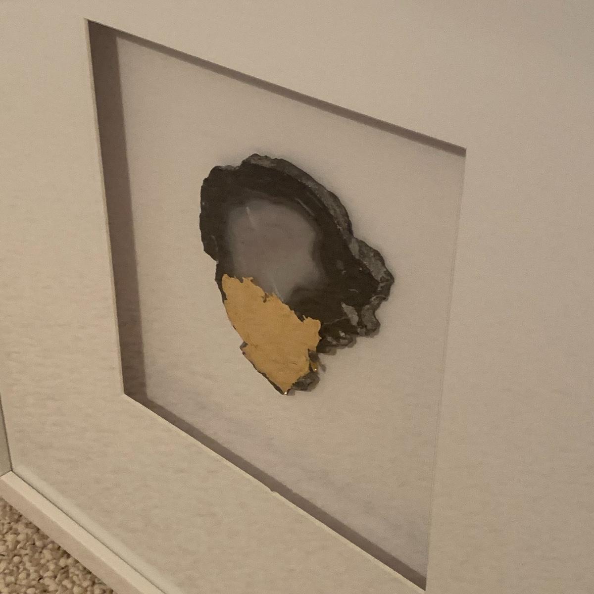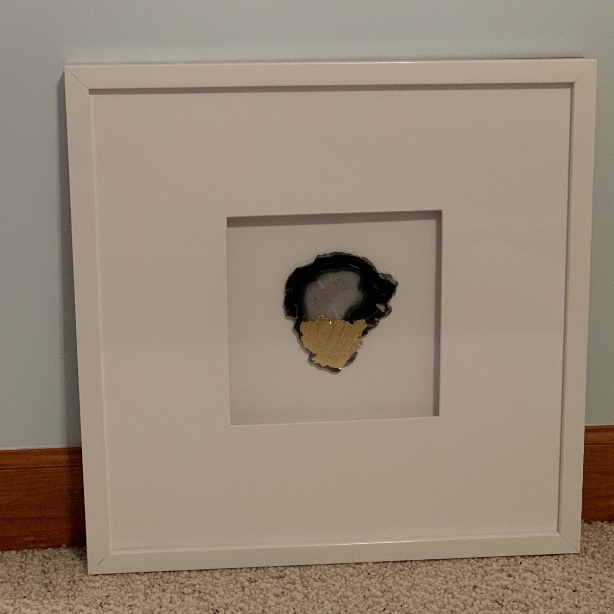 This is a geode slab that has gold a foil accent added to it that is framed with a shadow box style. There is white matting behind and in front framing the geode, and the picture frame is white plastic. There is hardware attached the the back for hanging. The frame measures 19.25” x 19.25”. It is in pretty good condition, with a small nick seen on the inner matting, and a crack in the geode. Shipping available.