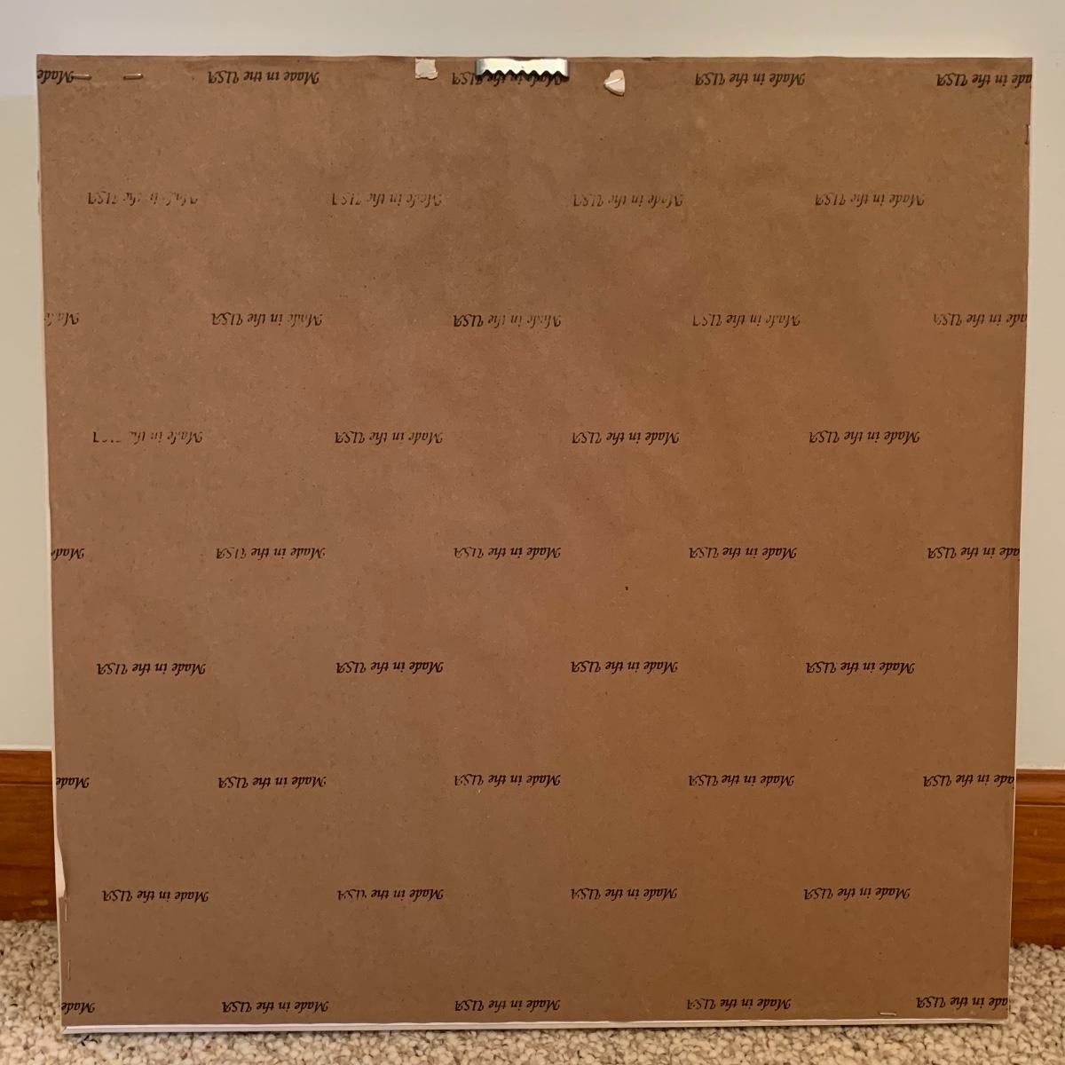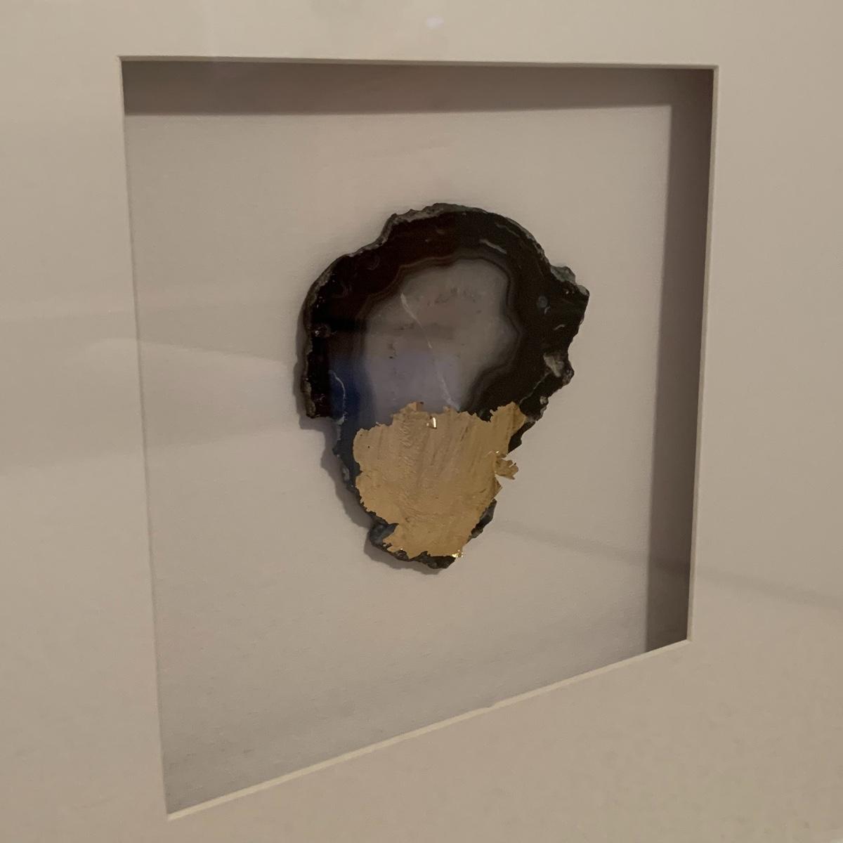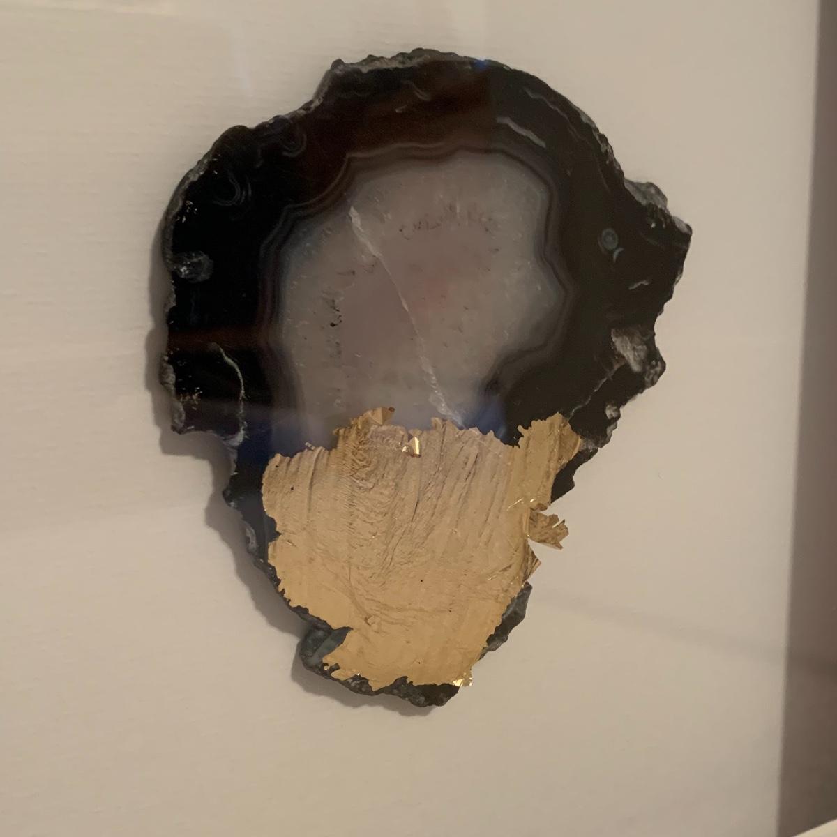 This is a geode slab that has gold a foil accent added to it that is framed with a shadow box style. There is white matting behind and in front framing the geode, and the picture frame is white plastic. There is hardware attached the the back for hanging. The frame measures 19.25” x 19.25”. It is in pretty good condition, with a small nick seen on the inner matting, and a crack in the geode. Shipping available.