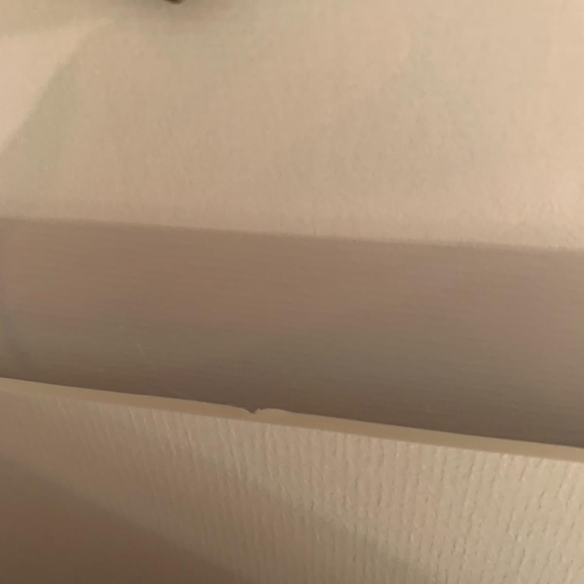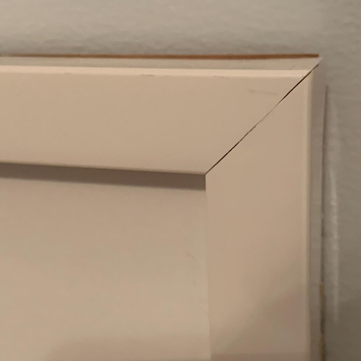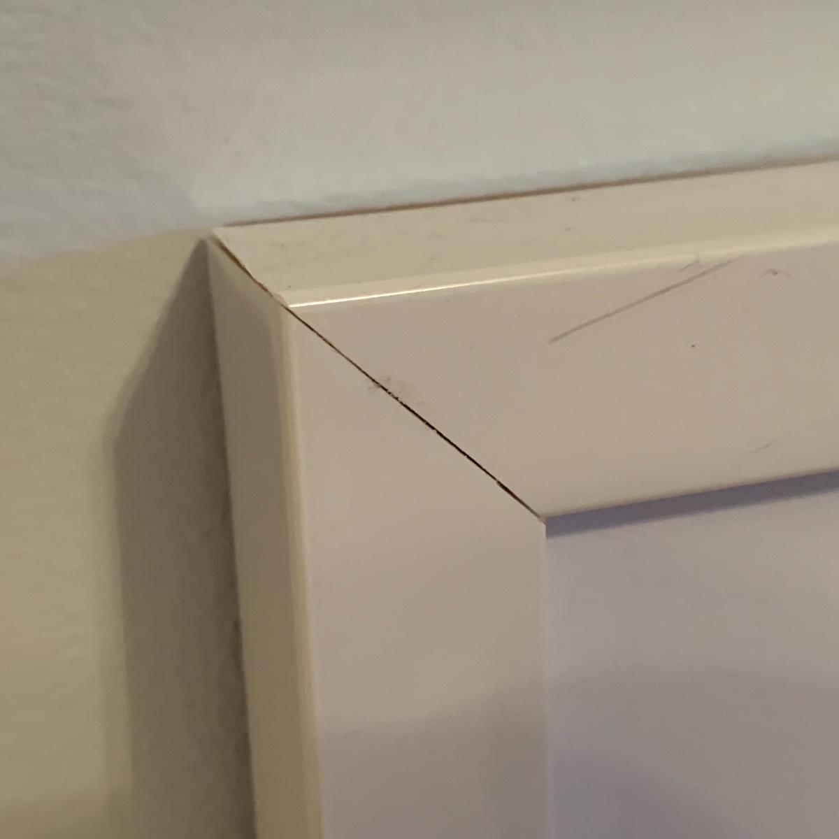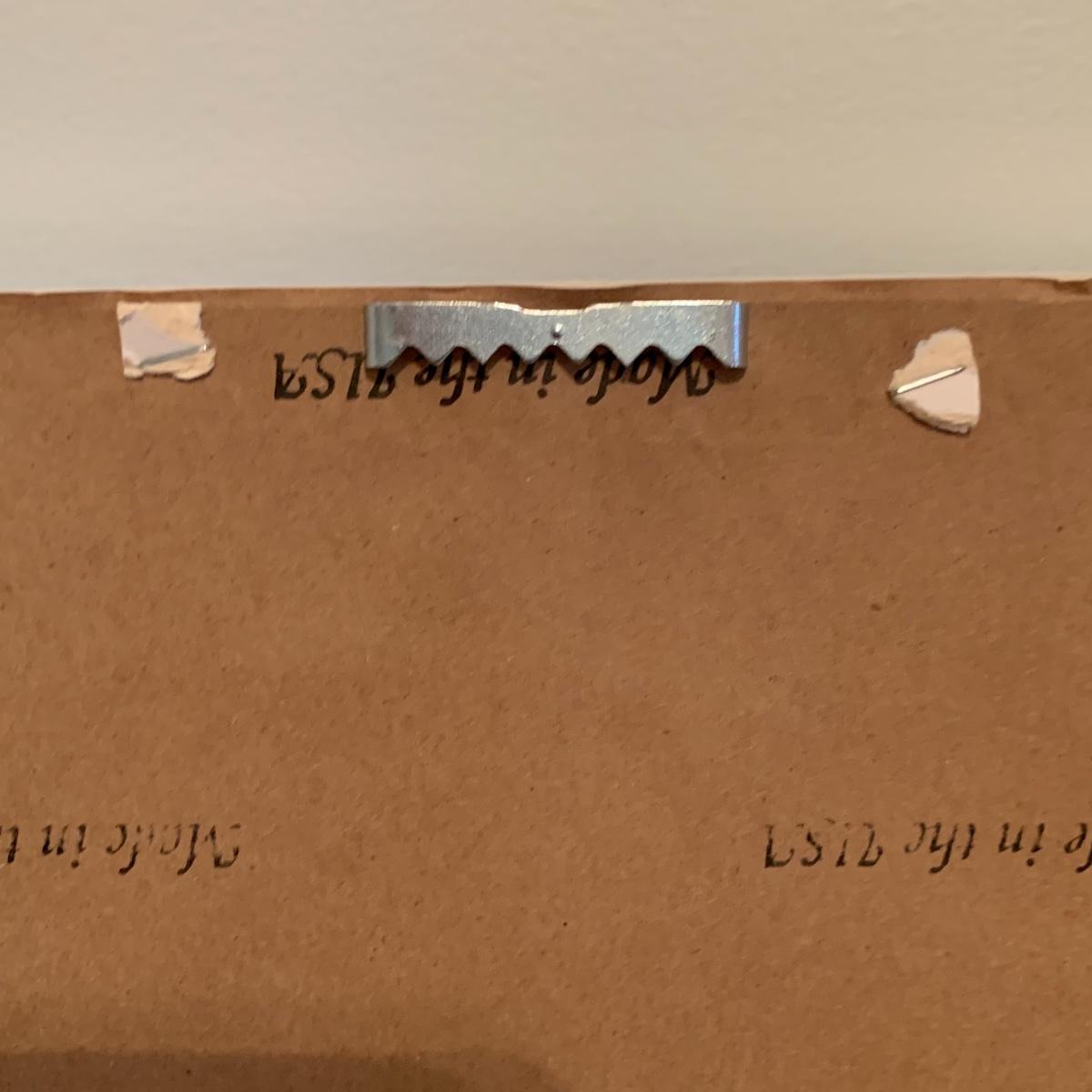 This is a geode slab that has gold a foil accent added to it that is framed with a shadow box style. There is white matting behind and in front framing the geode, and the picture frame is white plastic. There is hardware attached the the back for hanging. The frame measures 19.25” x 19.25”. It is in pretty good condition, with a small nick seen on the inner matting, and a crack in the geode. Shipping available.