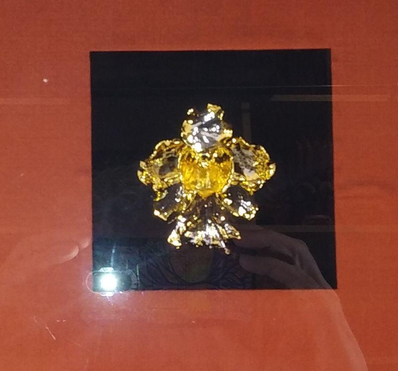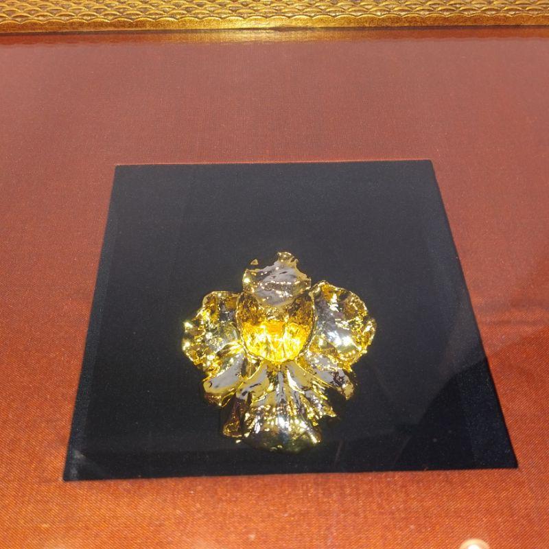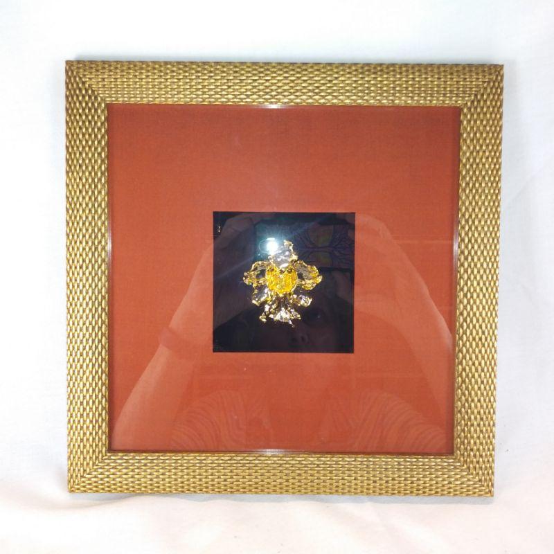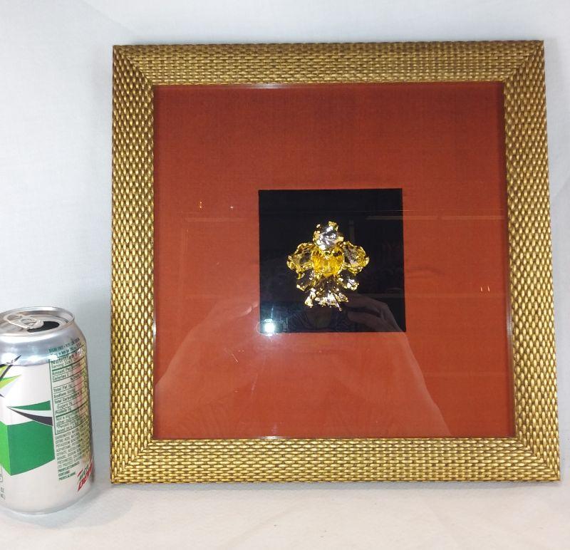This is a very unique and stunning piece. It is nicely-framed in a shadow box to showcase the very delicate - gold dipped iris flower. The over-all size is 12=inches square X 2-inches deep. In very good, ready to hang condition and look fabulous in your home.