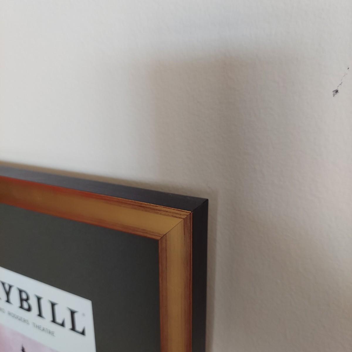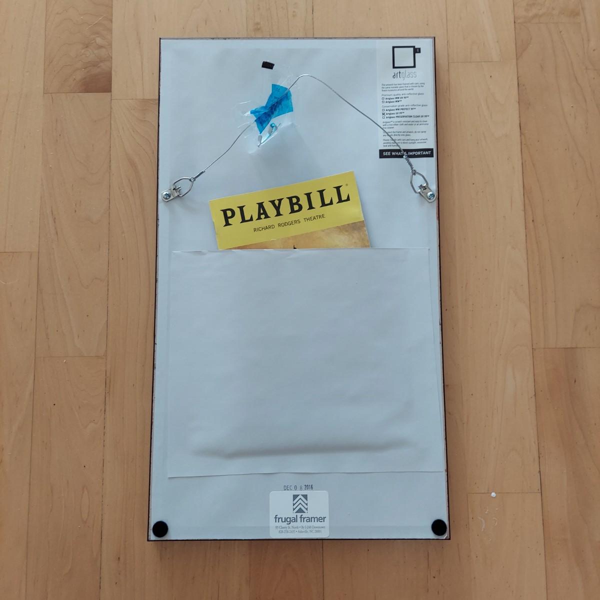 Hamilton playbill and two tickets framed and matted under glass. One playbill is loose in the pocket on the back of the frame. Gold tone wooden frame measures 10” x 18"H. Please see photos for details. Shipping available
