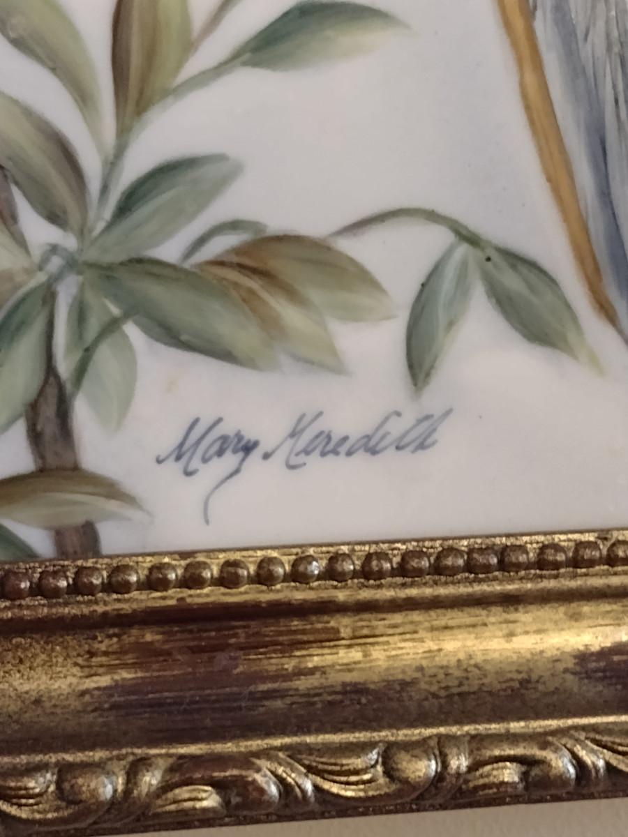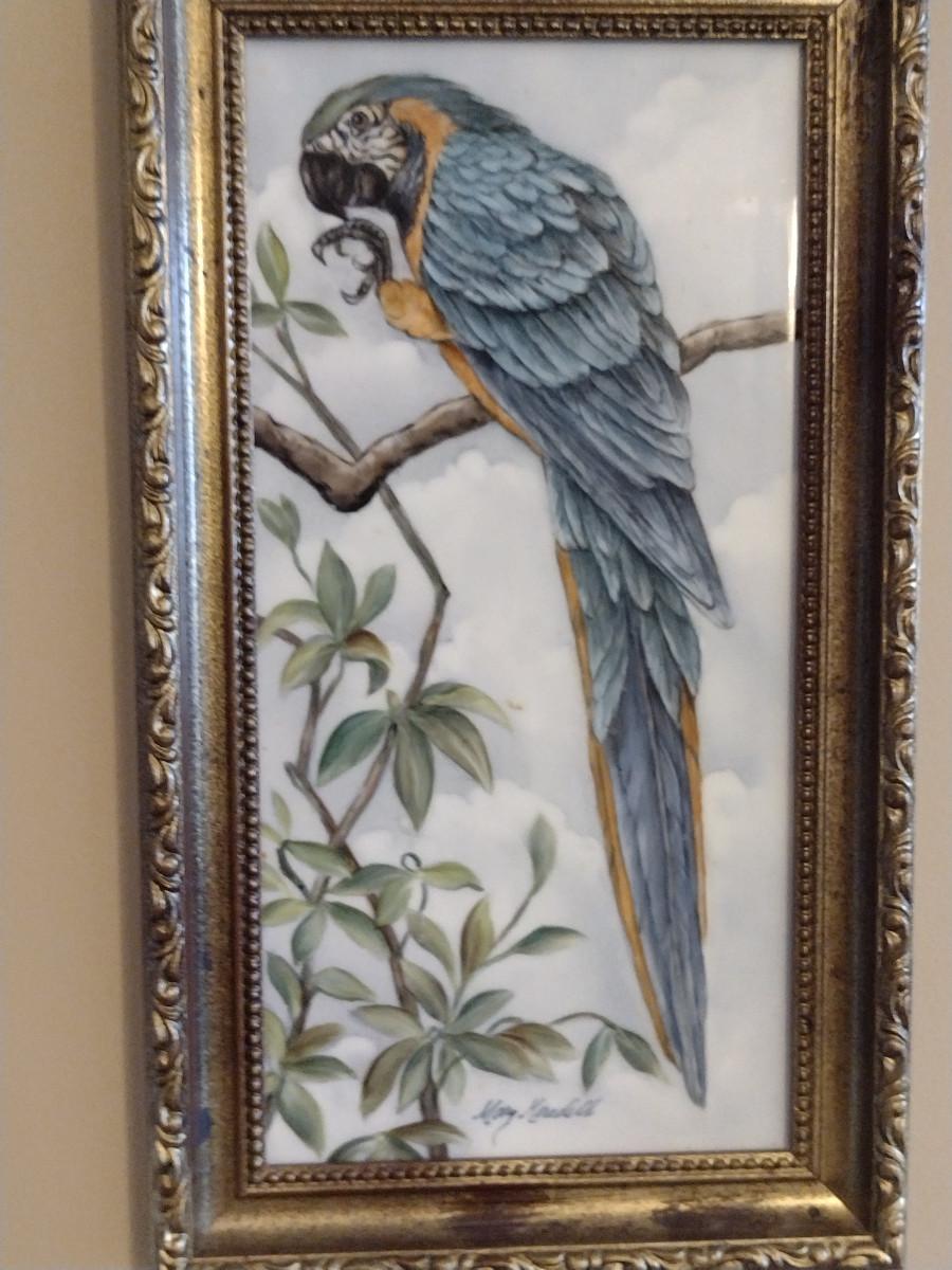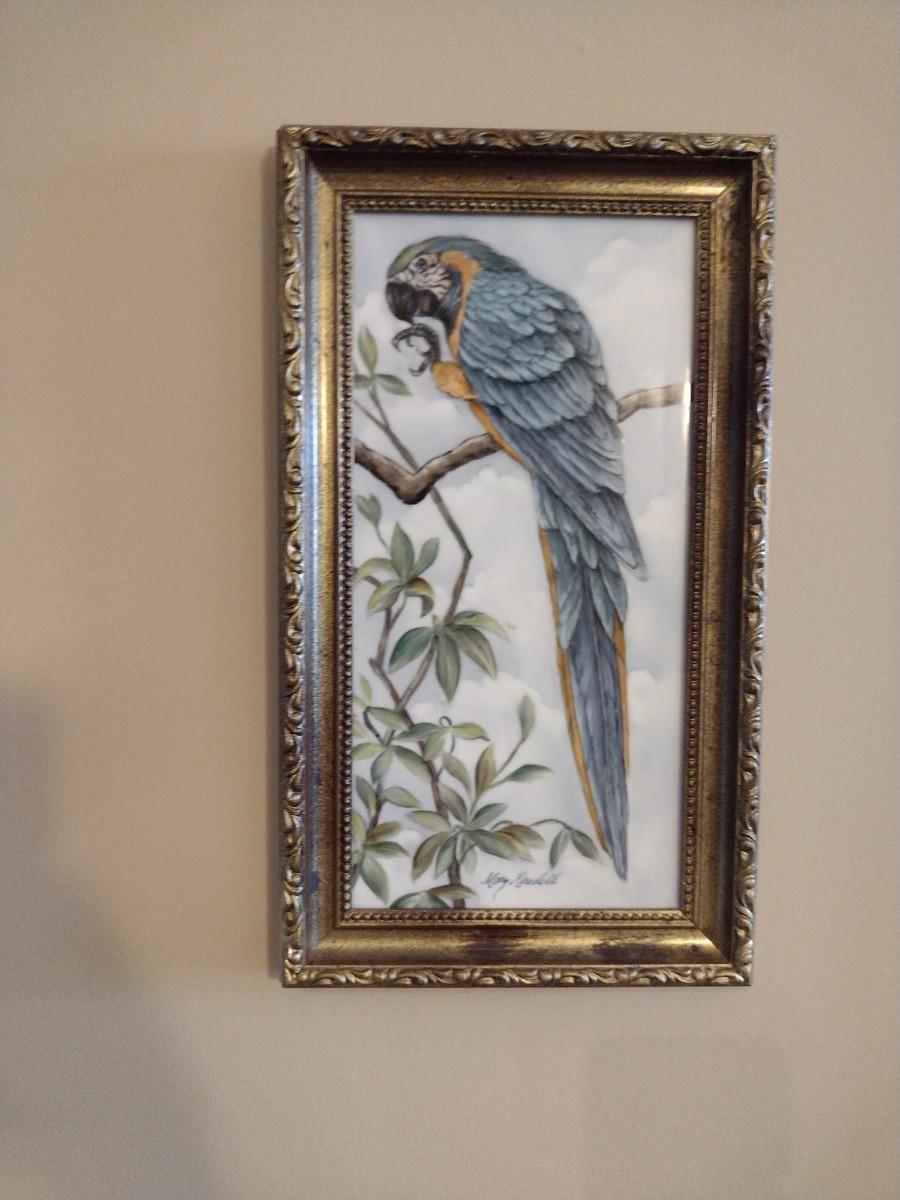 Framed Hand Painted Ceramic Tile by Local Artist- Blue-and-Gold Macaw- Approx 8" x 14"