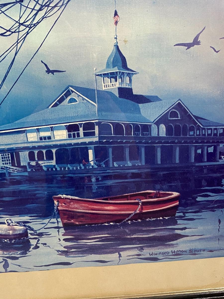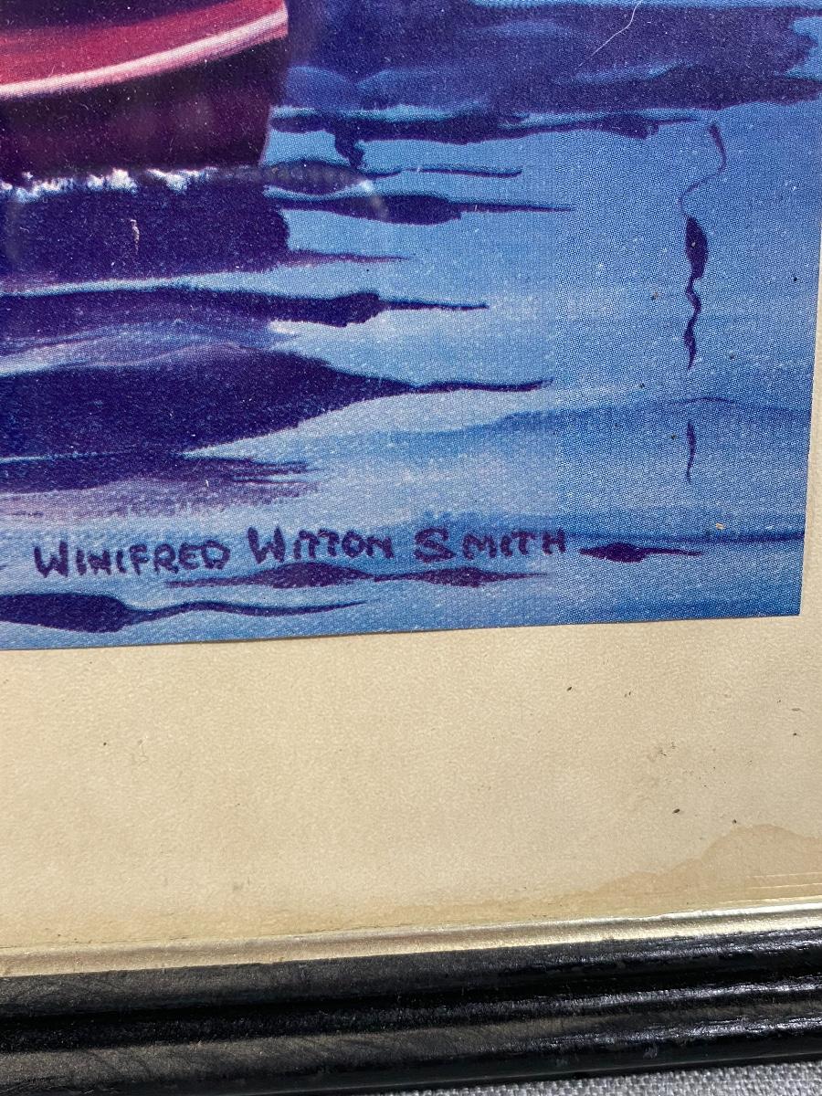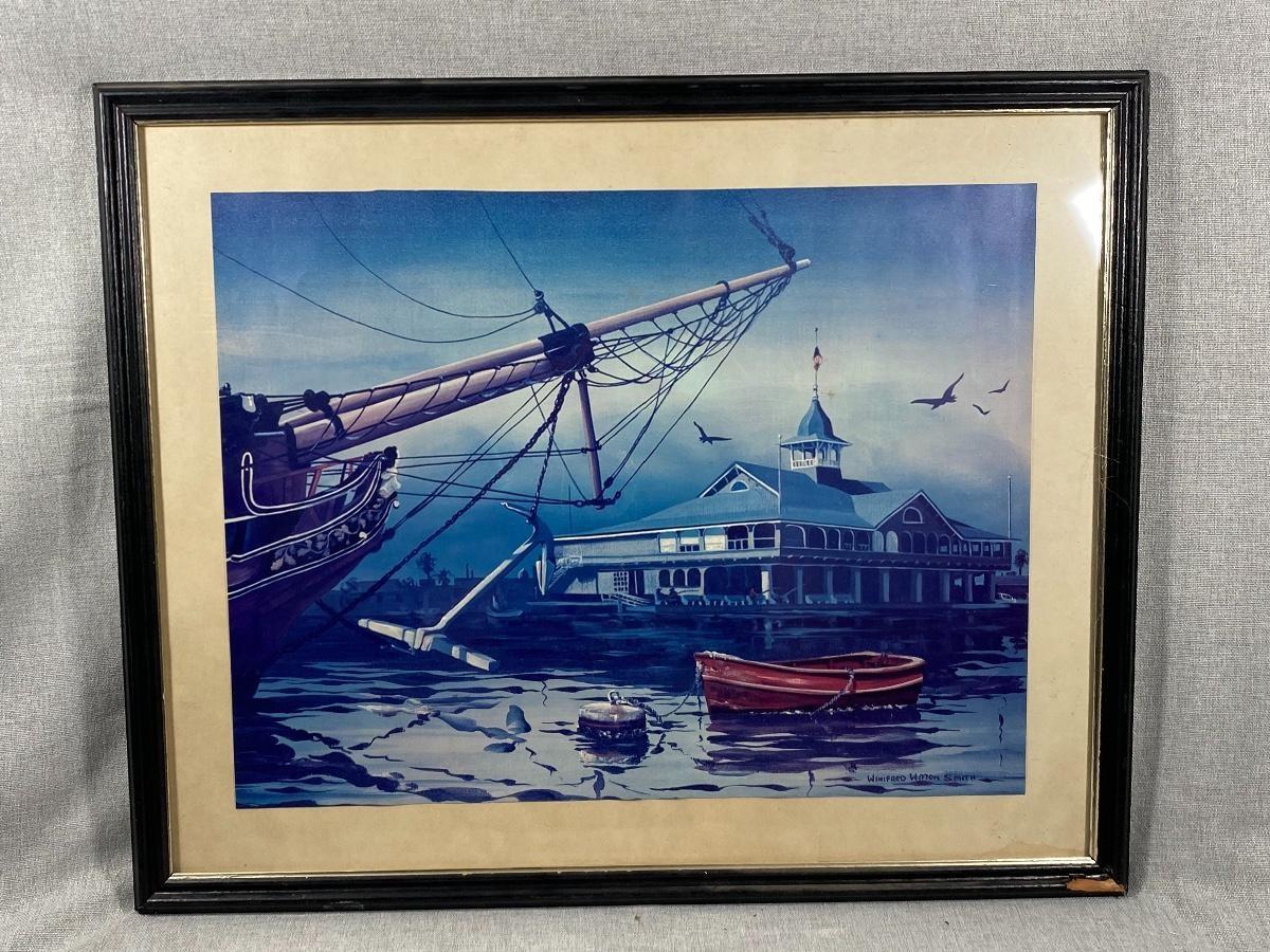 Framed ocean harbor print by Winifred Winton Smith. Looks like previous owner cut it to the current size, top edge has an irregular cut edge. Some discolor to the matting and a scuff on frame.