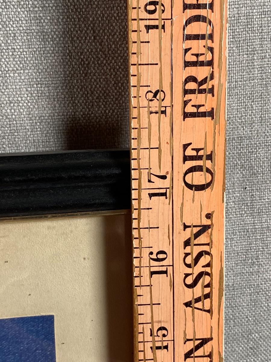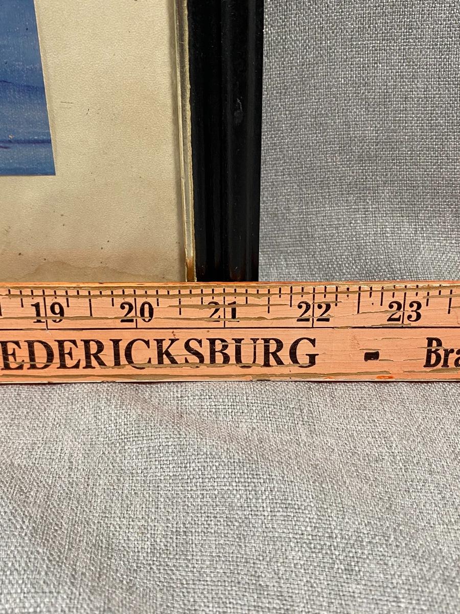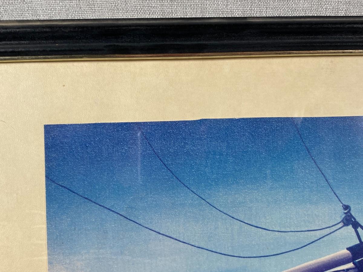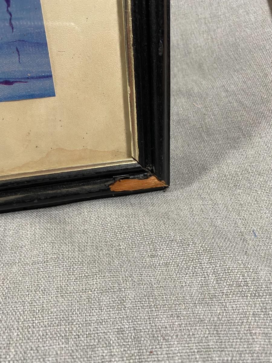 Framed ocean harbor print by Winifred Winton Smith. Looks like previous owner cut it to the current size, top edge has an irregular cut edge. Some discolor to the matting and a scuff on frame.