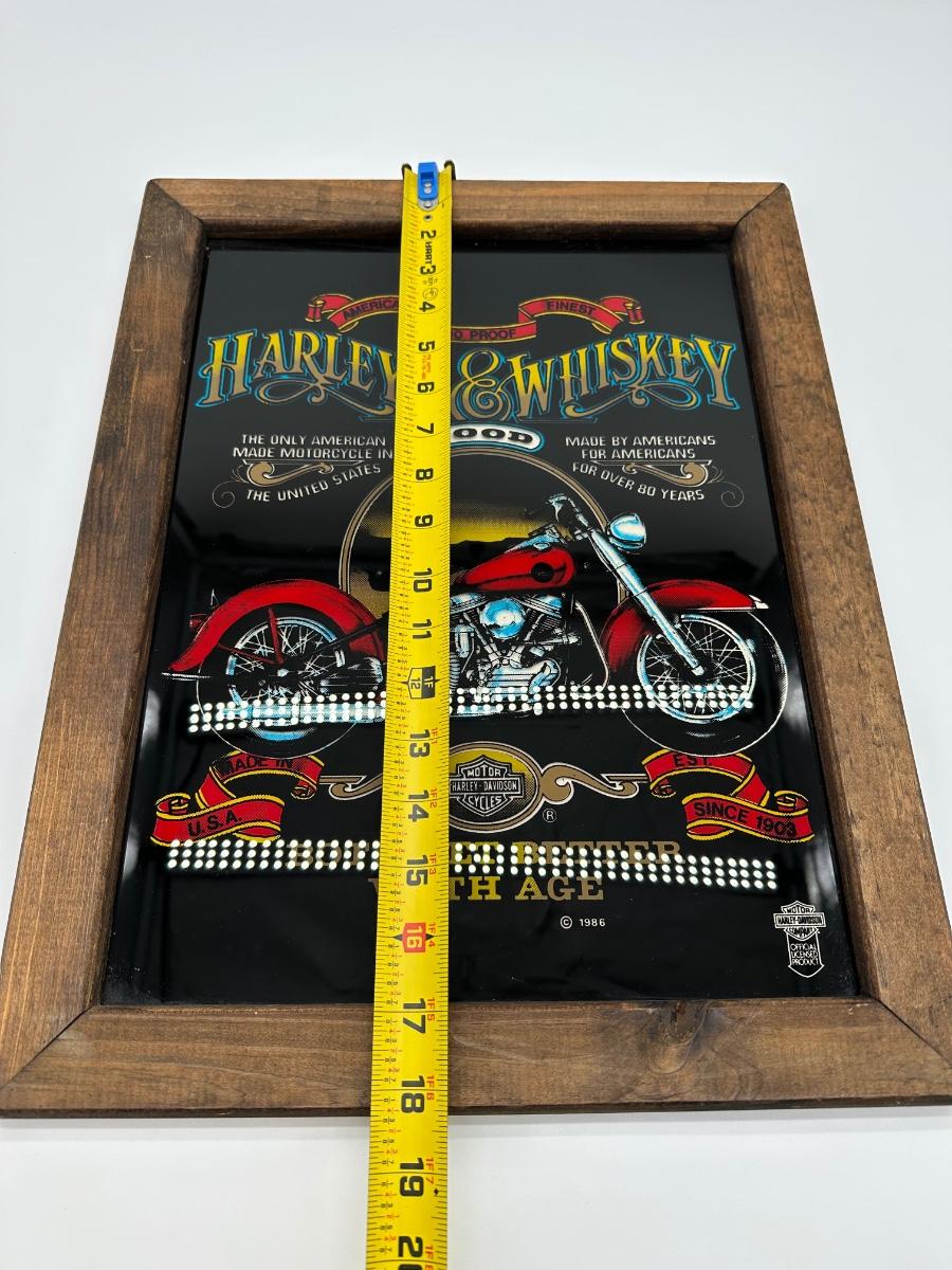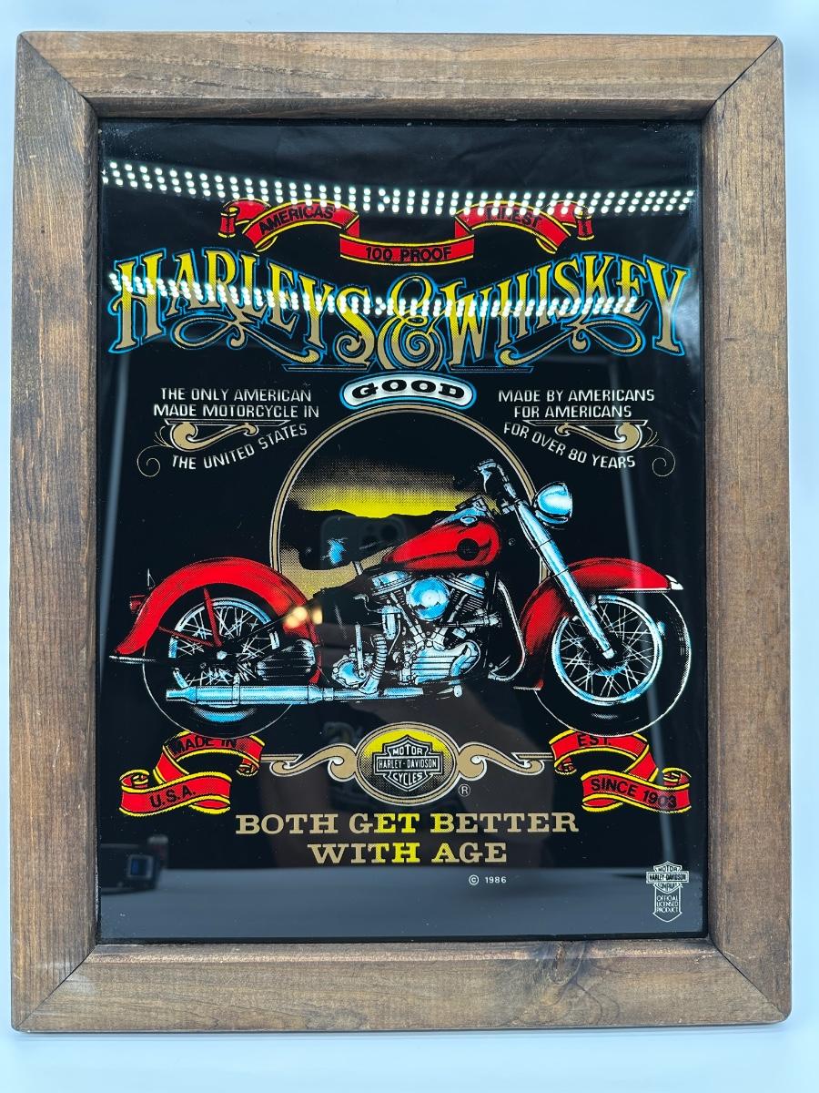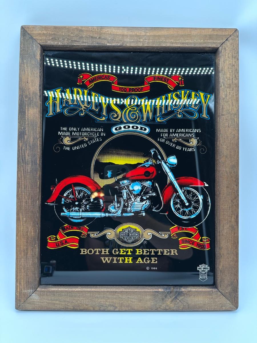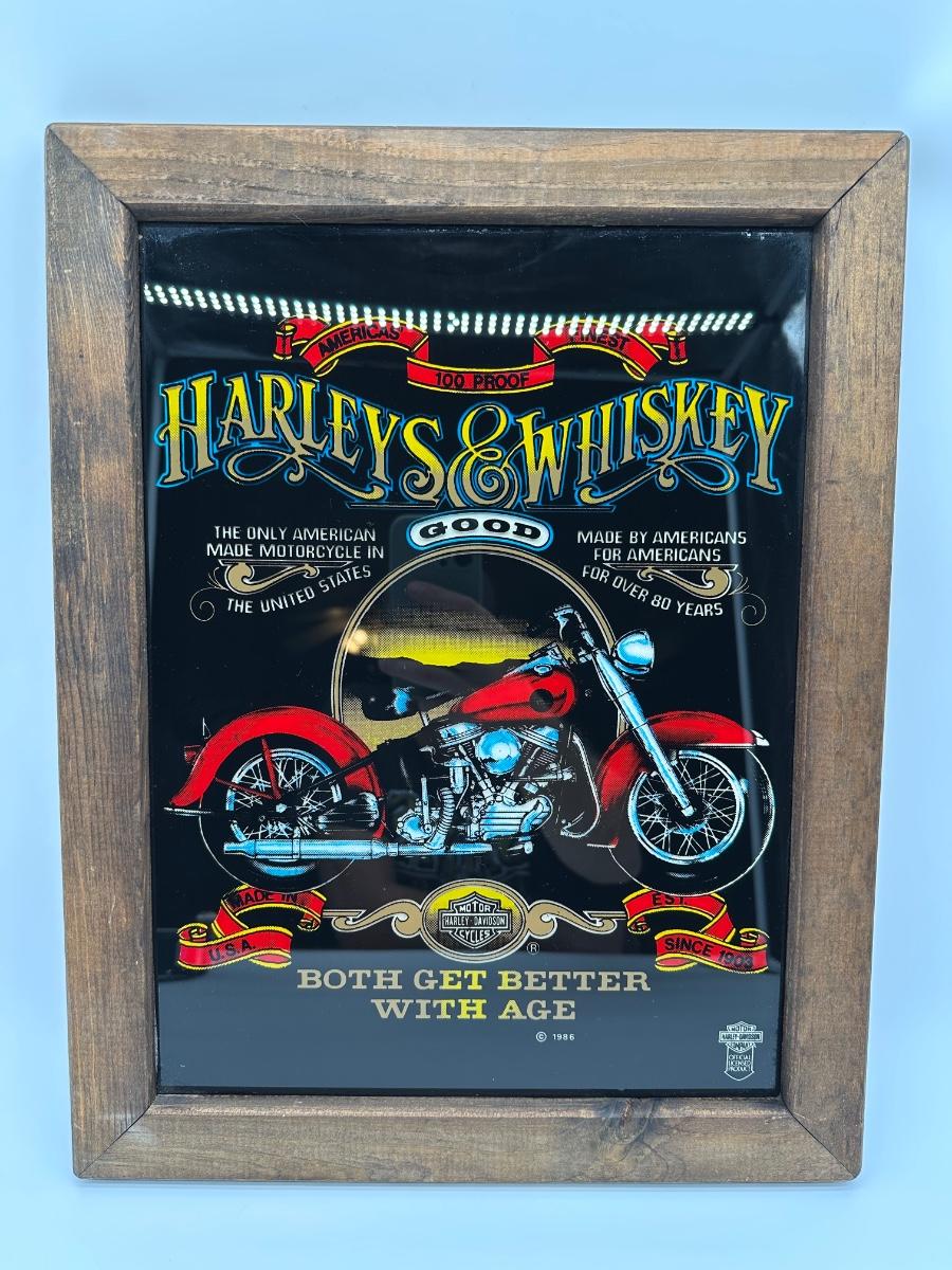 Framed Harley-Davidson glass artwork titled “Harleys & Whiskey – Both Get Better With Age”. Features classic motorcycle imagery with bold graphics, set behind glass in a rustic wood frame. Includes rear hanging hardware—ready to display in a garage, bar, man cave, or shop.