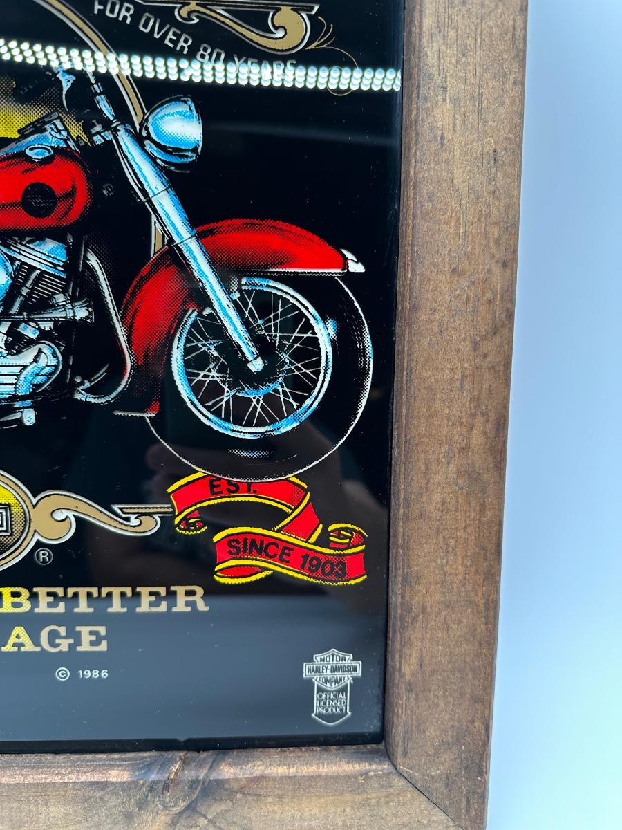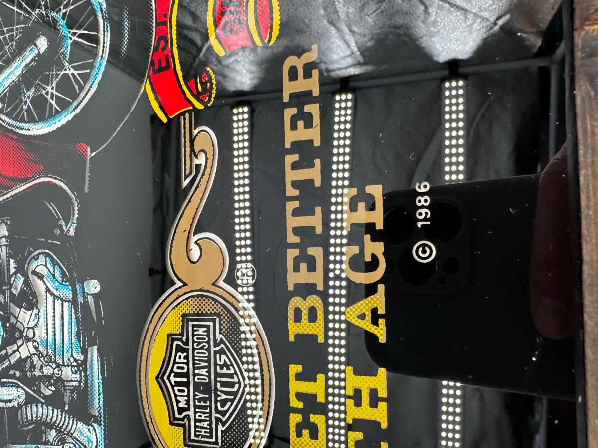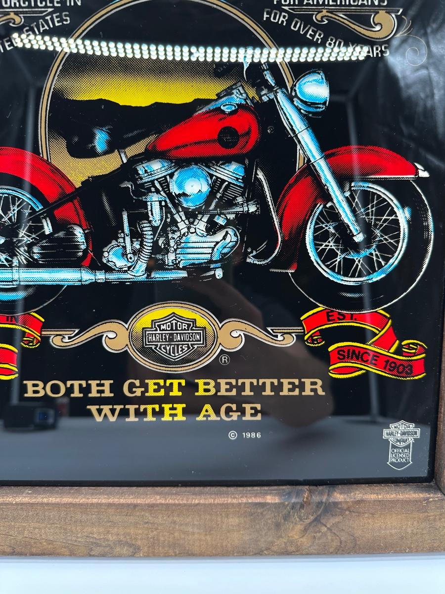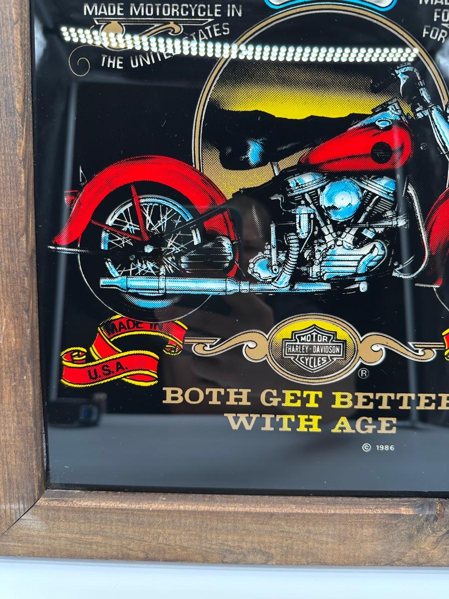 Framed Harley-Davidson glass artwork titled “Harleys & Whiskey – Both Get Better With Age”. Features classic motorcycle imagery with bold graphics, set behind glass in a rustic wood frame. Includes rear hanging hardware—ready to display in a garage, bar, man cave, or shop.