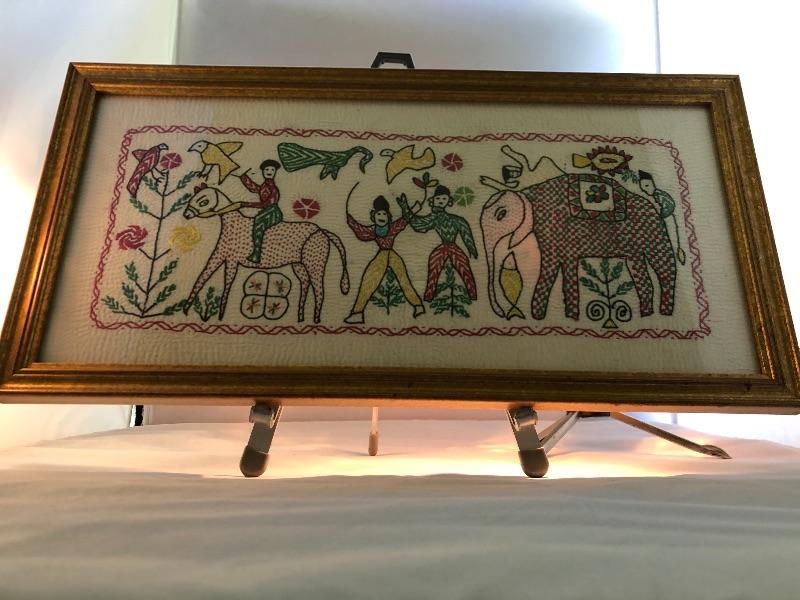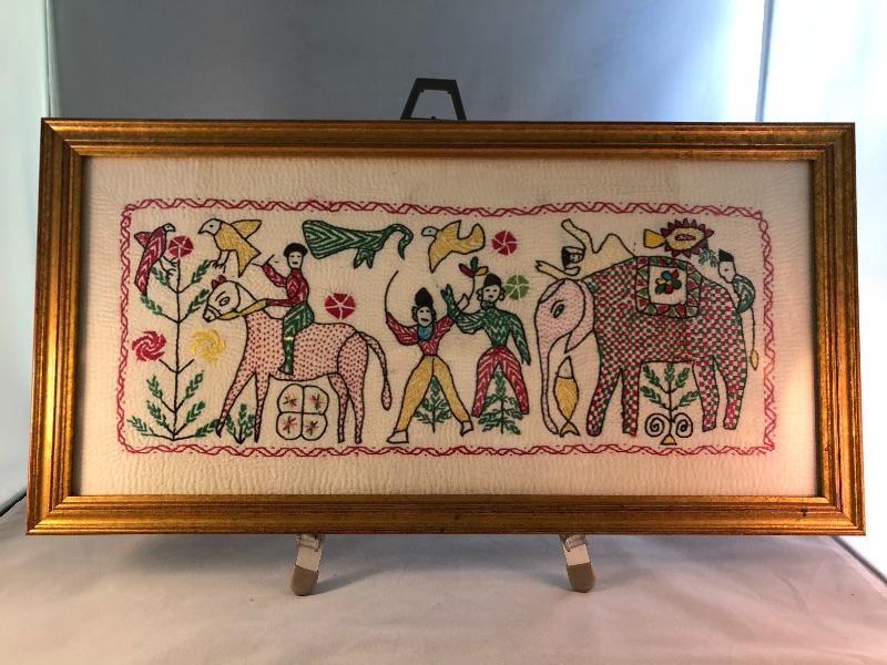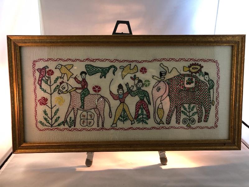 Love this whimsical embroidery. Looks like it could be done in Thailand. Nicely finished off in a gold frame. Framed it measures 19.25” X 10”.
