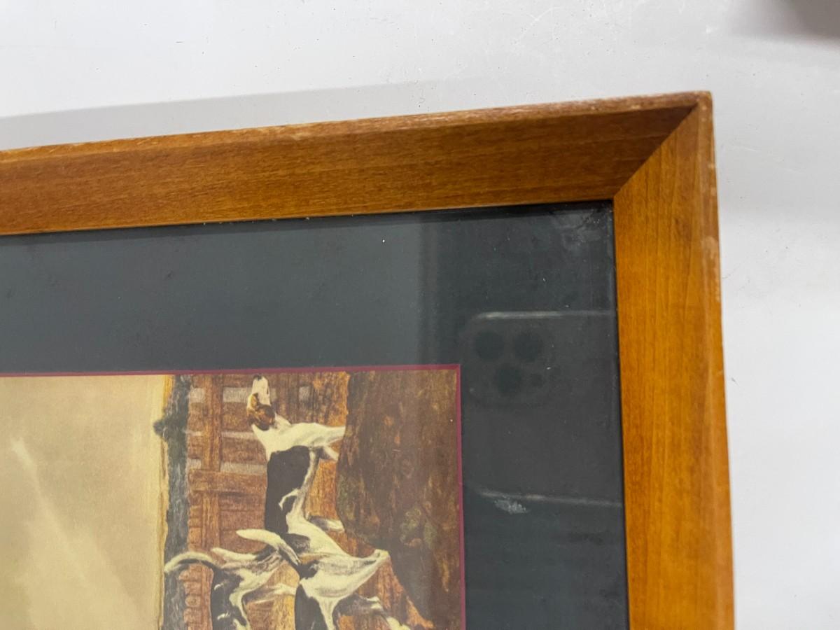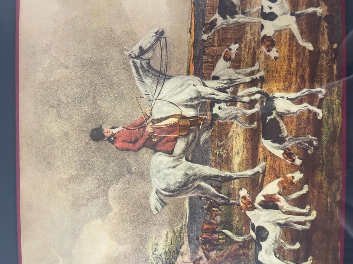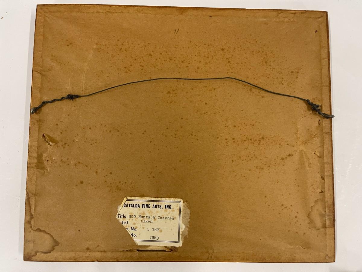 Framed hunt scene titled Hunts & Coaches, Image size: 9" x 11", Framed size: 11" x 13". Frame shows some wear. This is number 2 out of 3 we have available for auction.