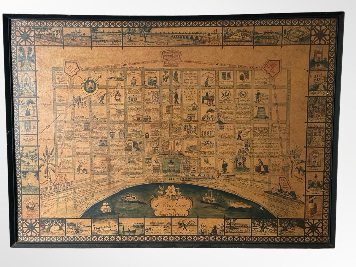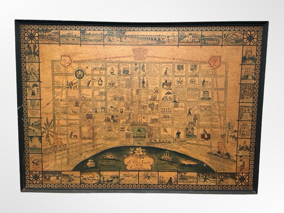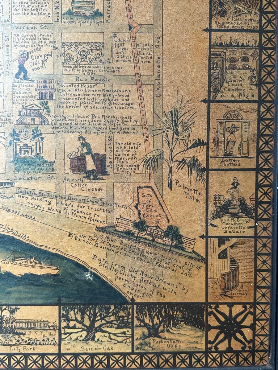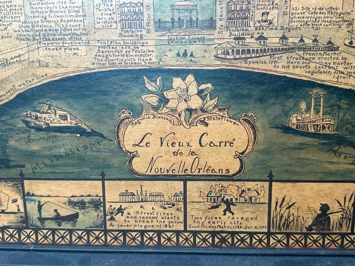 Illustrated map titled Le Vieux Carré de la Nouvelle Orleans, featuring historical locations, folklore, and local legends of the French Quarter. Mounted in a simple black wooden frame—no glass or protective covering. See age spots on surface.