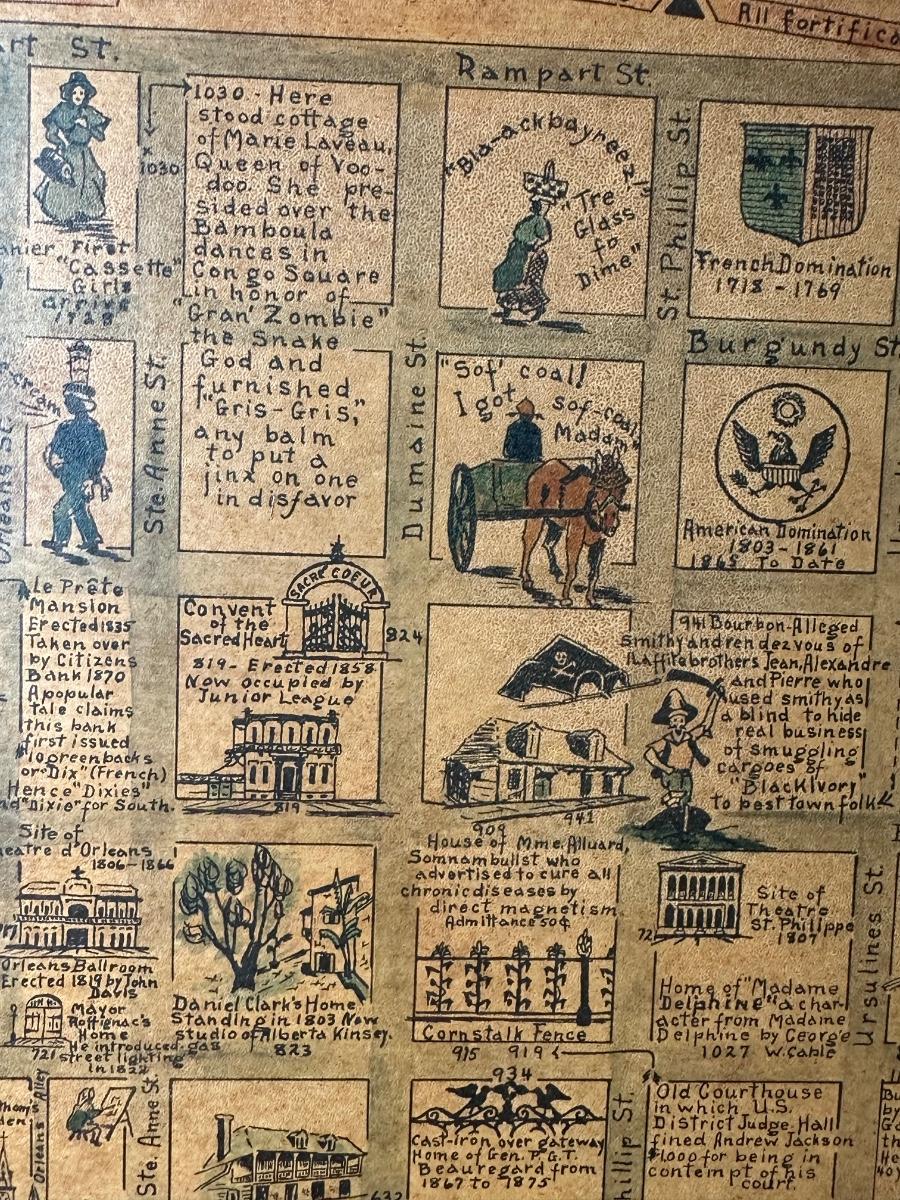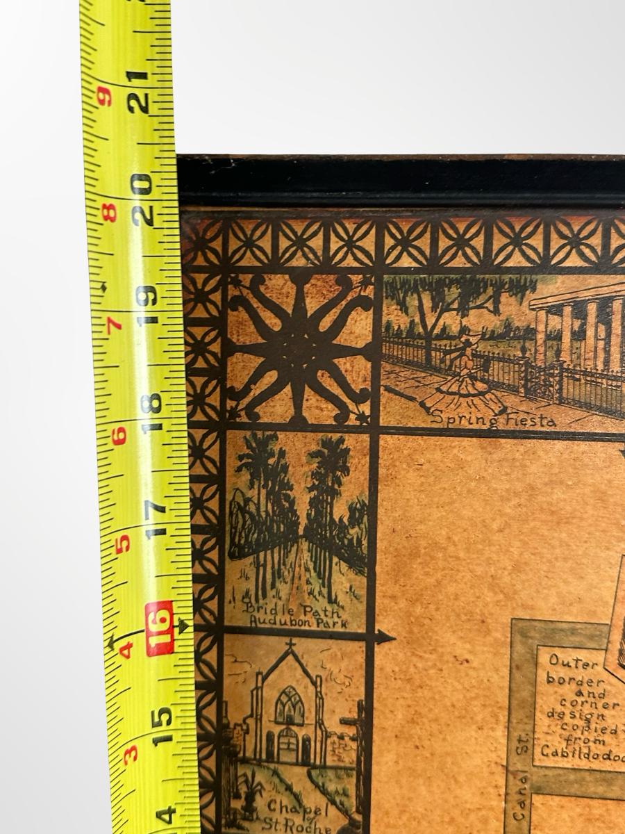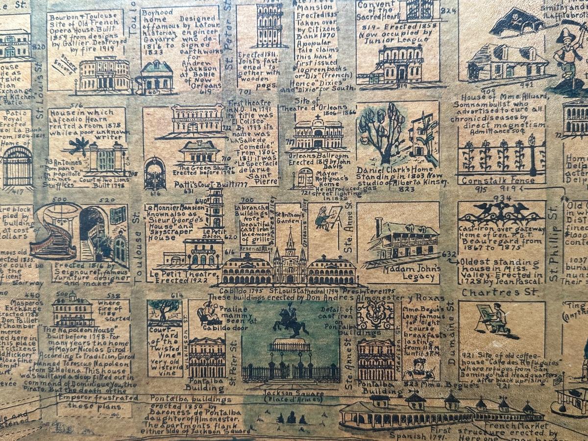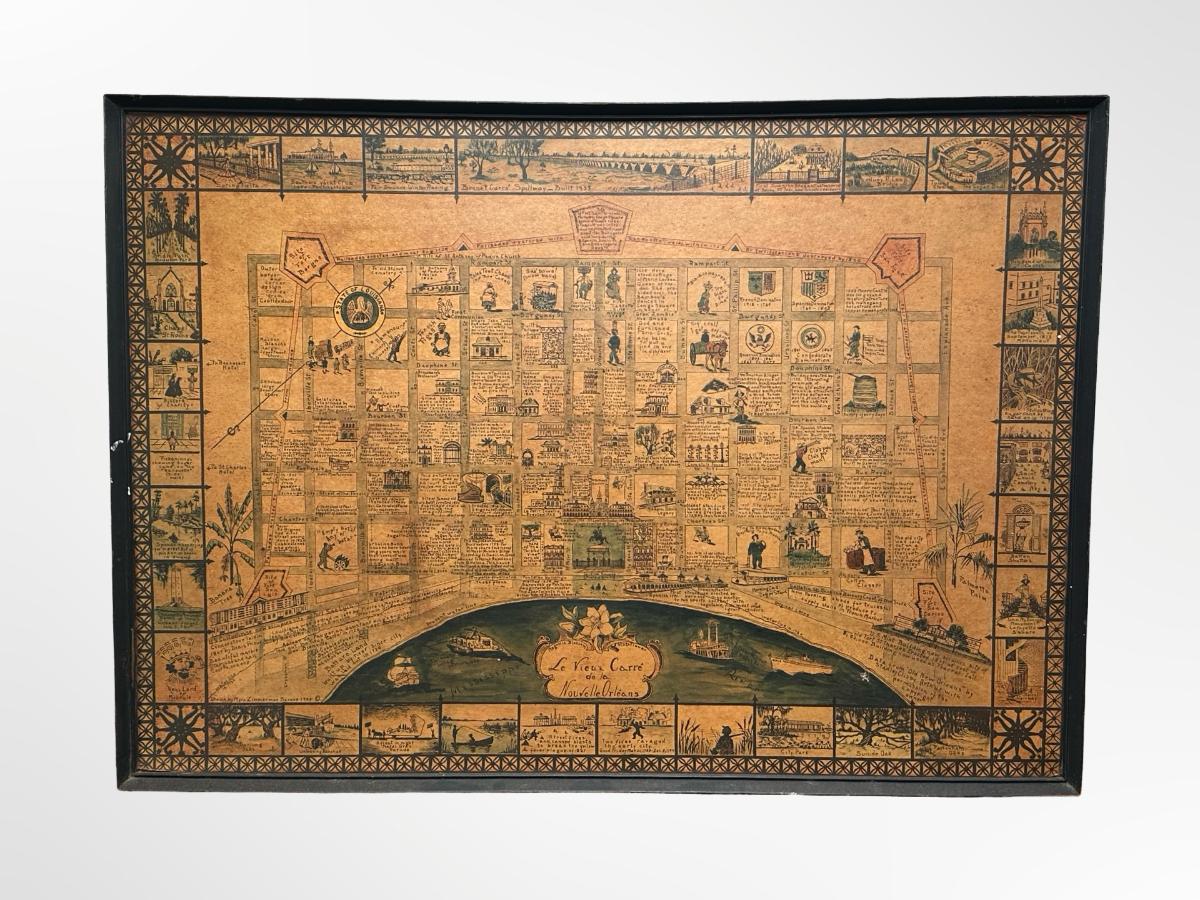 Illustrated map titled Le Vieux Carré de la Nouvelle Orleans, featuring historical locations, folklore, and local legends of the French Quarter. Mounted in a simple black wooden frame—no glass or protective covering. See age spots on surface.