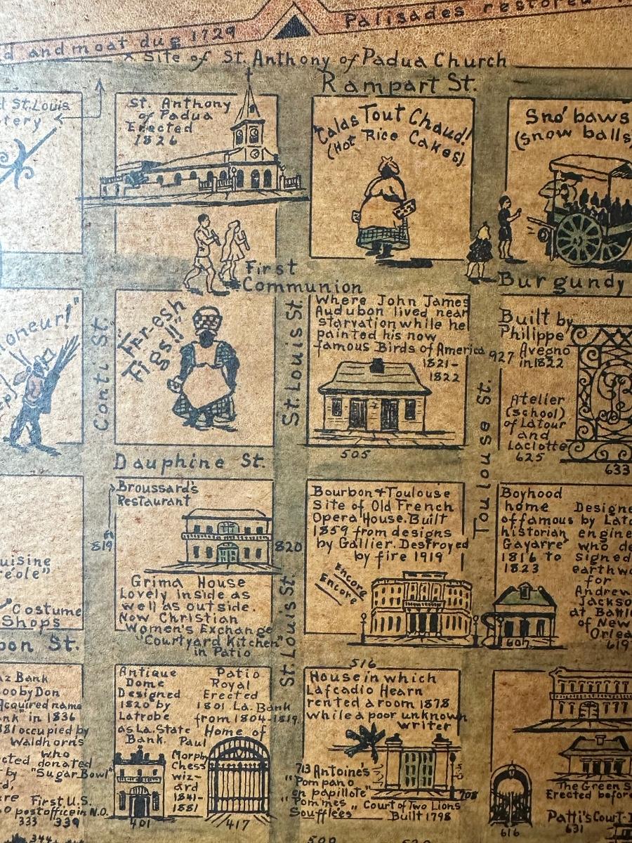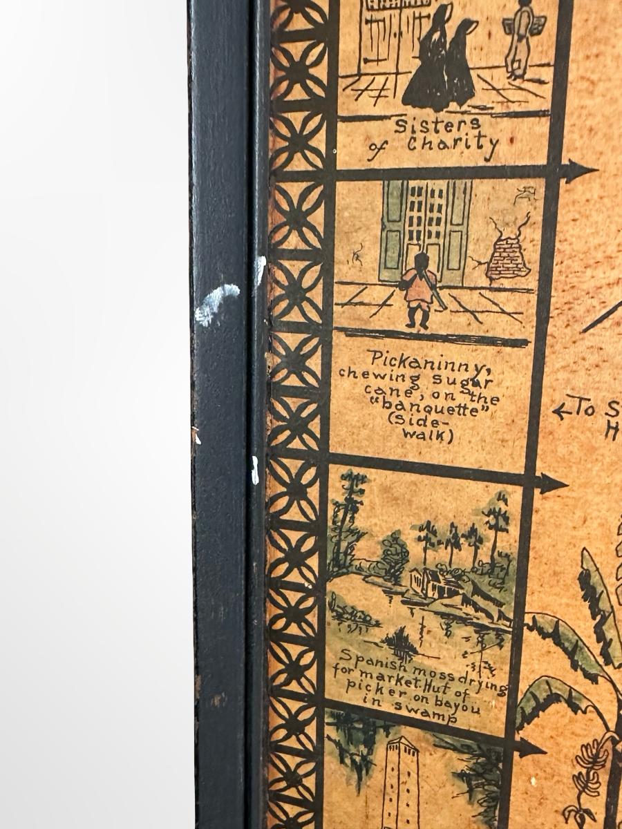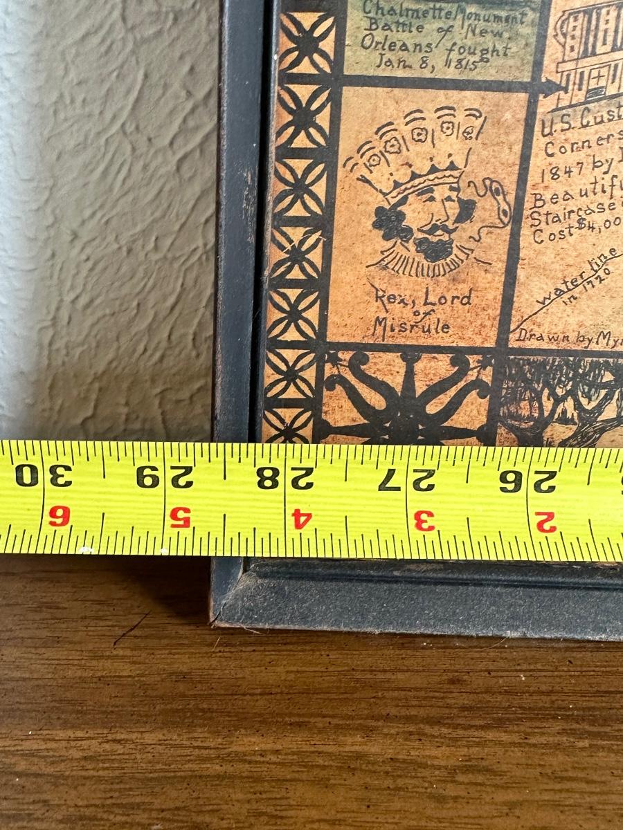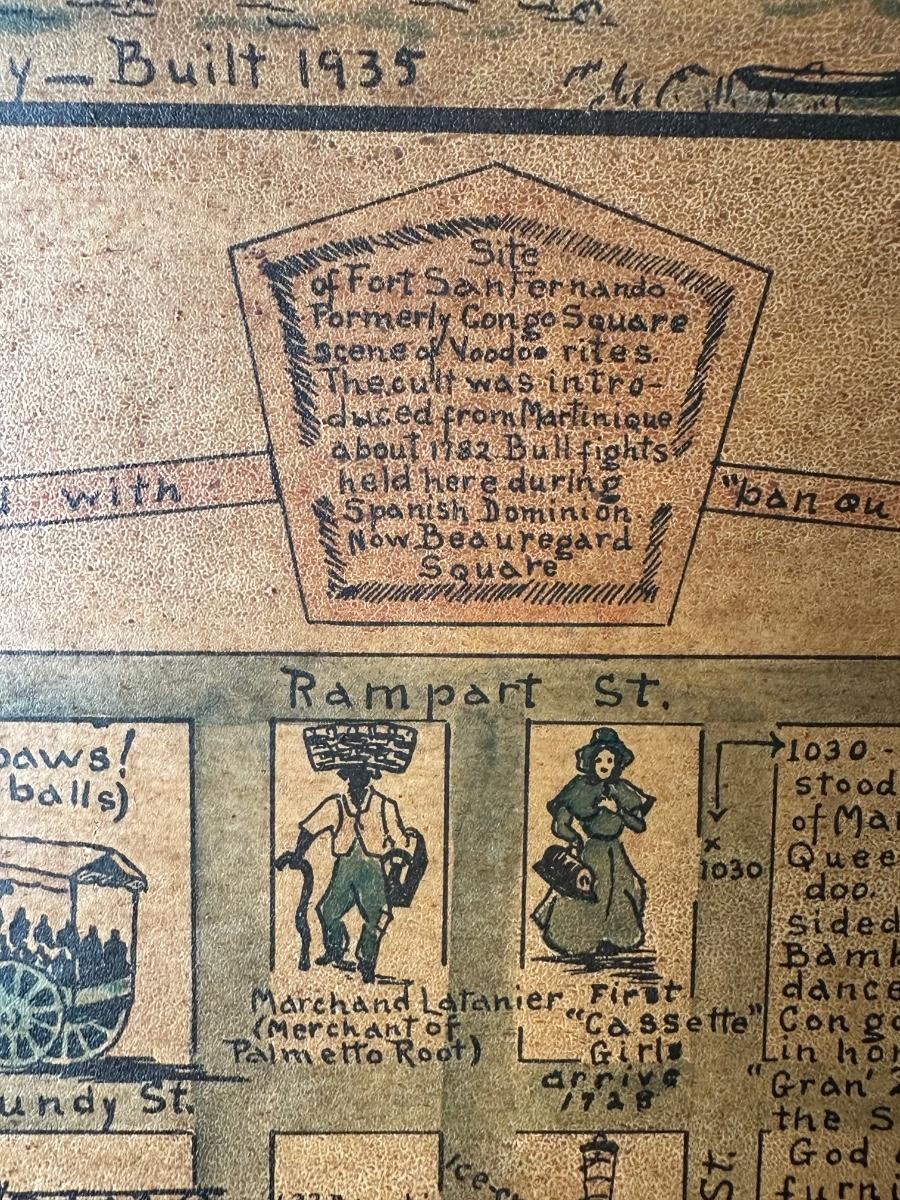 Illustrated map titled Le Vieux Carré de la Nouvelle Orleans, featuring historical locations, folklore, and local legends of the French Quarter. Mounted in a simple black wooden frame—no glass or protective covering. See age spots on surface.
