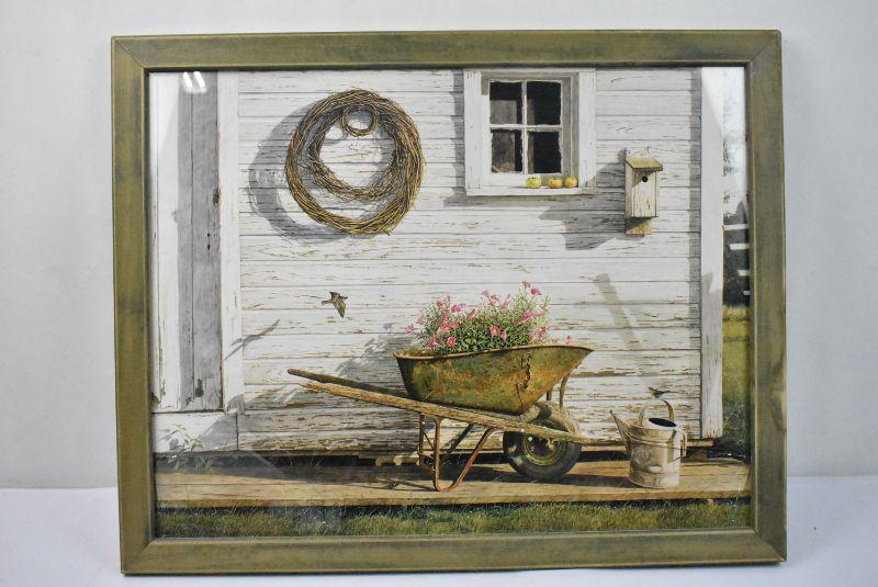 Framed Image Wheelbarrow, Flowers, Barn - Cracked Glass