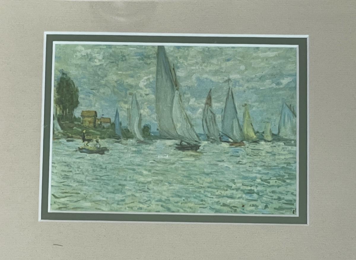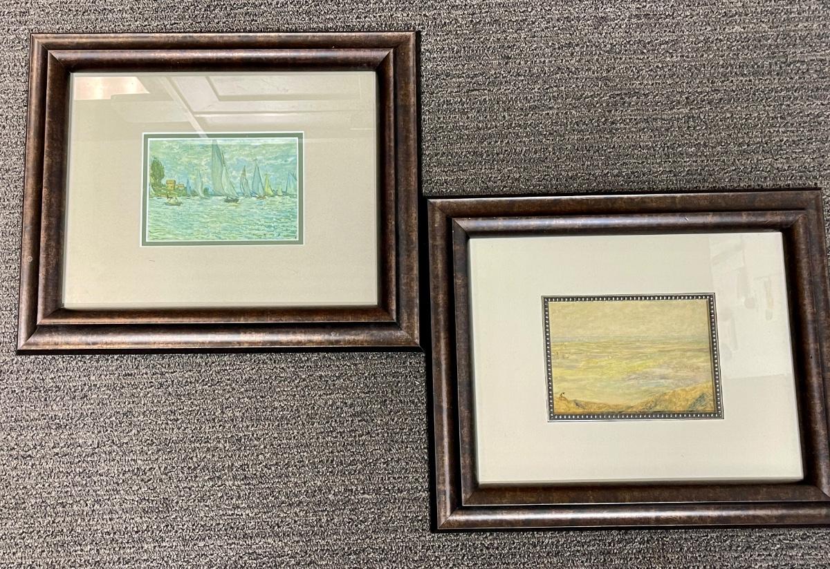 Regattas at Argenteuil by Claude Monet 1874 and Seashore at Guernsey 1883 - Pierre Auguste Renoir. Both prints are matted and framed. Artworks are approx. 5" x 7", frames measure approx. 14" x 17". Good condition.