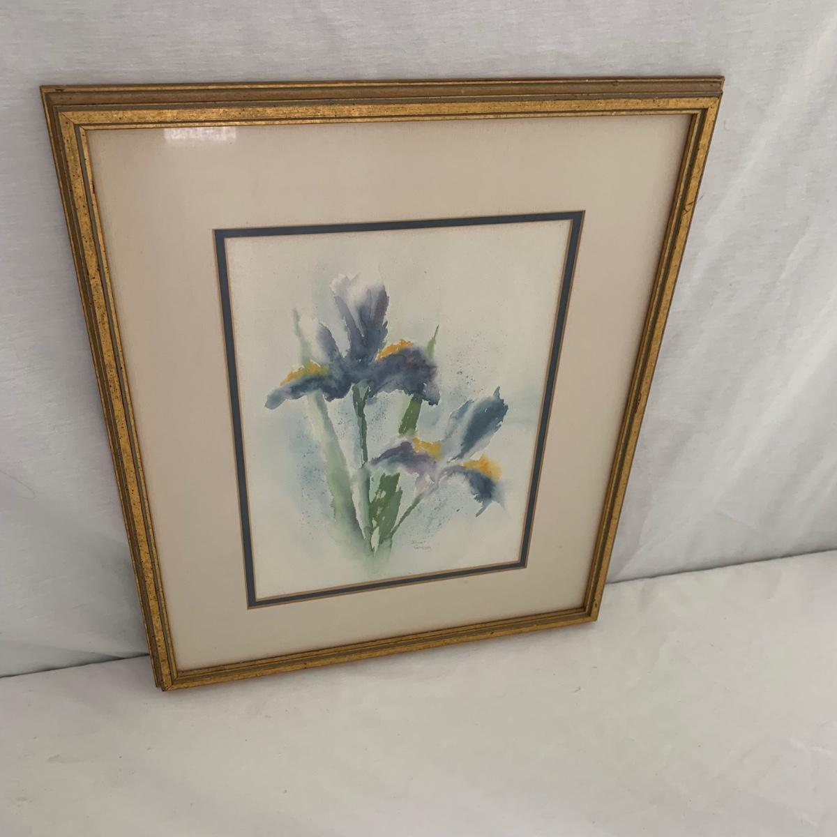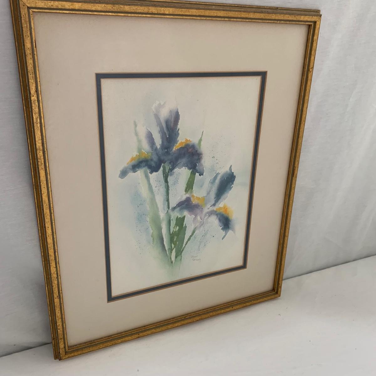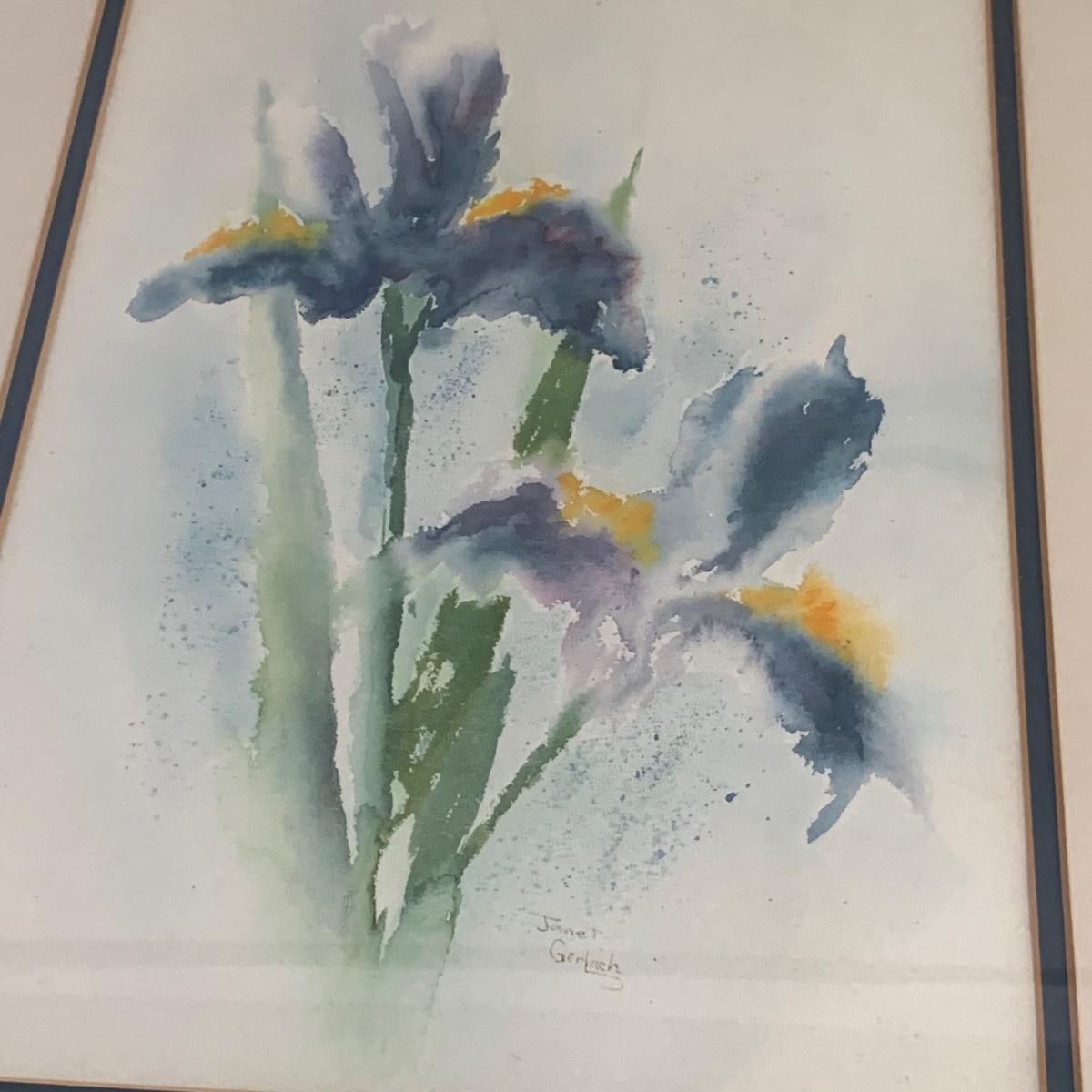Framed watercolor painting of irises, signed by Janet Gerlach. Art appears to be original. It’s framed behind glass in a wood frame that is metallic gold colored and measures 16” x 19.5”.