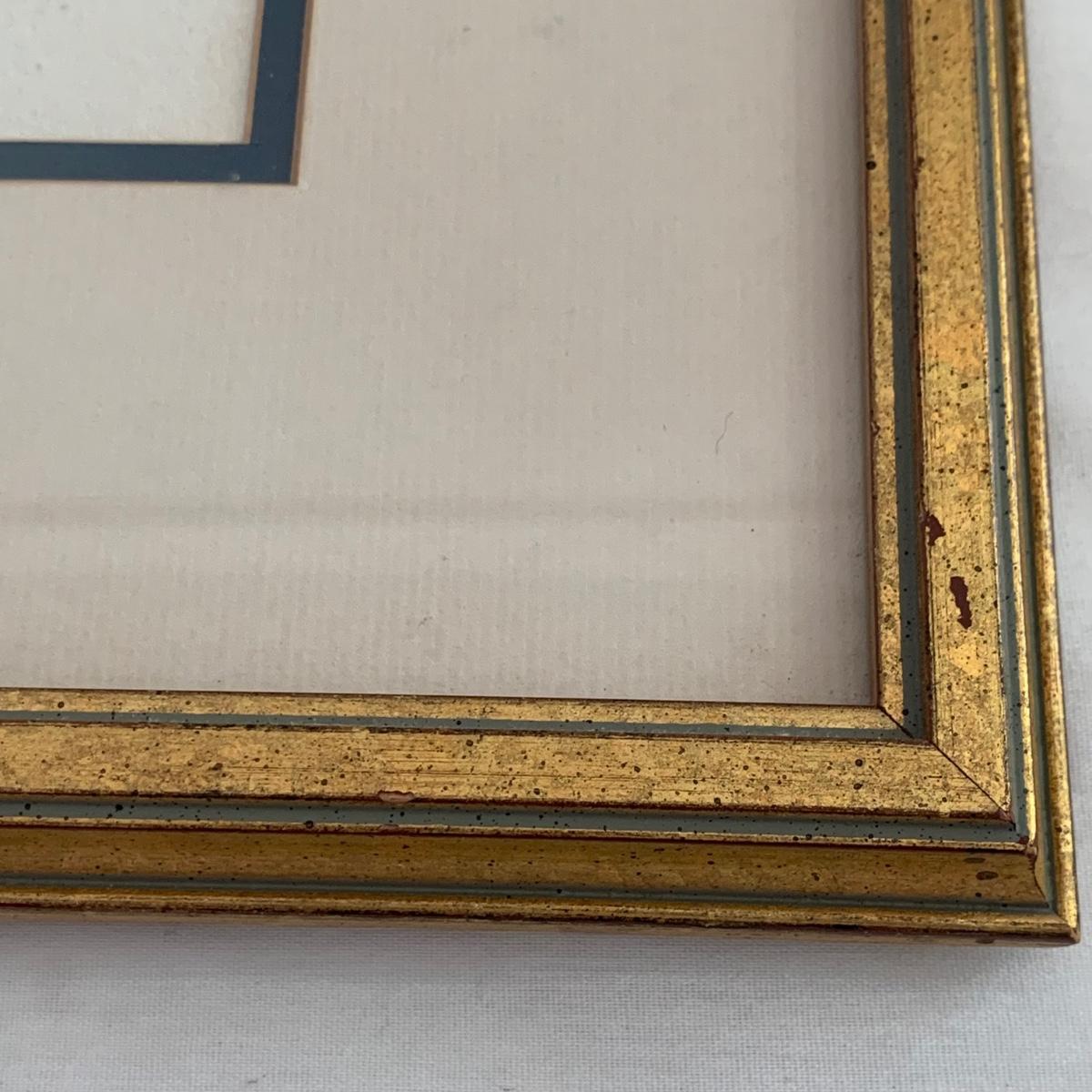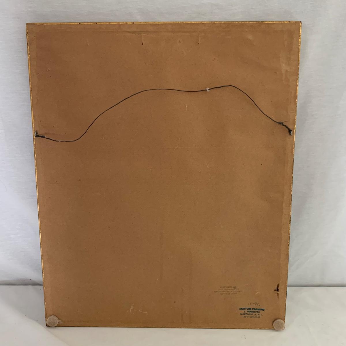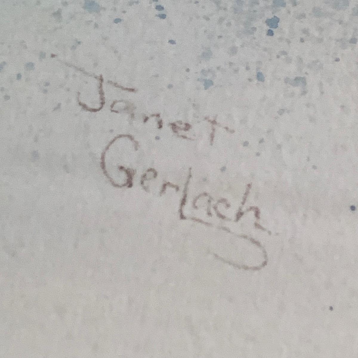 Framed watercolor painting of irises, signed by Janet Gerlach. Art appears to be original. It’s framed behind glass in a wood frame that is metallic gold colored and measures 16” x 19.5”.