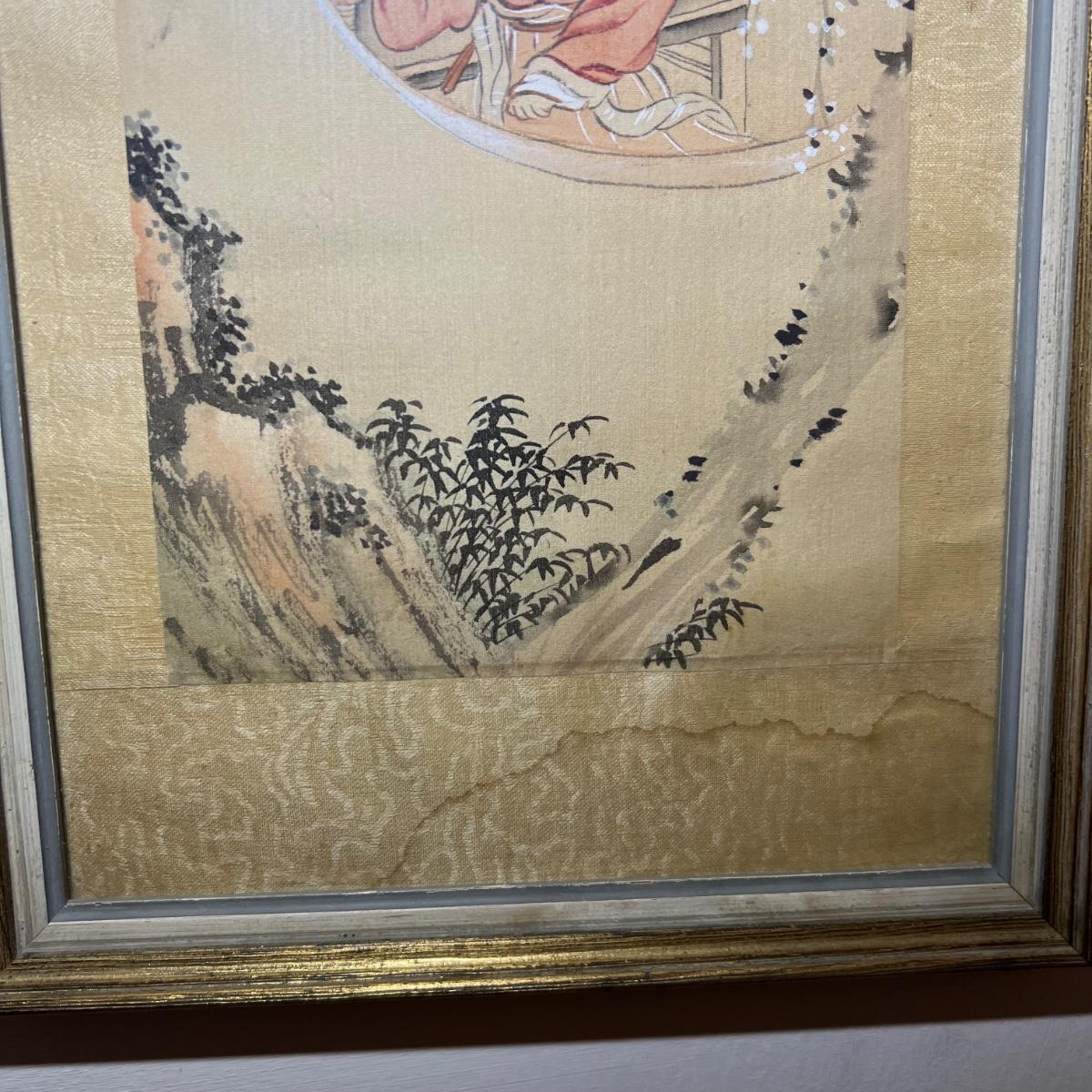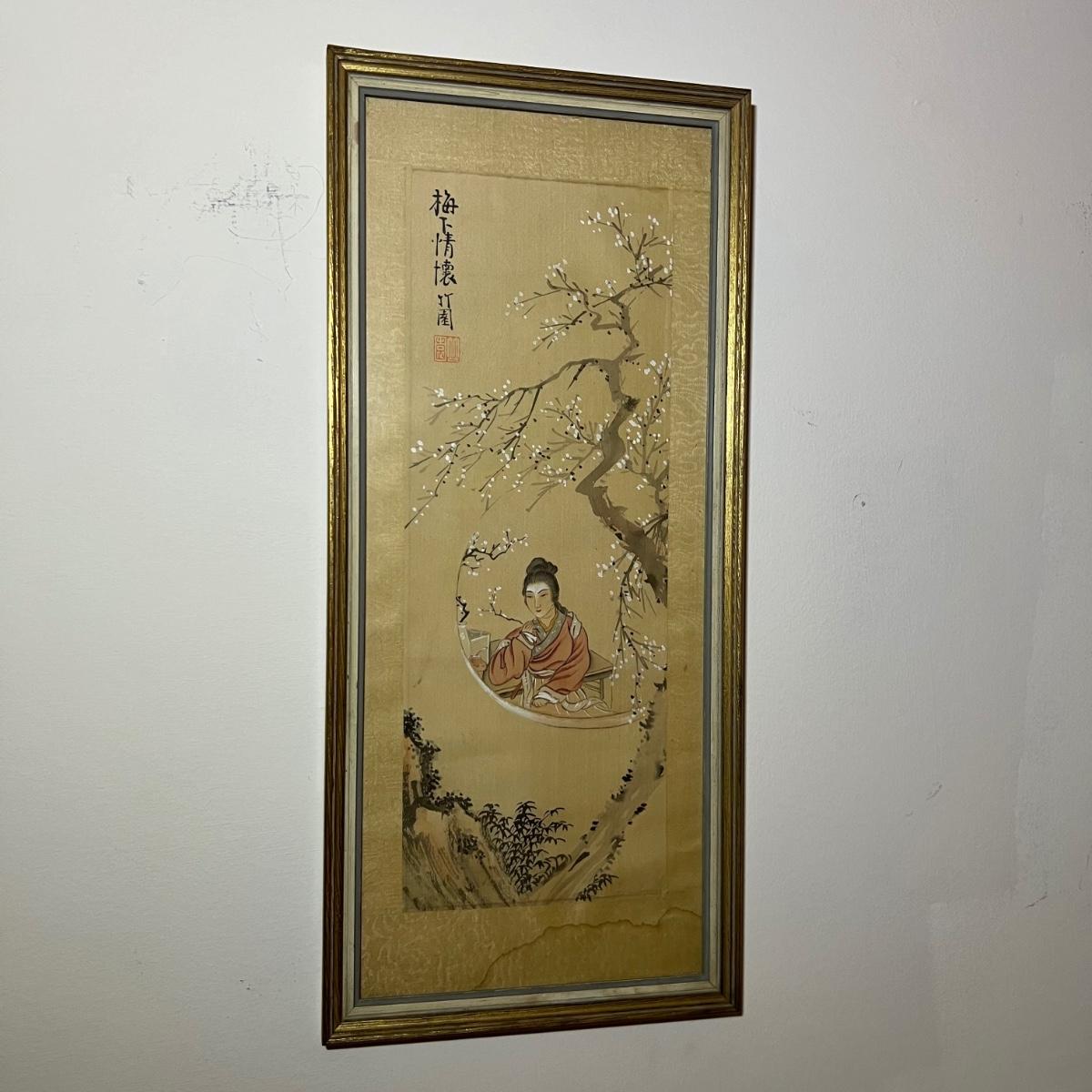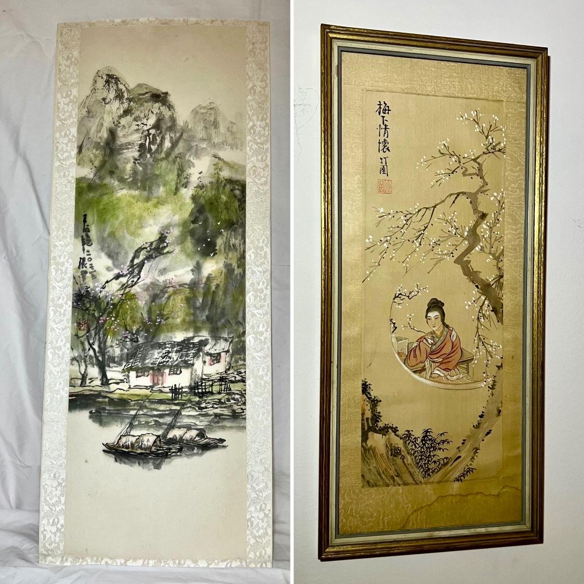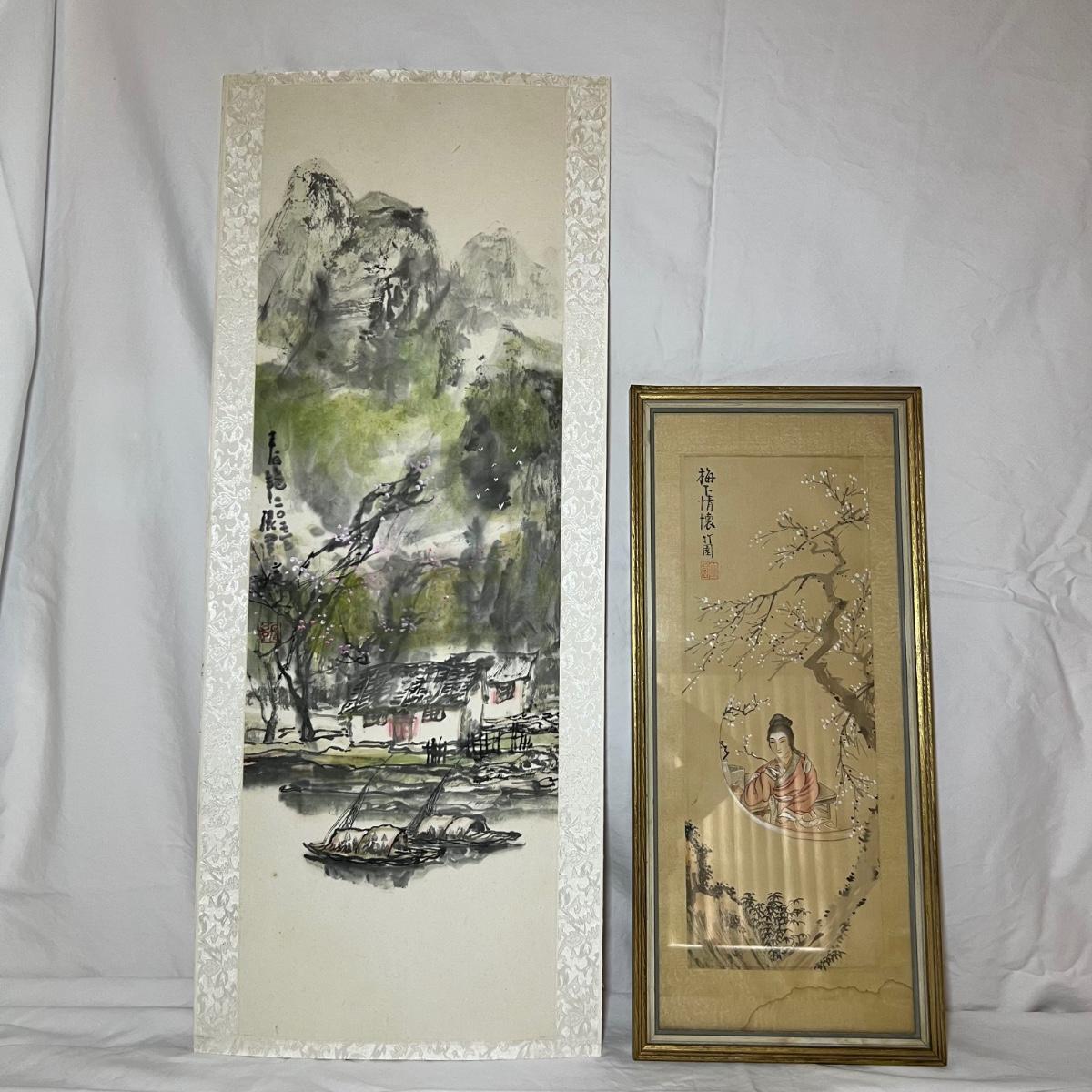 Two pieces of Asian art. The framed piece appears to be a silk painting of a woman. It is under glass in a gilded wood frame that measures 9” x 20.5”H. Please note the silk matting has a noticeable stain, see image. The other piece of art appears to be a watercolor and possibly mixed media, that is on paper that has been mounted onto board with a silk like border; there is a small dirt mark on this piece, see image and it is not under glass.