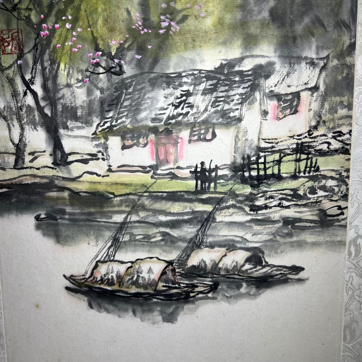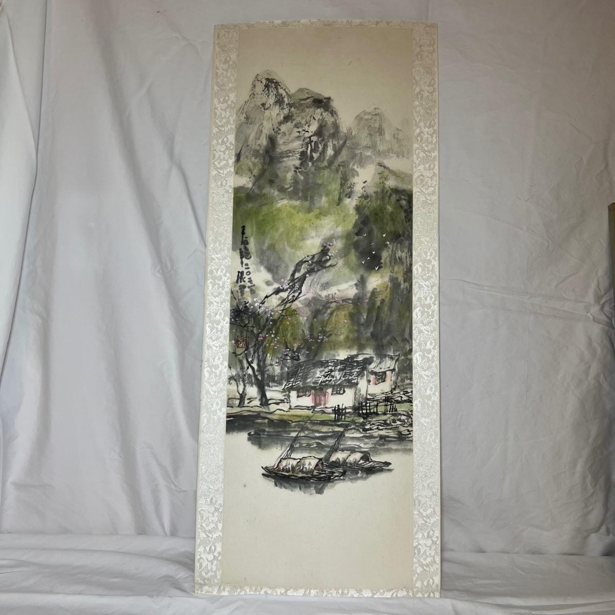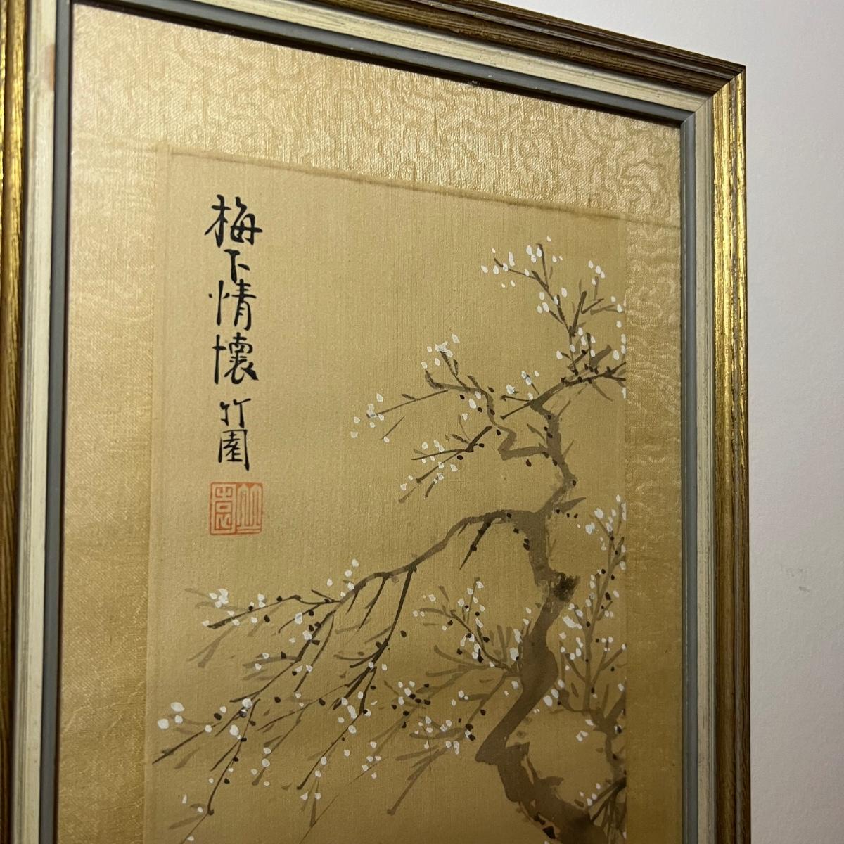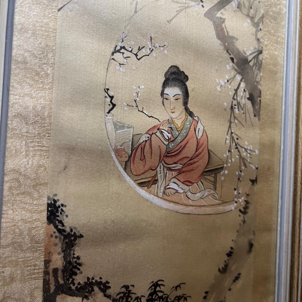 Two pieces of Asian art. The framed piece appears to be a silk painting of a woman. It is under glass in a gilded wood frame that measures 9” x 20.5”H. Please note the silk matting has a noticeable stain, see image. The other piece of art appears to be a watercolor and possibly mixed media, that is on paper that has been mounted onto board with a silk like border; there is a small dirt mark on this piece, see image and it is not under glass.