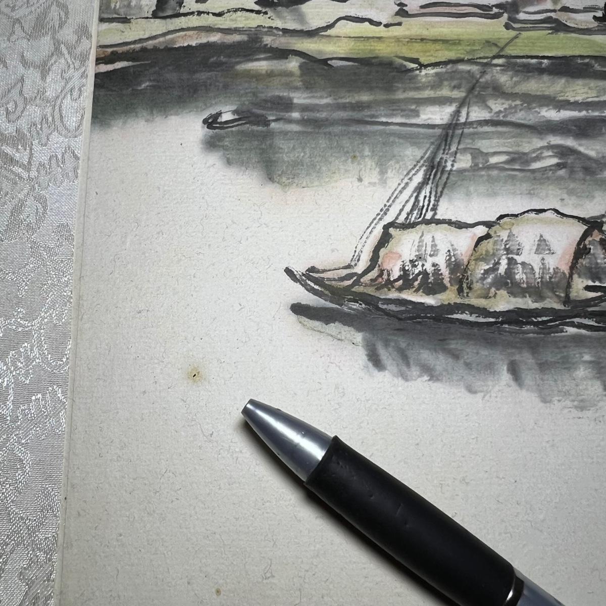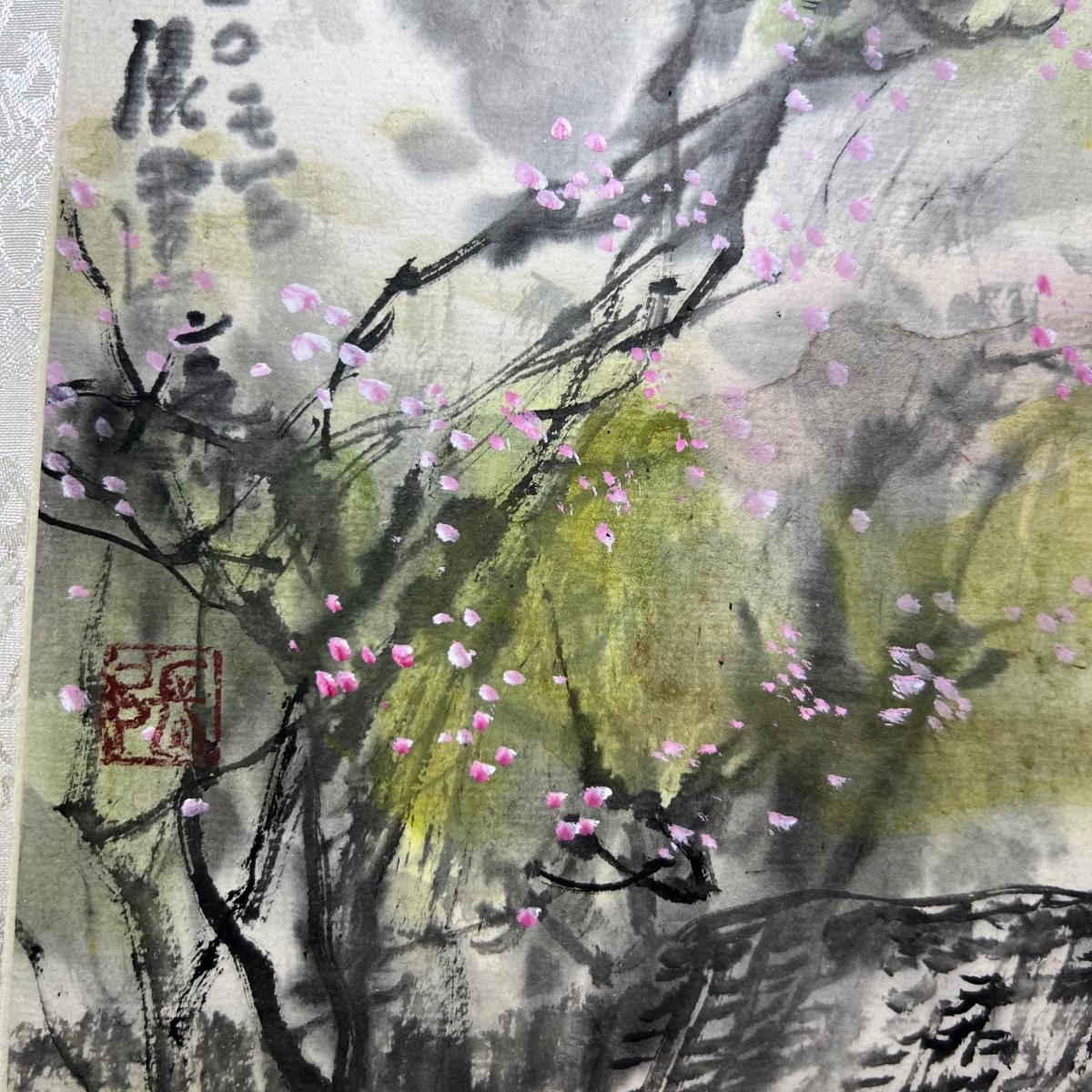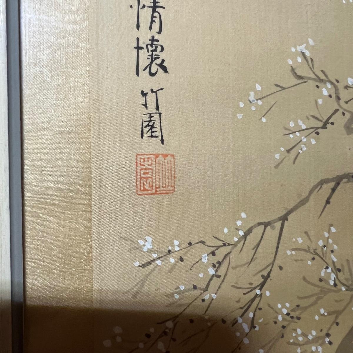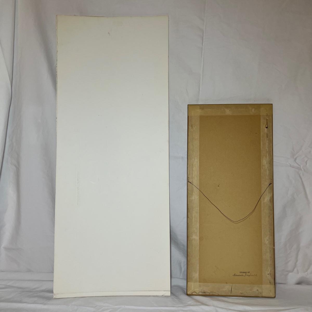 Two pieces of Asian art. The framed piece appears to be a silk painting of a woman. It is under glass in a gilded wood frame that measures 9” x 20.5”H. Please note the silk matting has a noticeable stain, see image. The other piece of art appears to be a watercolor and possibly mixed media, that is on paper that has been mounted onto board with a silk like border; there is a small dirt mark on this piece, see image and it is not under glass.