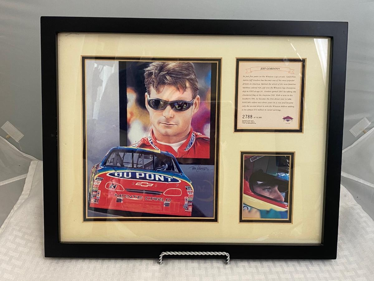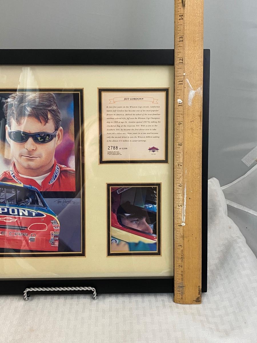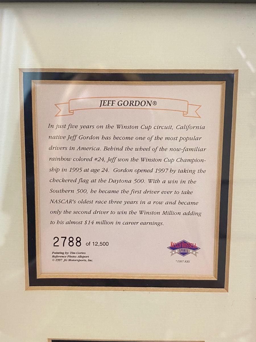Retired NASCAR driver Jeff Gordon #24 Dupont car framed art and bio card from Kelly Russel Sports. Art by Tim Cortes. In good condition.