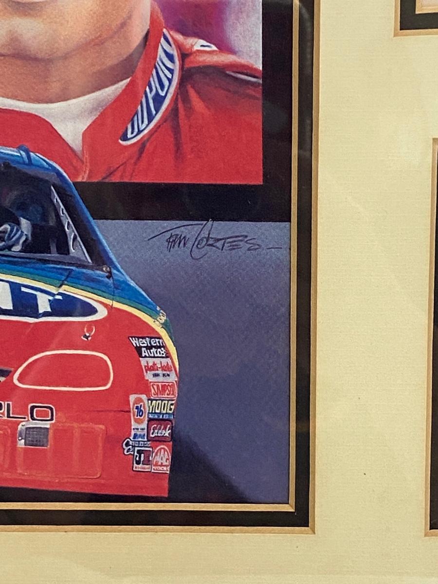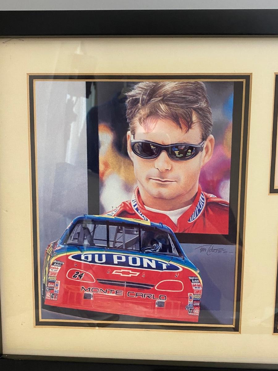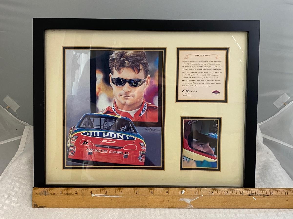 Retired NASCAR driver Jeff Gordon #24 Dupont car framed art and bio card from Kelly Russel Sports. Art by Tim Cortes. In good condition.