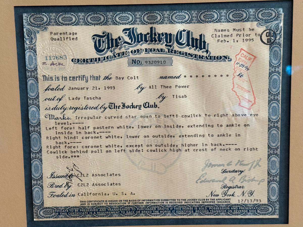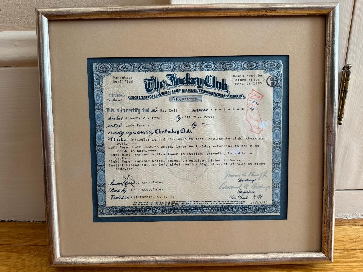 Framed Jockey Club Certificate, 1995, 14.5” W x 12.5” T